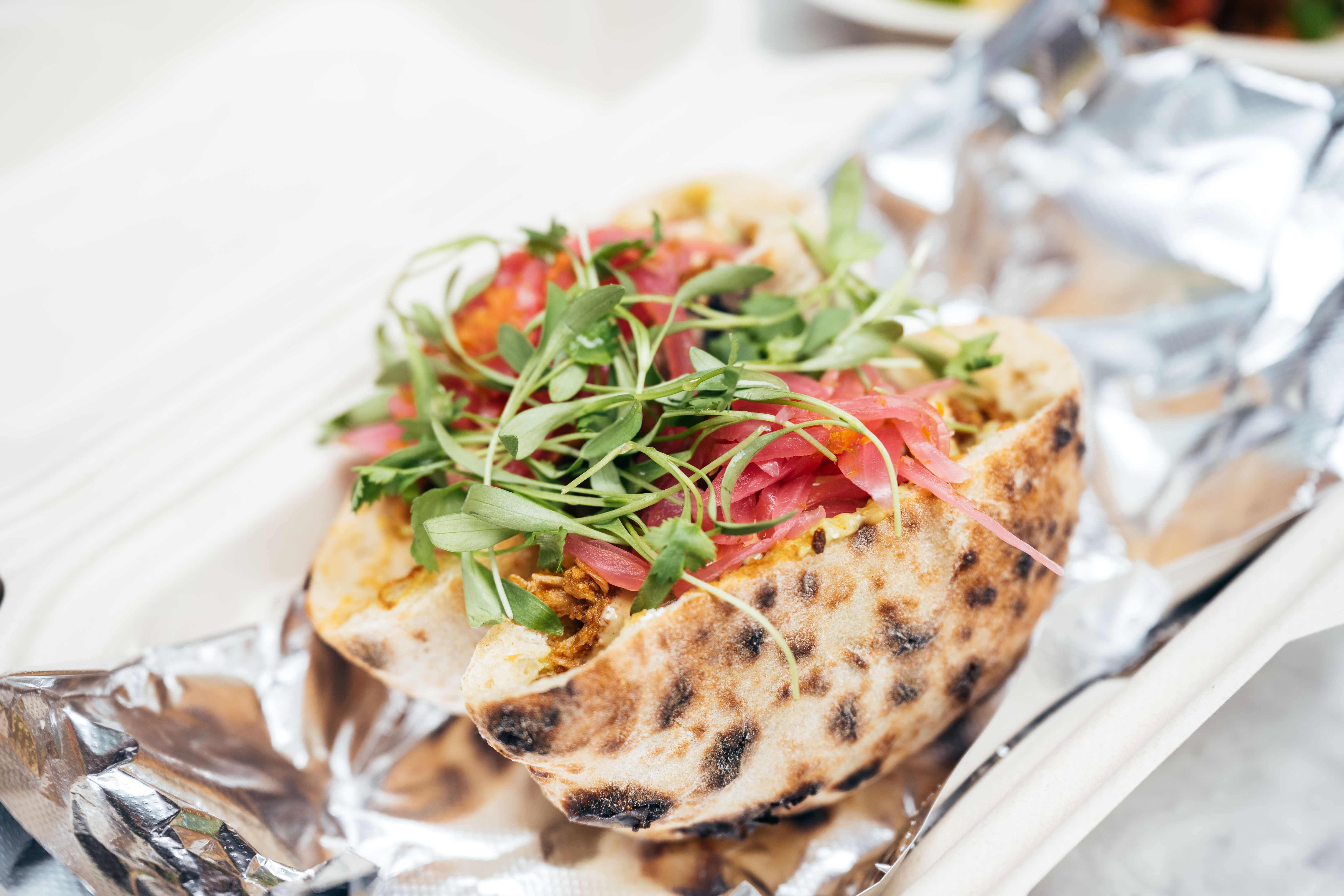 They also run on philosophy — an outcropping of de Leon’s and Whitakers shared interest in running a zero-waste kitchen. Bruto has been grain-focused since day one, with the Noble Grain Alliance further defining the mission. Drawing early inspiration from The Noma Guide to Fermentation, de Leon has been orchestrating his kitchens in a similar way since his time at Taft Diaz — the fine dining restaurant he helped to open in El Paso’s Stanton House boutique hotel. He may also have picked up a thing or two while staging at Pujol. “We have a ‘why’ and a ‘how’ to why we do things. We don’t cook food to be cool. It either does something to you or something for you,” said de Leon.