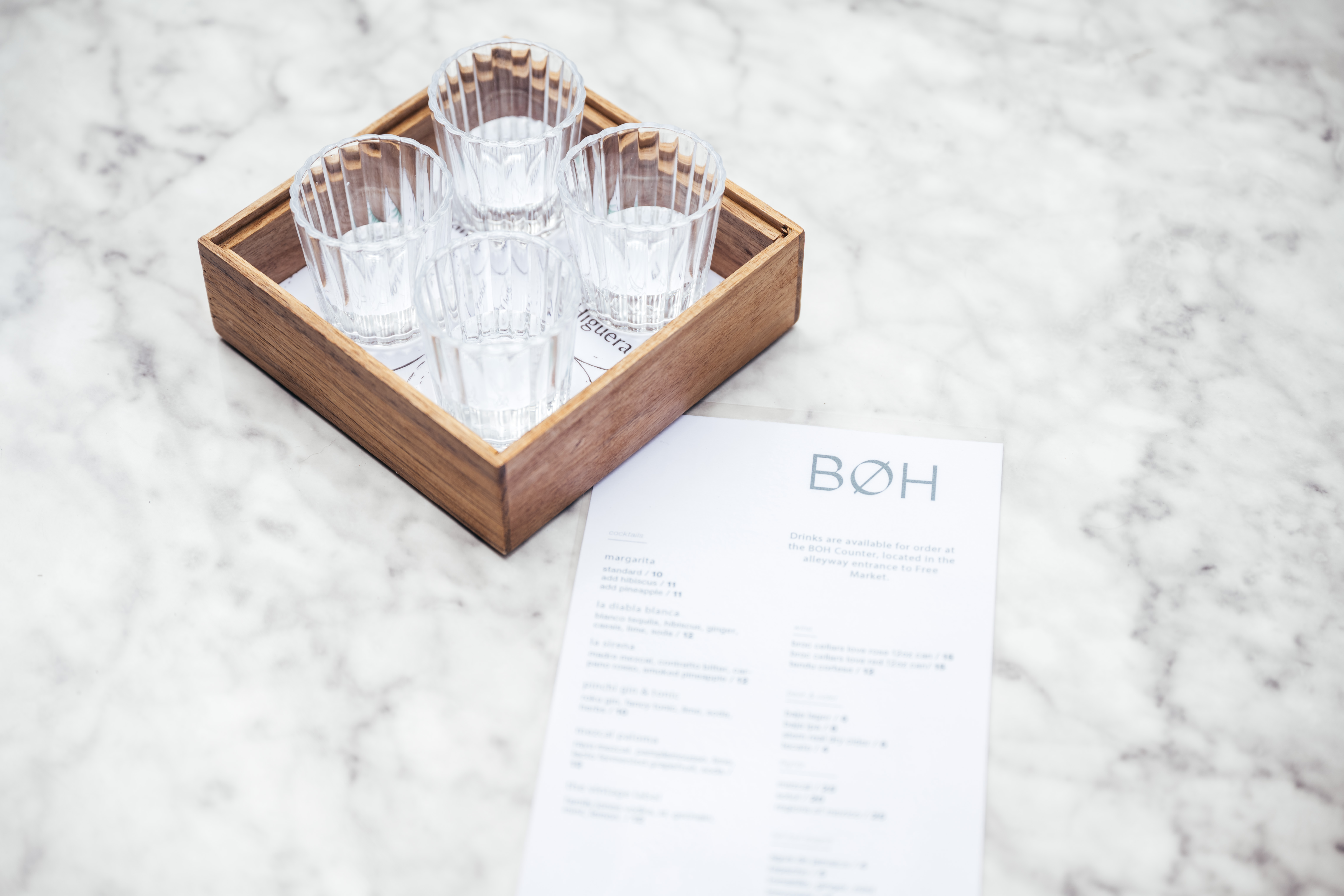 But that’s only half the story. There’s also BOH — which stands for “back of house” — that serves tacos and mezcal from a counter in the alley behind Free Market — the same counter that was most recently Run for the Roses‘ pivot liquor store. BOH is a more casual appendage, though just past the botanically-inclined entryway lies a short but impressive list of tacos, tortas, tostadas and oysters with cocktails and a brilliantly curated selection of mezcals, sotols, raicillas and tequilas from bar lead Andrew Booth. Booth is a key player — though a look under the hood would reveal a staff, one that has grown from four to 14 in the last half-year, that is full of nothing but top-tier performers.