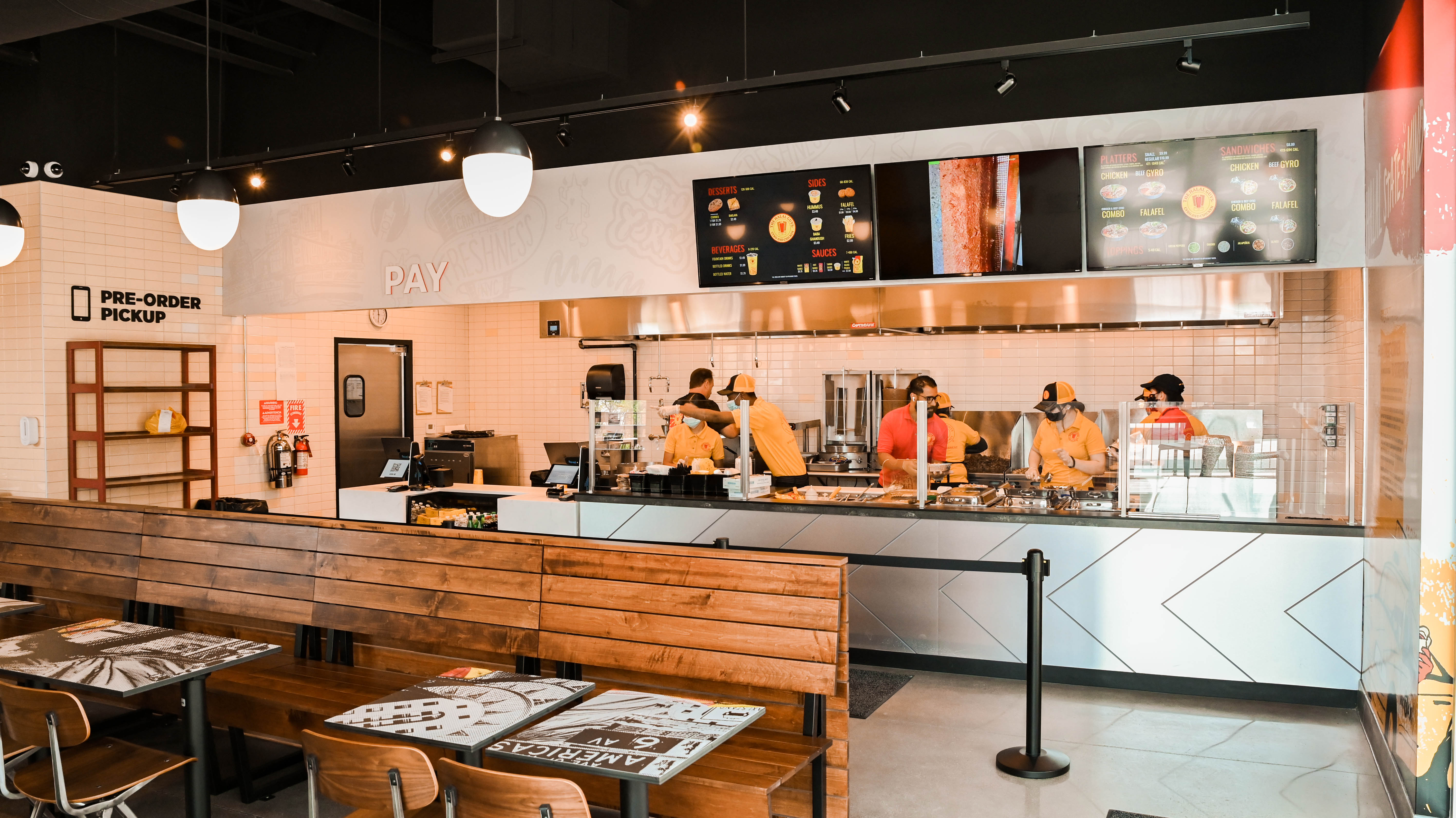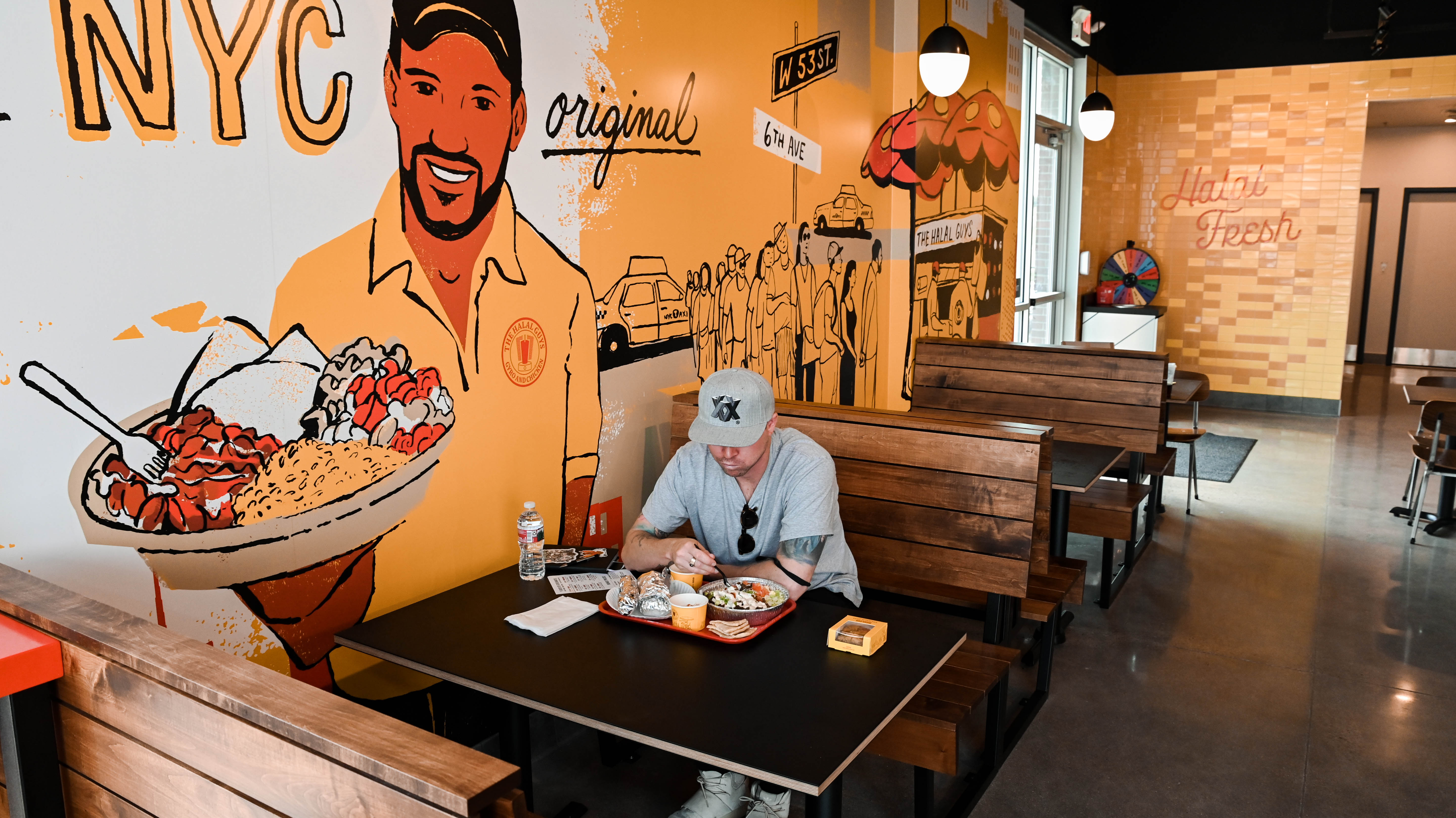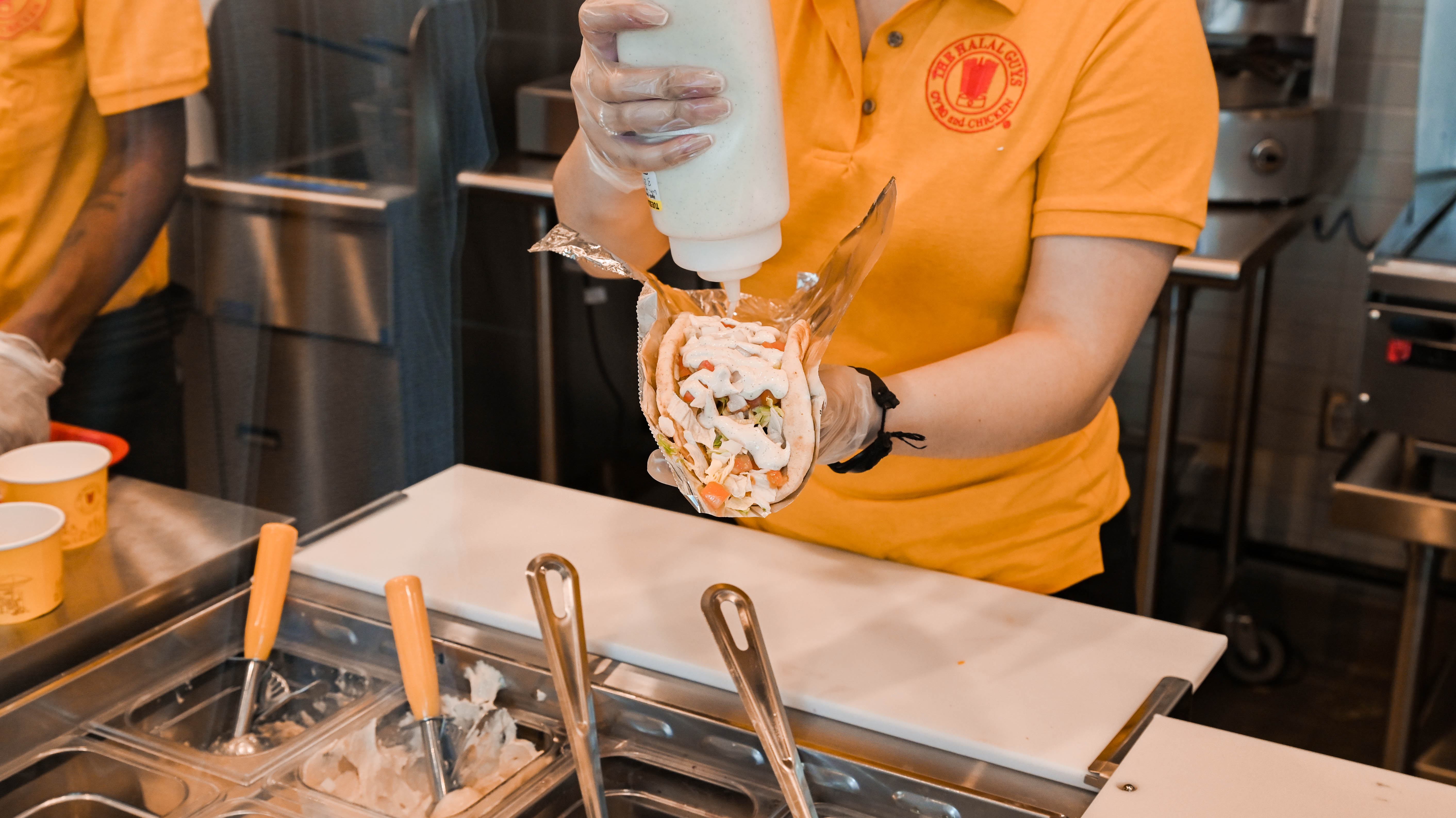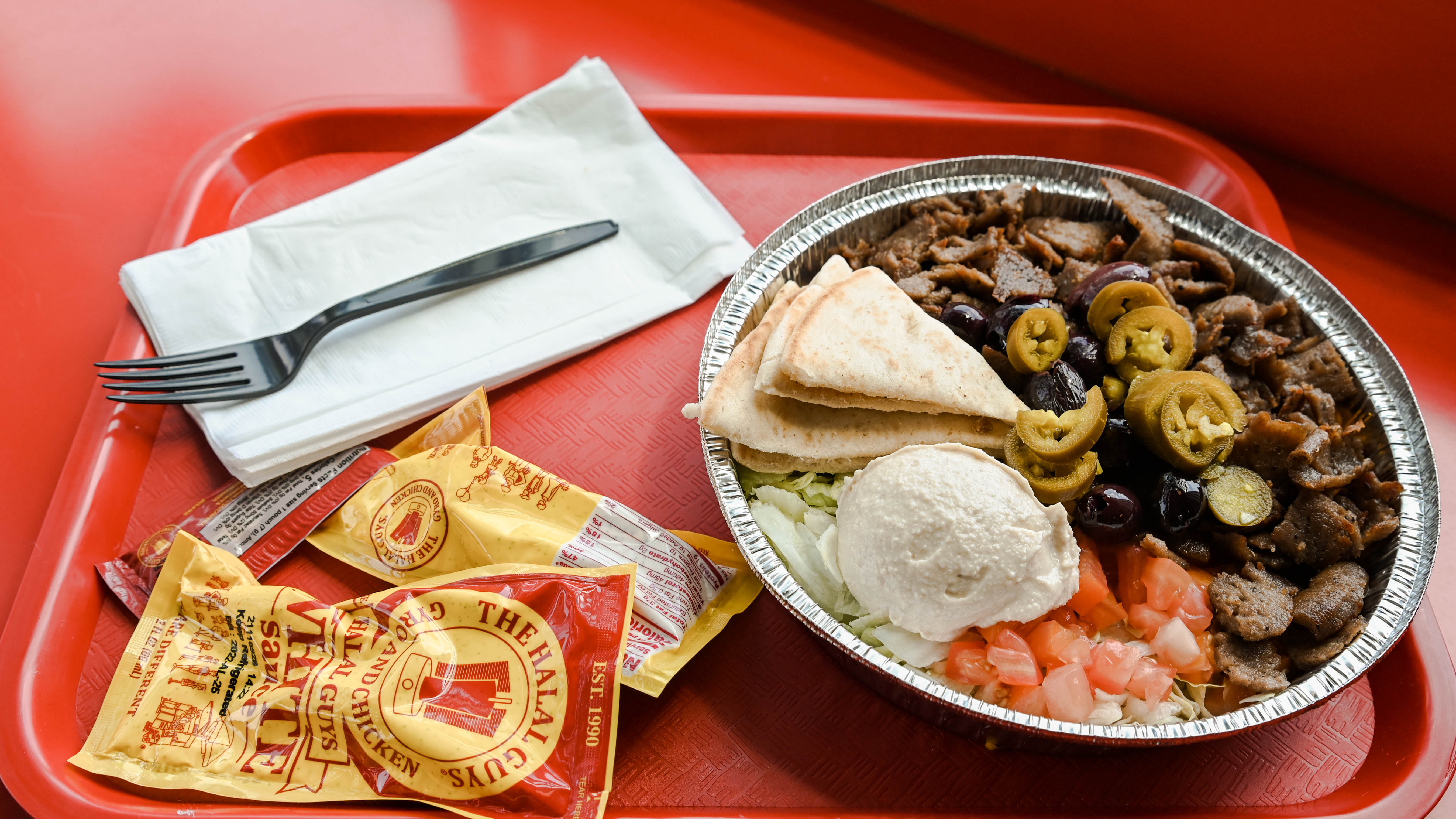 The place is built for speed, requiring a total of 50 employees to enact the built-to-order fast-casual design. Platters — dutifully constructed over steaming beds of flavorful yellow rice — and sandwiches — packed generously into pitas — are the fundamental backbone of the operation. From there, thinly-sliced gyro, chicken and falafel can be mixed and matched with a slew of toppings including black olives, white onions, green bell peppers, tomato, lettuce and jalapeno. But it’s the sauce — that comes both drizzled on the dish and in appropriately oversized packets — that clearly makes the case for The Halal Guys’ worldwide success. The white sauce is strong enough to carry the entire franchise, an incomparable sauce built for drenching and then drenching some more. The hot sauce is decidedly uncompromising, lending a legitimately bold heat most fast food purveyors would never even consider touching. Sides include hummus, baba ghanoush and falafel and fries. For dessert, the baklava comes dotted with crushed pistachios so green they practically glow in the dark.