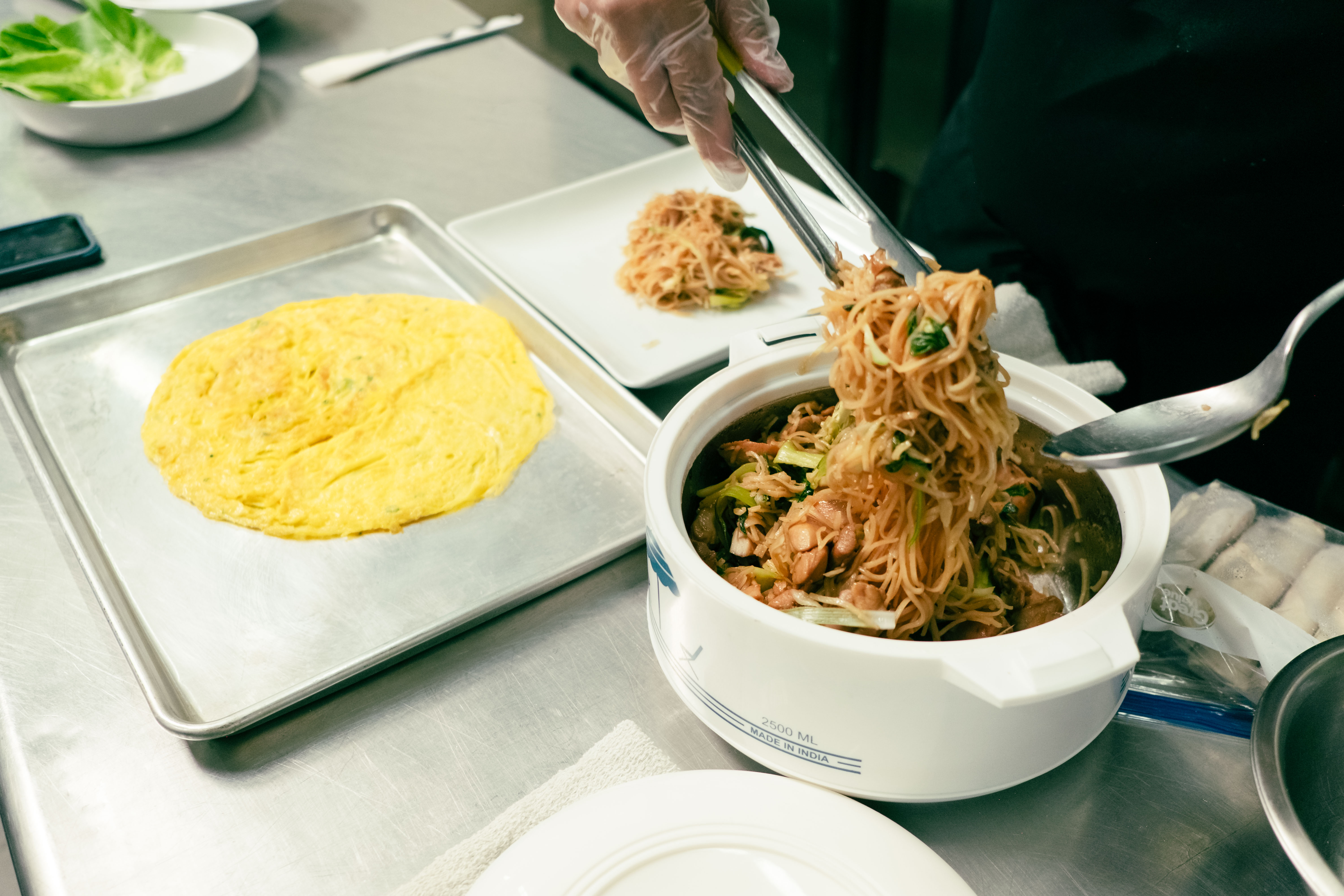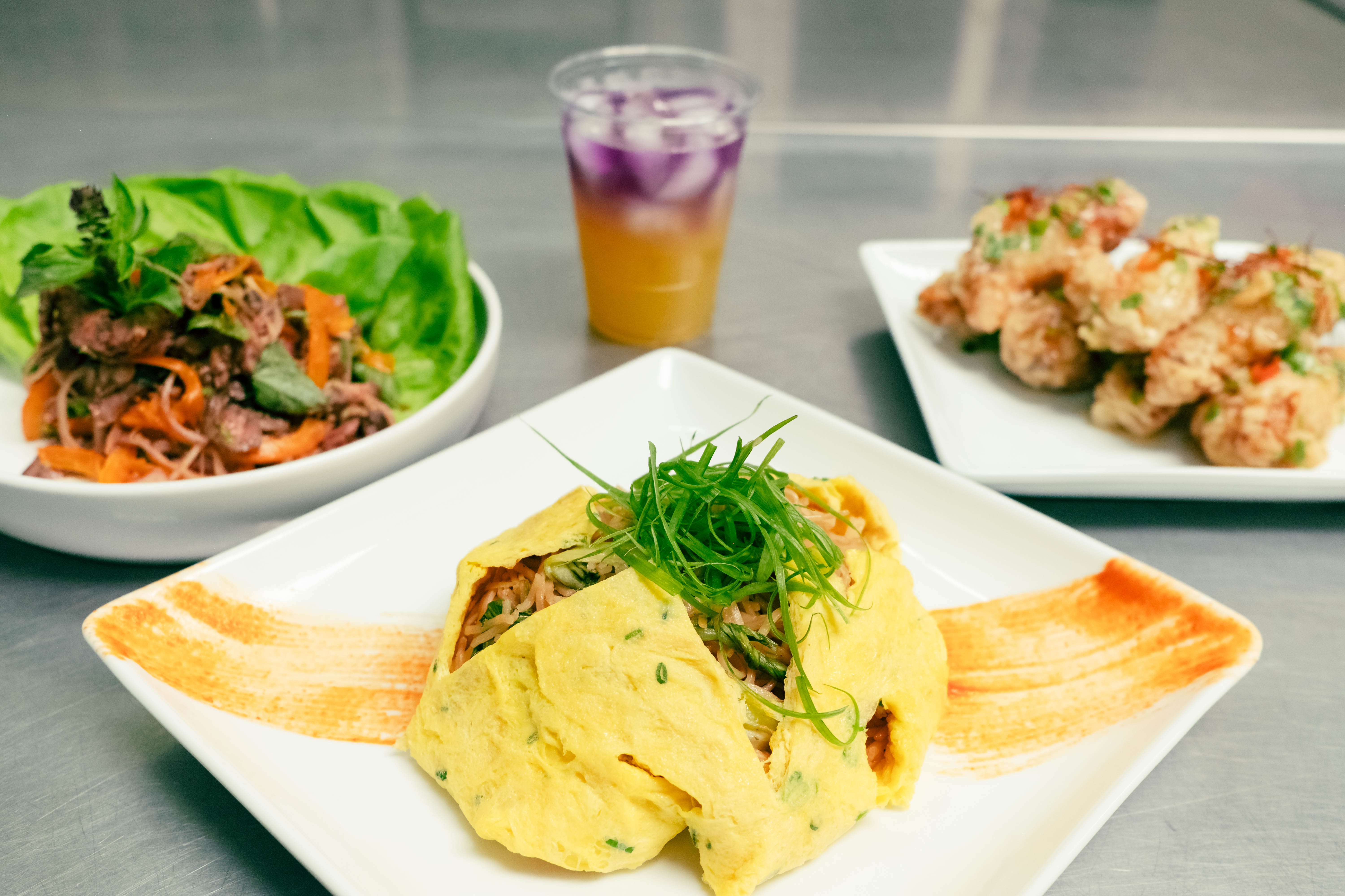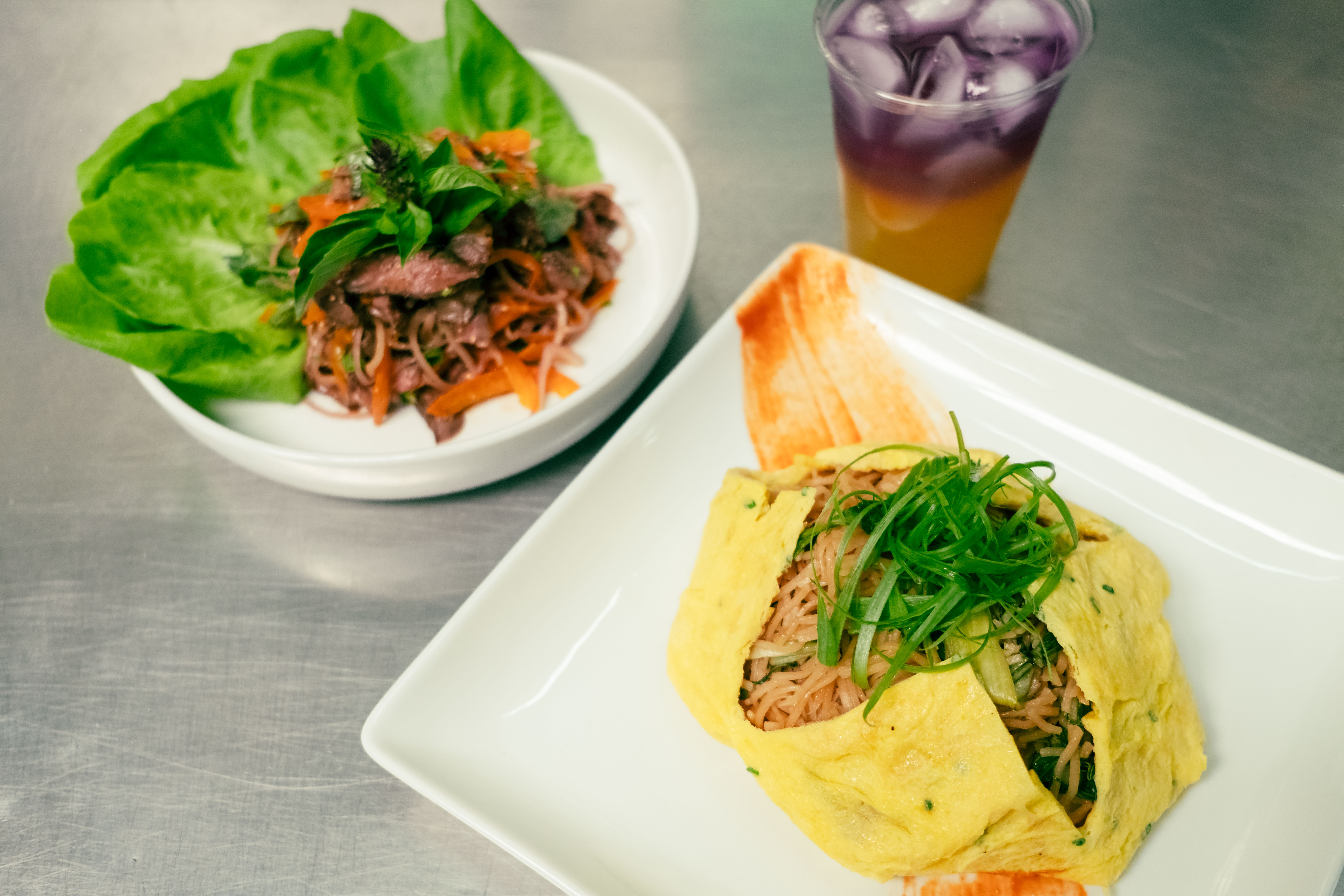 While the menu is constantly changing, there are a few items that have turned up with some consistency. One is the fish sauce wings — one of Son’s specialties — that takes exquisitely fried bird and tosses it in a sauce that balances the more oceanic flavors against a good deal of sweet and heat. Son uses fish sauce well, noting that knowing how to use it in combination with other bold flavors is one of the real pinnacles of good Cambodian cooking. Son’s version of the cha kuey teav takes a rice noodle stirfry and tosses it with bok choy and marinated chicken before encasing it in an egg omelet. Even being a to-go concept, both Son and Amon take plating seriously. “It’s all about your eyes eating first. Your camera eats first, your eyes eat first,” noted Son.