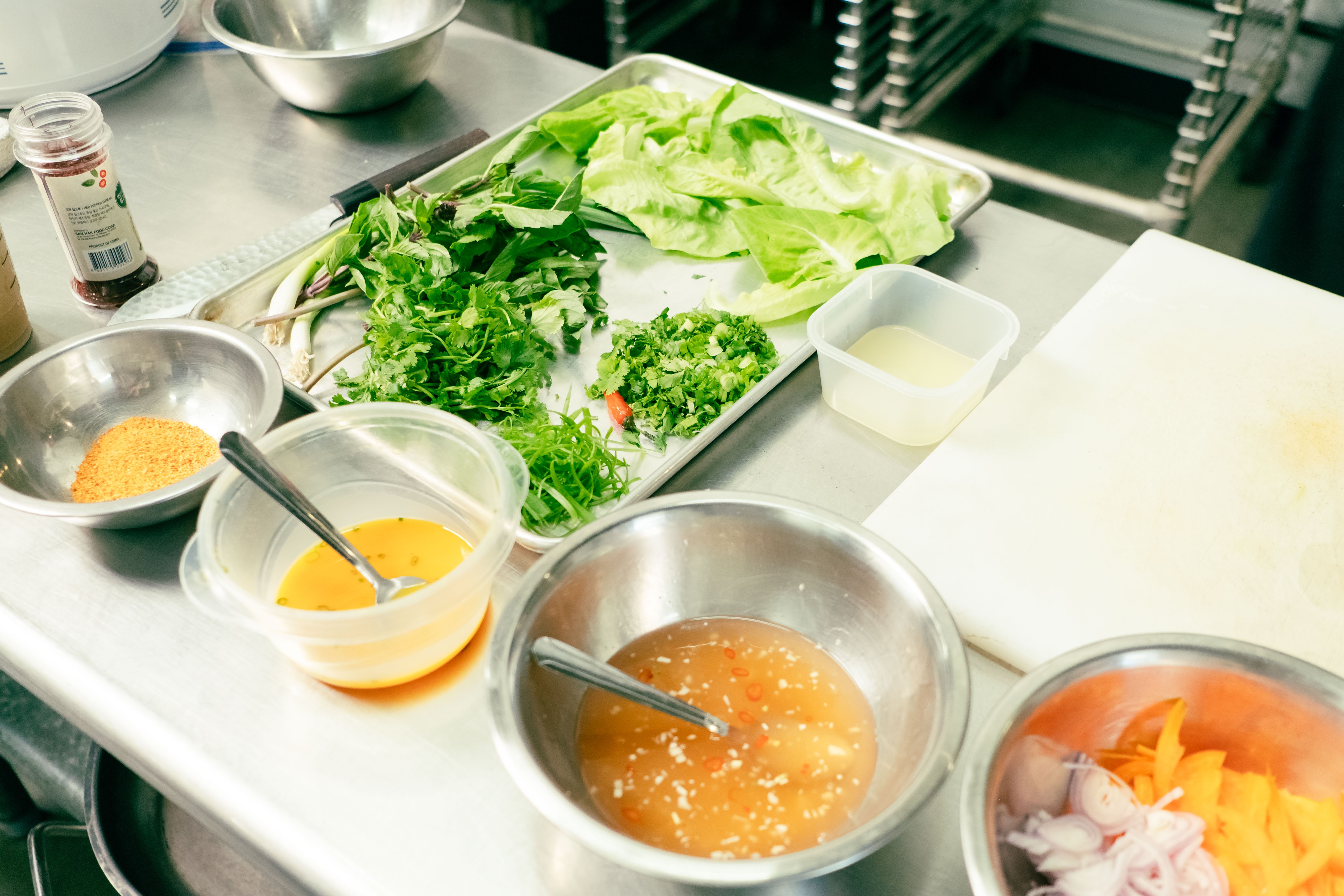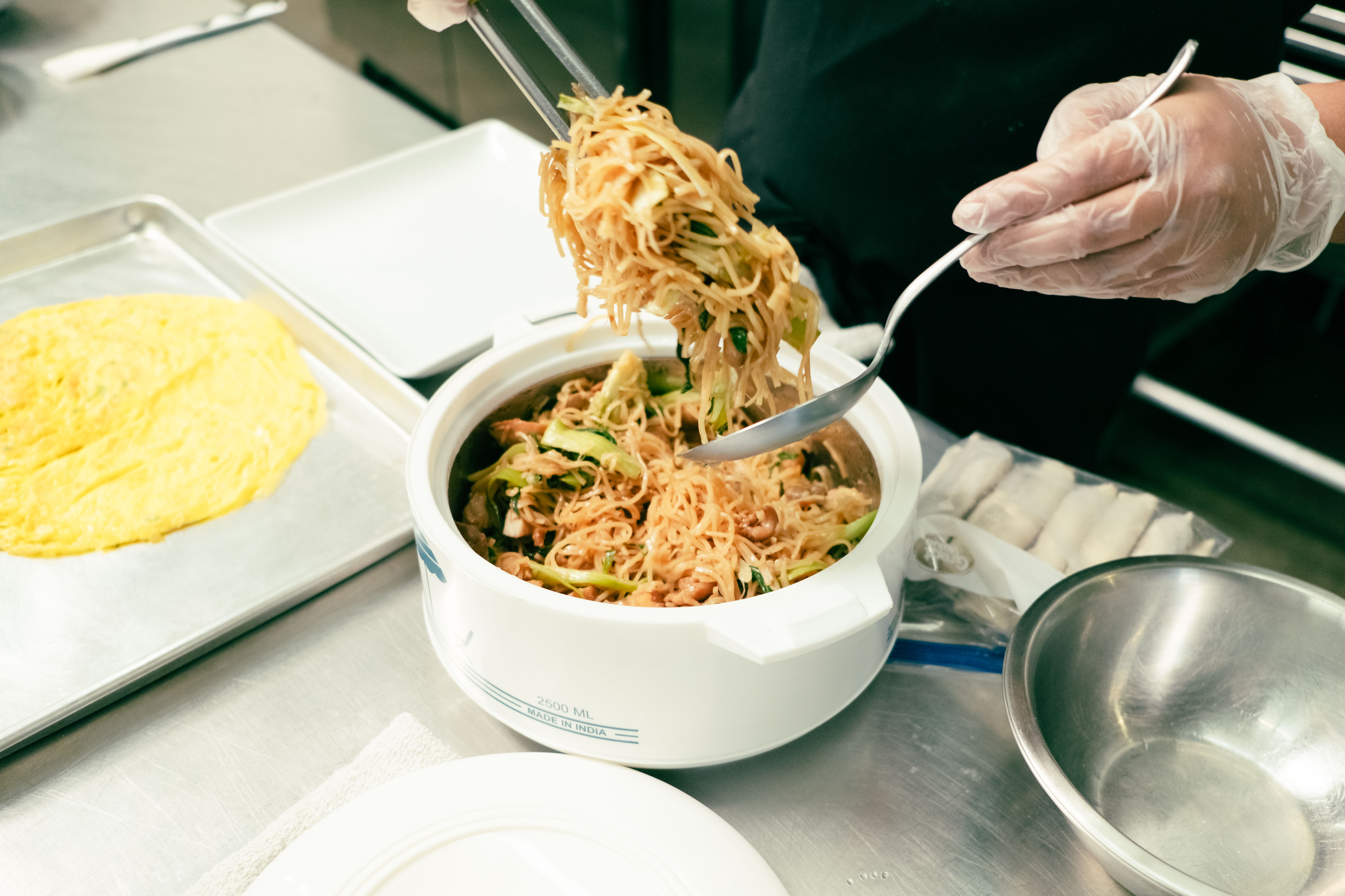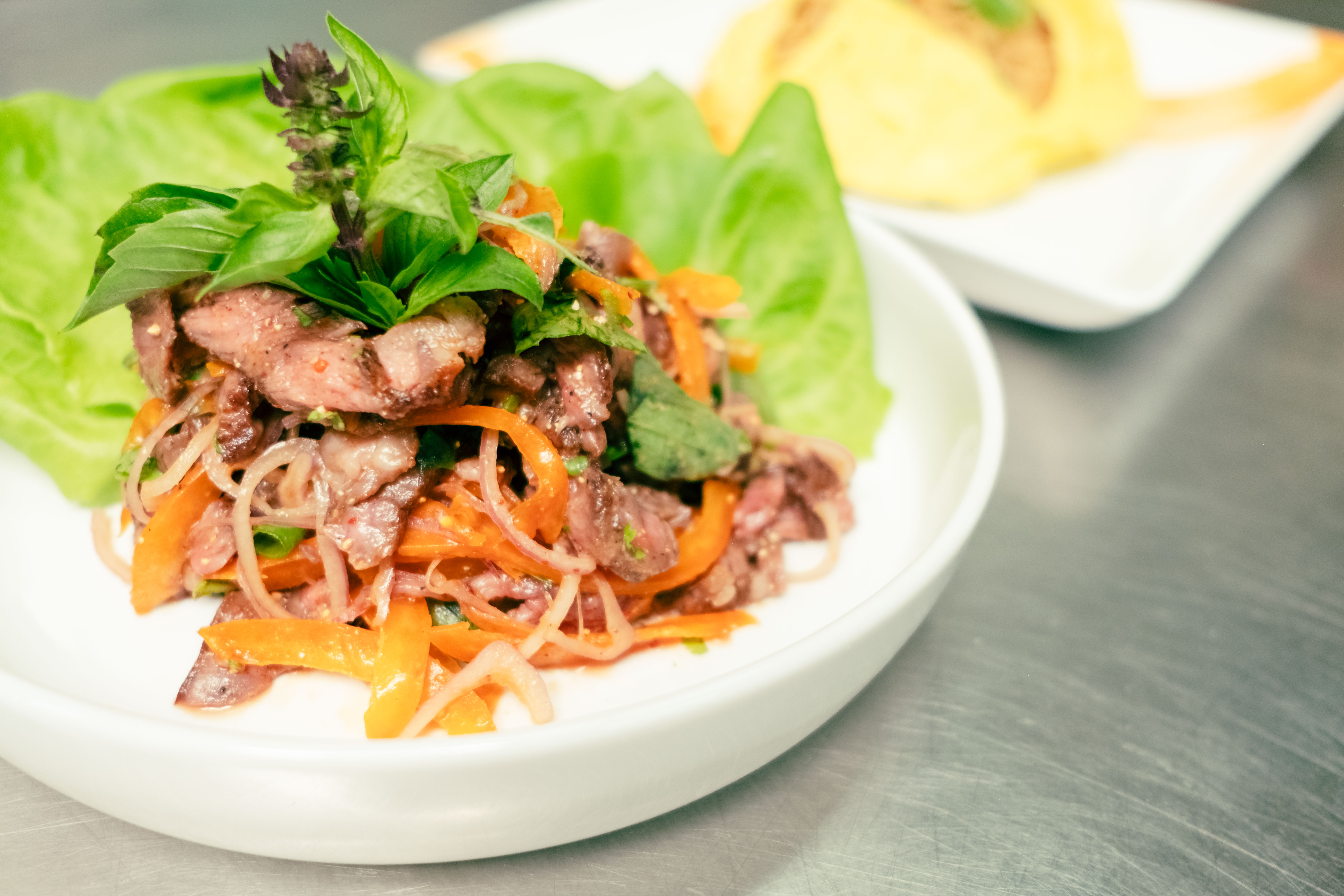 While the menu is constantly changing, there are a few items that have turned up with some consistency. One is the fish sauce wings — one of Son’s specialties — that takes exquisitely fried bird and tosses it in a sauce that balances the more oceanic flavors against a good deal of sweet and heat. Son uses fish sauce well, noting that knowing how to use it in combination with other bold flavors is one of the real pinnacles of good Cambodian cooking. Son’s version of the cha kuey teav takes a rice noodle stirfry and tosses it with bok choy and marinated chicken before encasing it in an egg omelet. Even being a to-go concept, both Son and Amon take plating seriously. “It’s all about your eyes eating first. Your camera eats first, your eyes eat first,” noted Son.