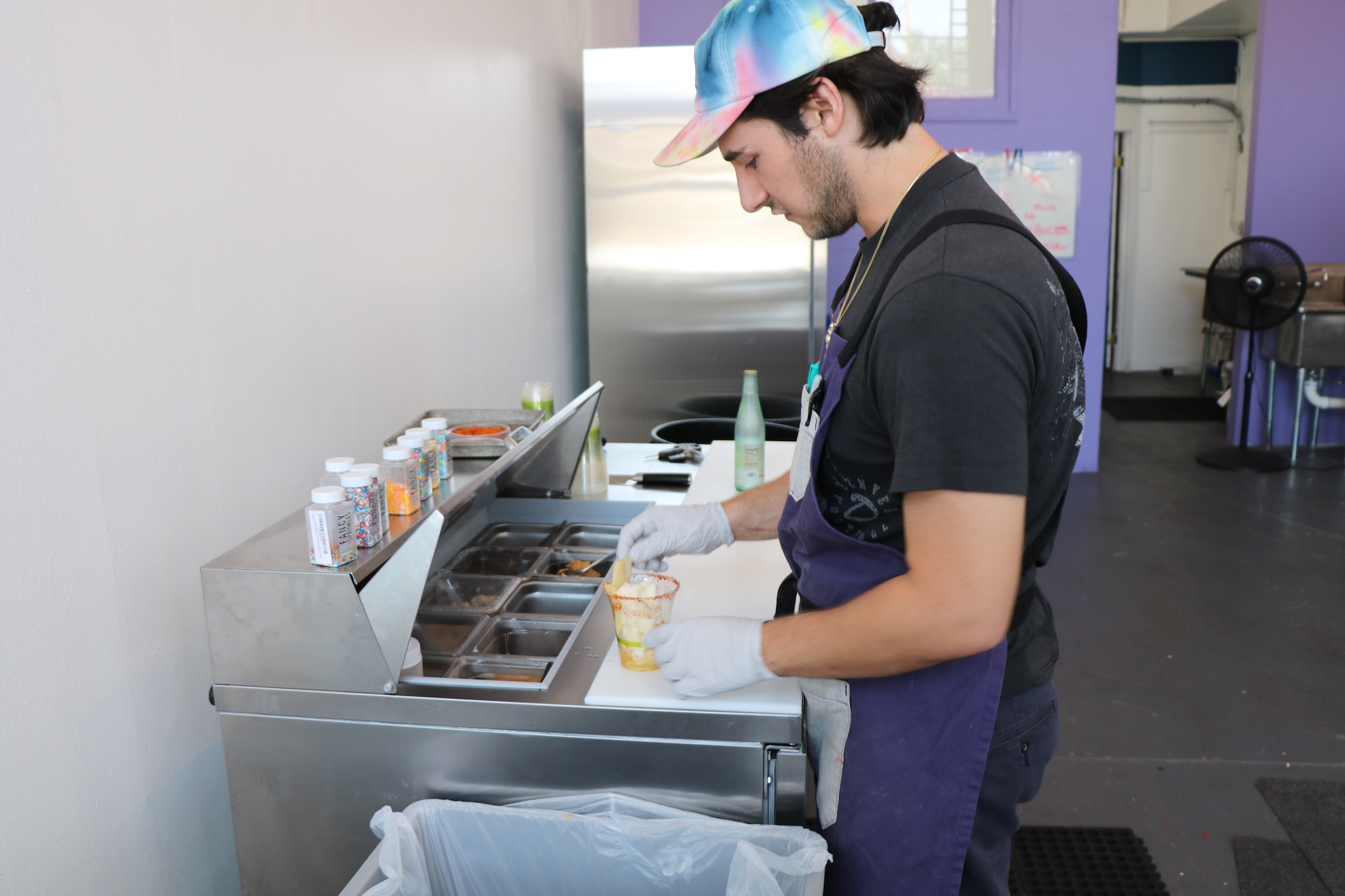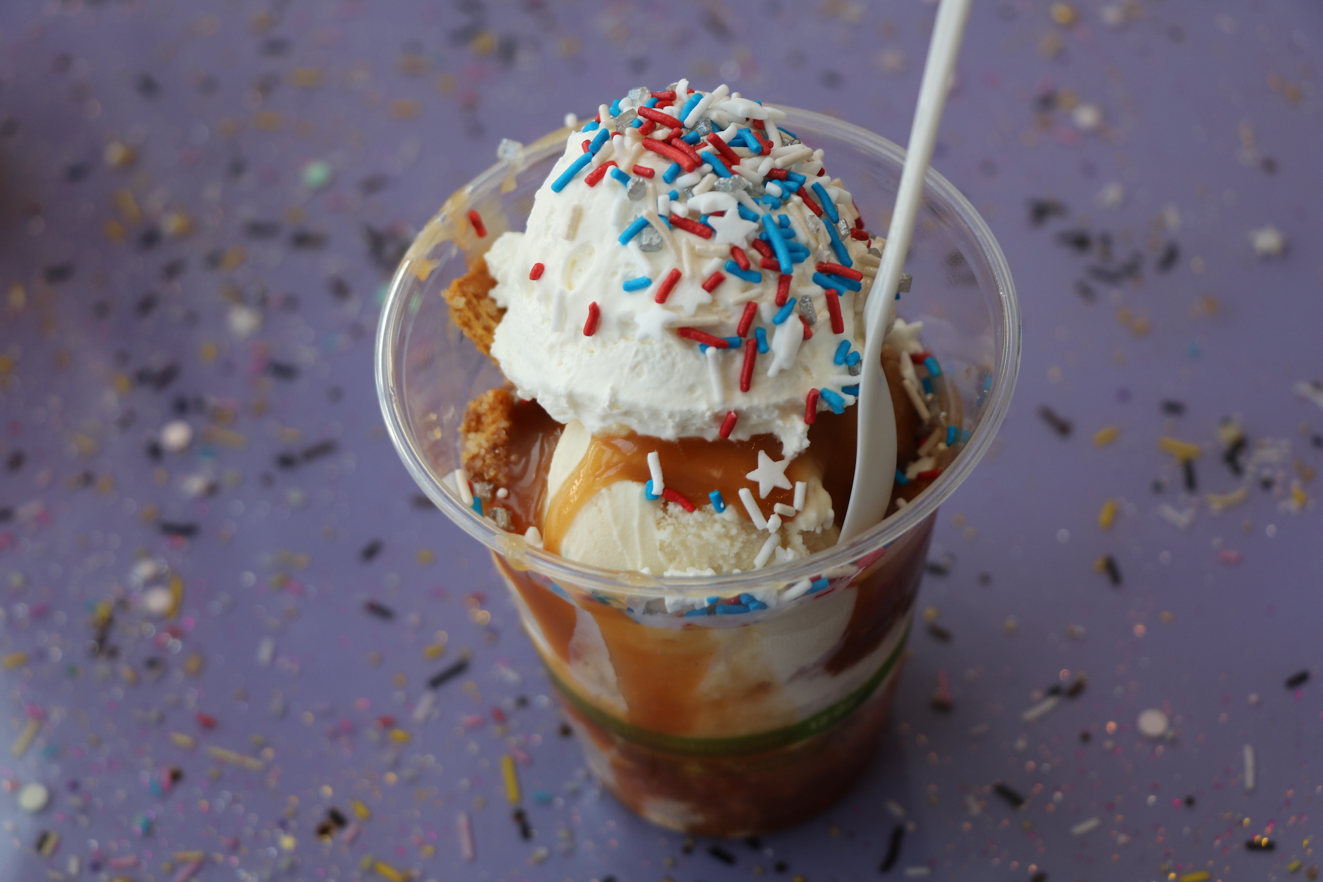 Right expanded beyond solely serving pints to include sundaes, sandwiches and frizzies to satisfy bypassers with a cold breeze in the midst of the heat. His outlook for these allows for constant changes – even the morning of when inspiration strikes. One weekend a waffle taco shell holds his scoops or buttermilk biscuits soaks up the melting drips. Frizzies utilize his sorbet for a refreshing version of a float – with Topo Chico providing the bubbles. Sundaes have the same chunks that could be found in pints but are added on top as well. His Fancy Sprinkles cling to a massive dollop of homemade whip cream. It matches the sprinkles covering the purple counter they are served from.