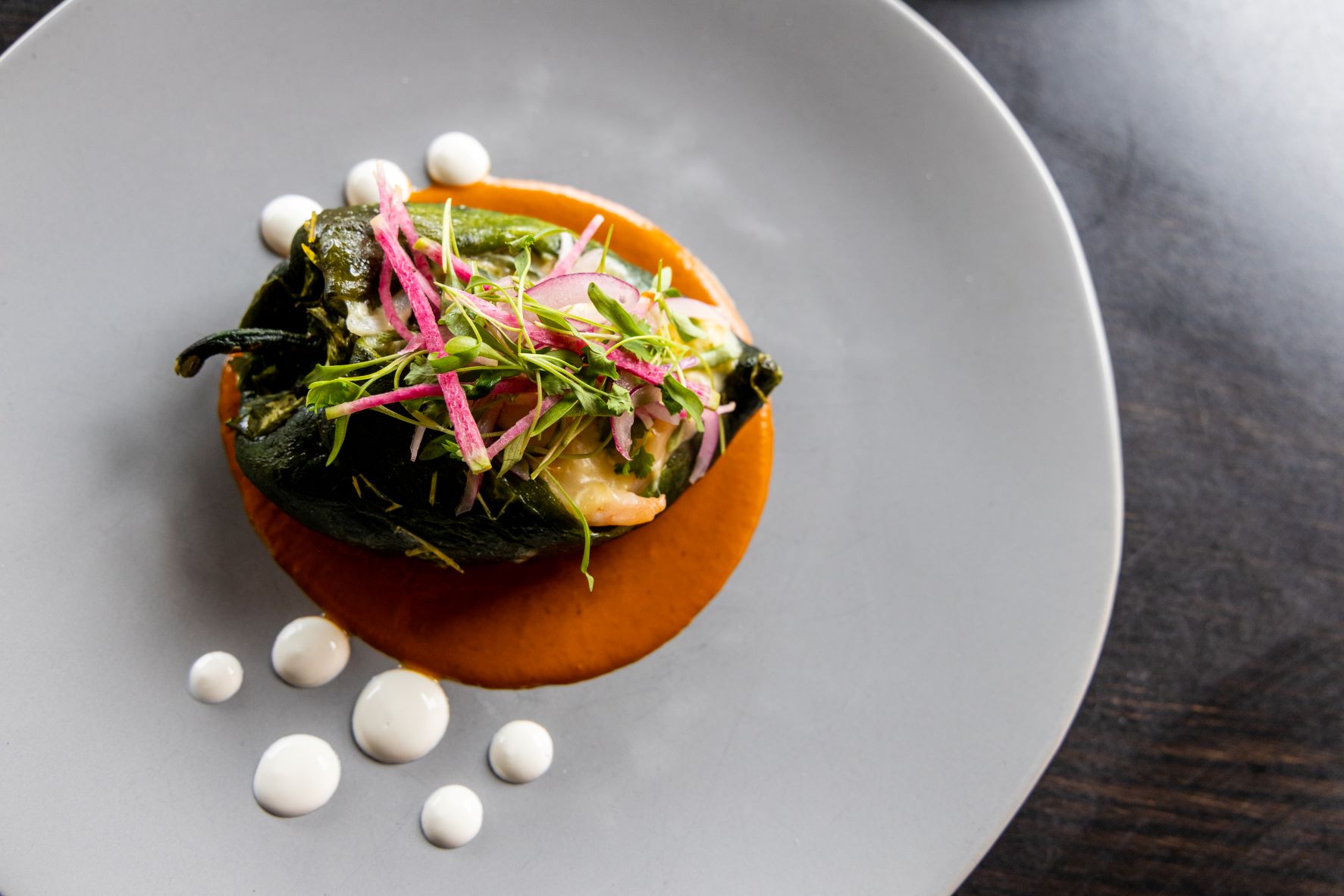 A fresh look at the Chili Rellenos ($13) transforms this traditionally heavy cheese dish into a lighter mix of shrimp, corn and spinach. It resembles a filled empanada but is concealed in a shell providing smokiness and spice.