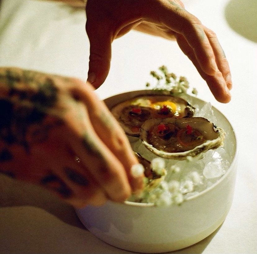 Hailing from their own concept — The Guest — the chefs are able to develop recipes and create their own imagery. They push on the perception of what food is capable of when they have the darkness of squid ink color the base of a bright ceviche. Presenting an oyster with the shell makes shooting them easier, but The Guest chefs remove the oyster and utilize a clear gelée to hold the flavor of the ocean and the complimenting accouterments.