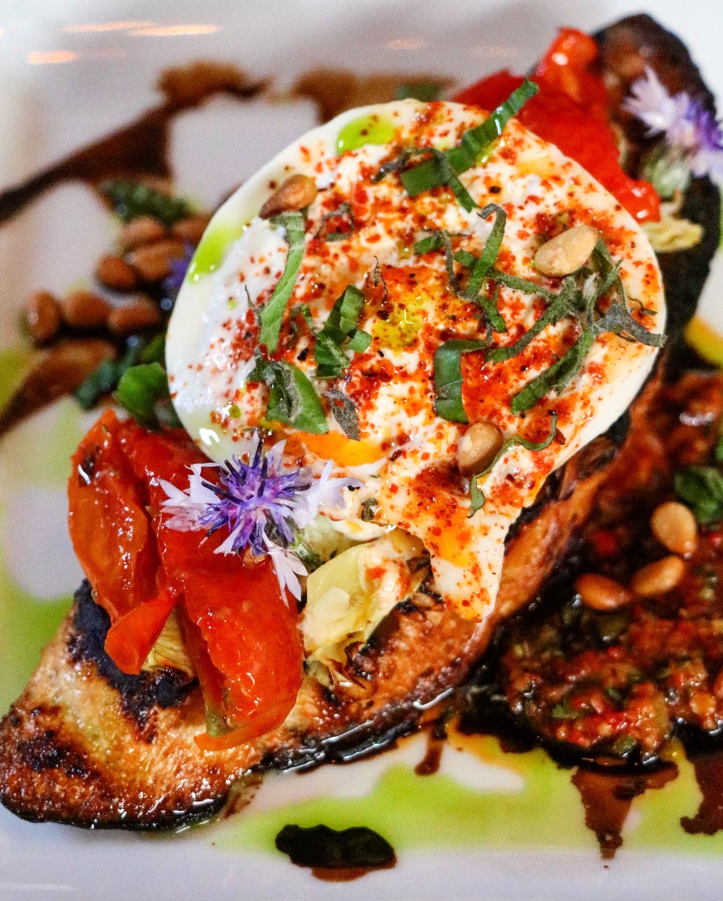 They also refine a cheese course to featuring the pièce de rèsistance — luscious burrata— rather than being alongside heirloom tomatoes. It sits atop a toasted sourdough crostini and marinated roast artichokes and peppers. Together it takes on an anti-pasta identity with the smear of olive tapenade to top it off.