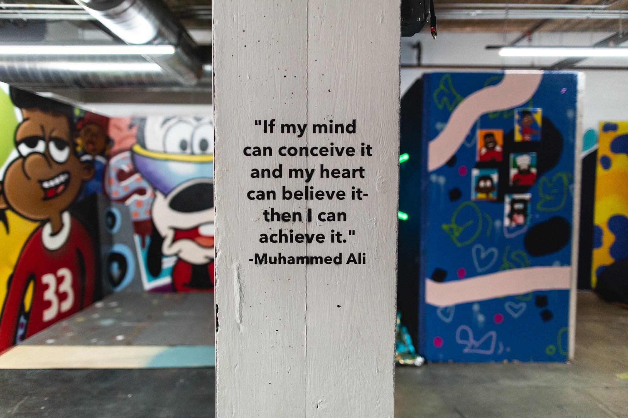 Each piece shares an artist’s experience with Black culture, be it Motown, Muhammed Ali or shoes hanging from a telephone wire. Ross says it’s to no surprise the museum is humbly described as “The Selfie Museum with heart.” Simply put, the space is an ecstatic celebration of Black culture. Many of the painted particle board murals brought over from The Black Love Mural festival in Civic Center Park last year have been lovingly restored and given new life. The activism of the George Floyd and Breonna Taylor protests breathes from the murals, providing the backdrop for new artists’ expressions of their own experiences.