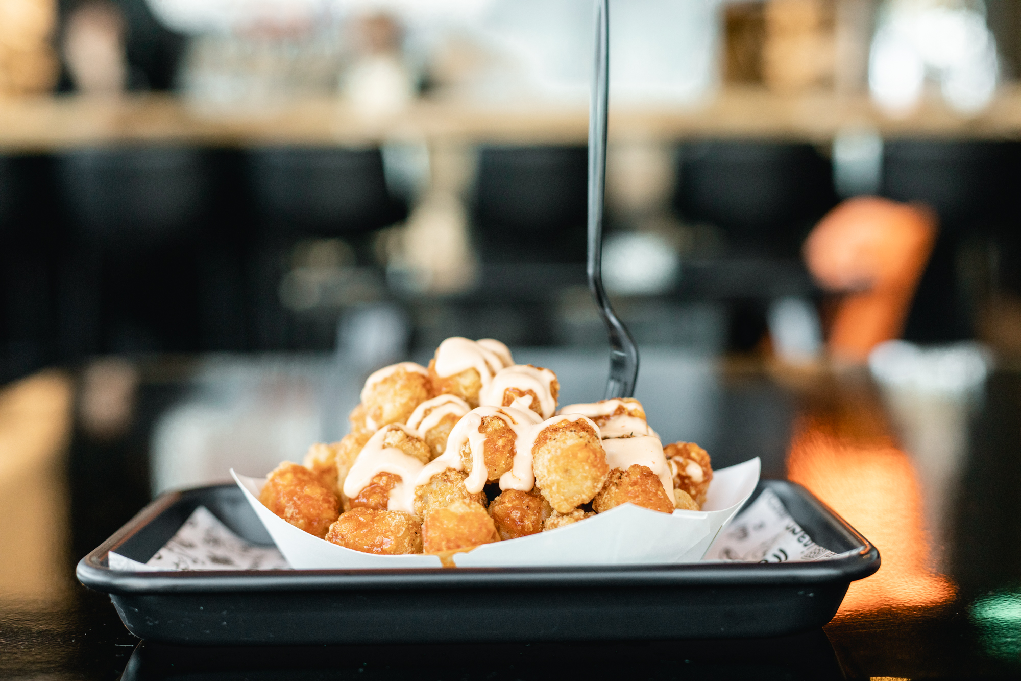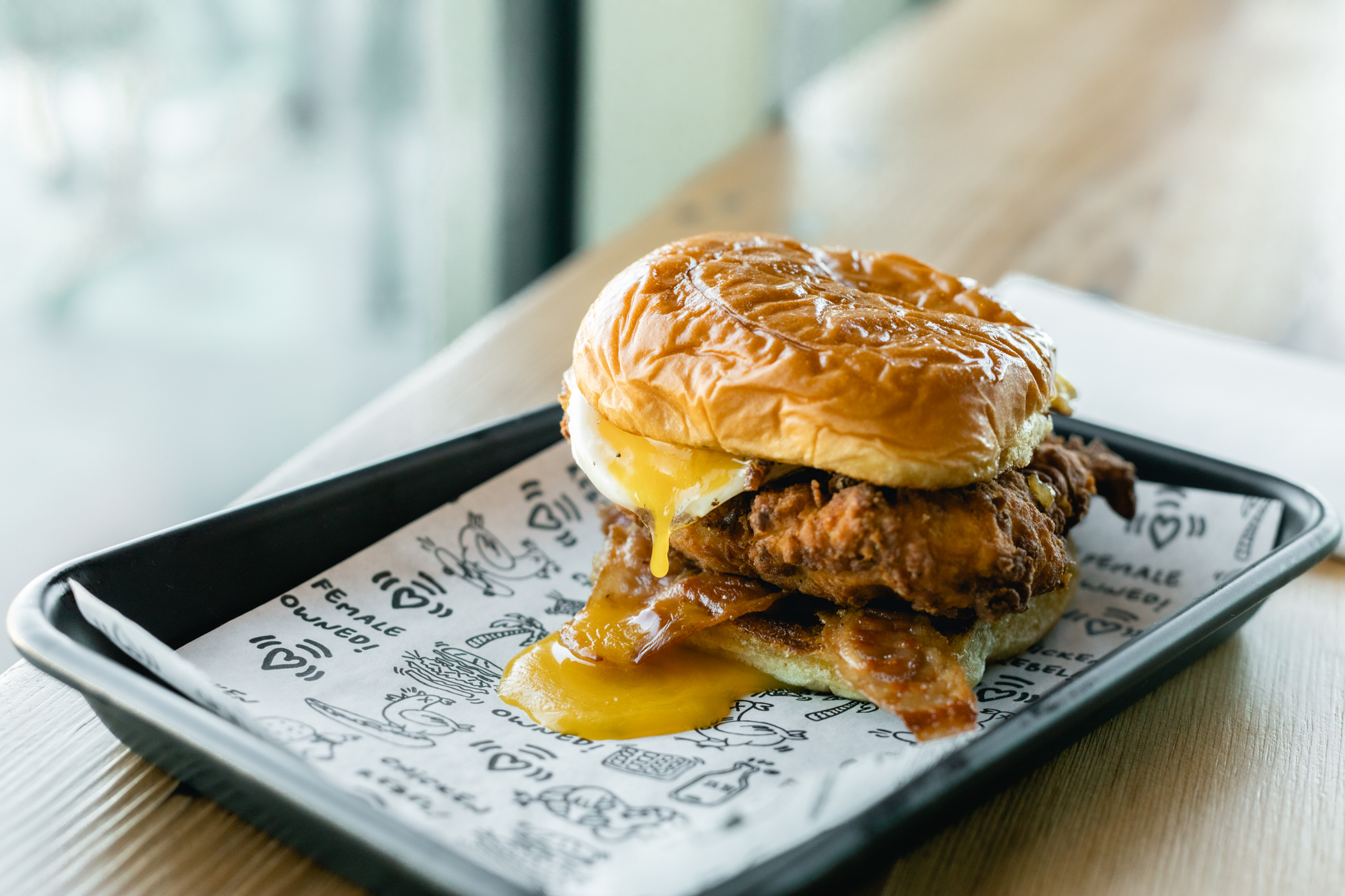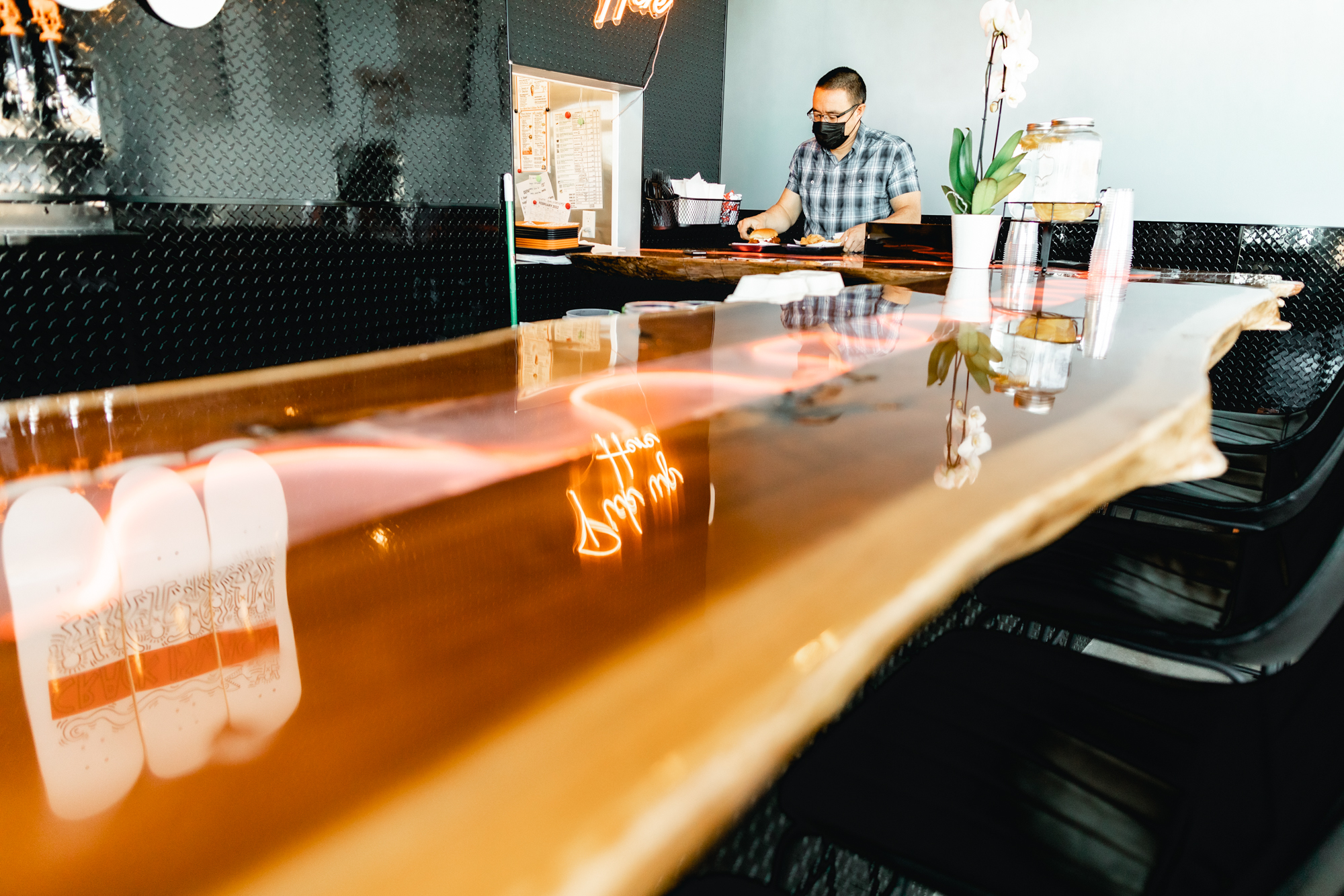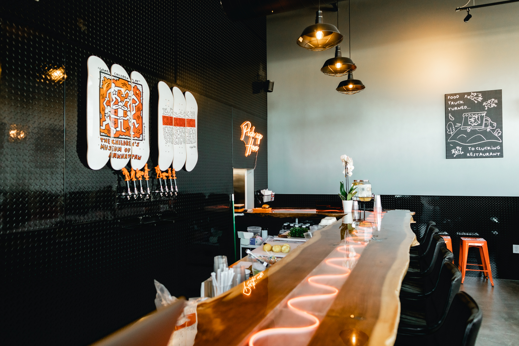 The most obvious difference between the new location and its urban sister — which is nestled next to Mythology Distillery and is decidedly hip — is the drive-through. And while it is certainly the premiere symbol of vulgar food mechanization, Chicken Rebel hasn’t cut any corners and tastes better than ever. “Since we brine and sous vide the chicken it only needs three minutes in the fryer,” said Lovett. “We established ourselves as more of a to-go place during the pandemic,” she continued. That isn’t to say that the Westminster dining room is in any way unfriendly. Keith Haring decks from the Children’s Museum of Manhattan line the wall, and the bar — all polished wood and neon waves — is a nice place to enjoy a chicken sandwich with your beer.