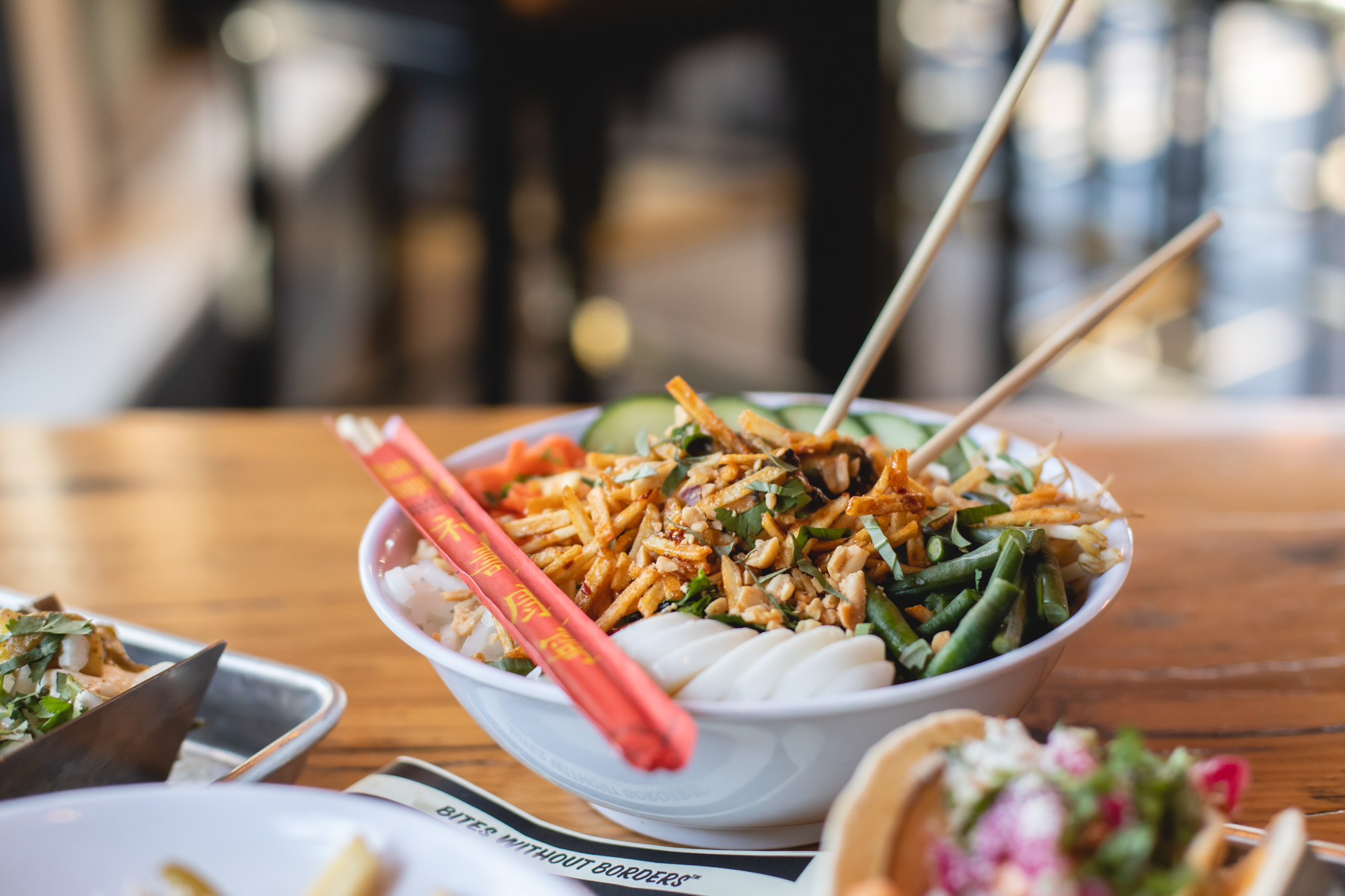 While the dishes certainly shine in their originality, Verrier insists that his method is rooted in respecting the ingredients and techniques of the cultural antecedents. The tacos are all sturdy affairs, with the usual suspects like chicken, fish and lamb all arriving elegant and unfussy. Though it’s the shroom taco ($5.25) — with huitlacoche beans, salsa roja, onion and cilantro — that may steal the show, the fungus having been converted into something that more closely resembles crisp chorizo. The bowls, particularly the Indonesian noodle ($14.50) — with chicken sate, peanut sauce, boiled egg, fresh herbs and spicy shoestring potatoes — are a nice reminder to avoid the easy mistake of equating snacks with junk food. Items like the kimchi quesadilla ($11) — with cheese mix, kimchi, cheese sauce, savory crema and green onions — are a good example of Verrier’s ability to cross-pollinate. “I’ve been blessed with the ability to make food taste good,” grinned the chef. That there is only set to be a limited drink menu has been designed intentionally to make Street Feud feel like a safe space for sober and sober-adjacent customers.