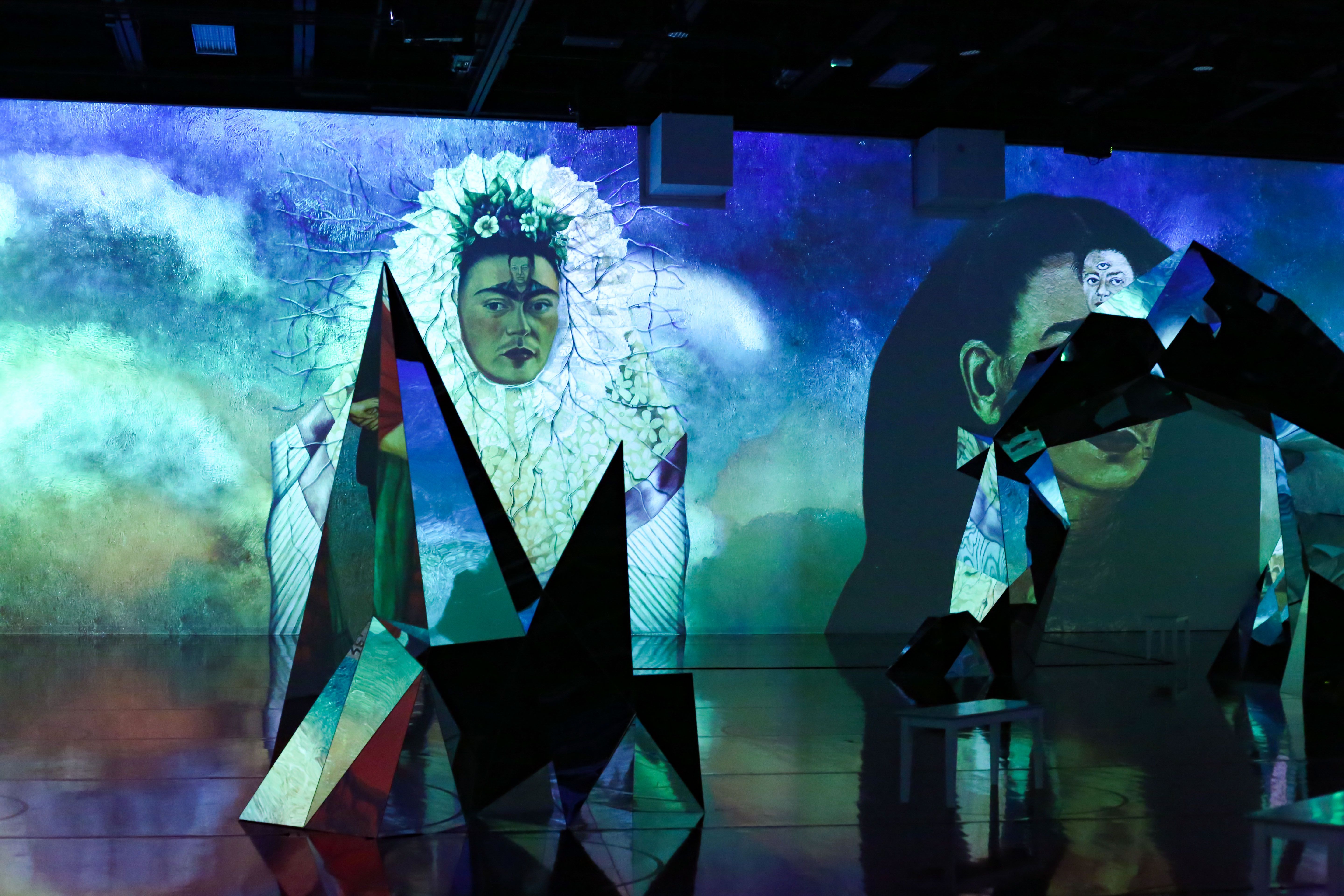 The art space opens vastly as you enter. Already, Frida’s most famous self-portraits greet you – “The Two Fridas,” “Frieda and Diego Rivera” and “Self-Portrait with Thorn Necklace.” She is there, from floor to ceiling, portrayed in the various moments of her life. Mirrored, geometrical sculptures stand in the middle of the room. They mirror the images on the wall, showing broken, fragmented reflections of Frida’s face. One can’t help but wonder if it’s meant to symbolize Frida’s well-documented pain, both physical and emotional.