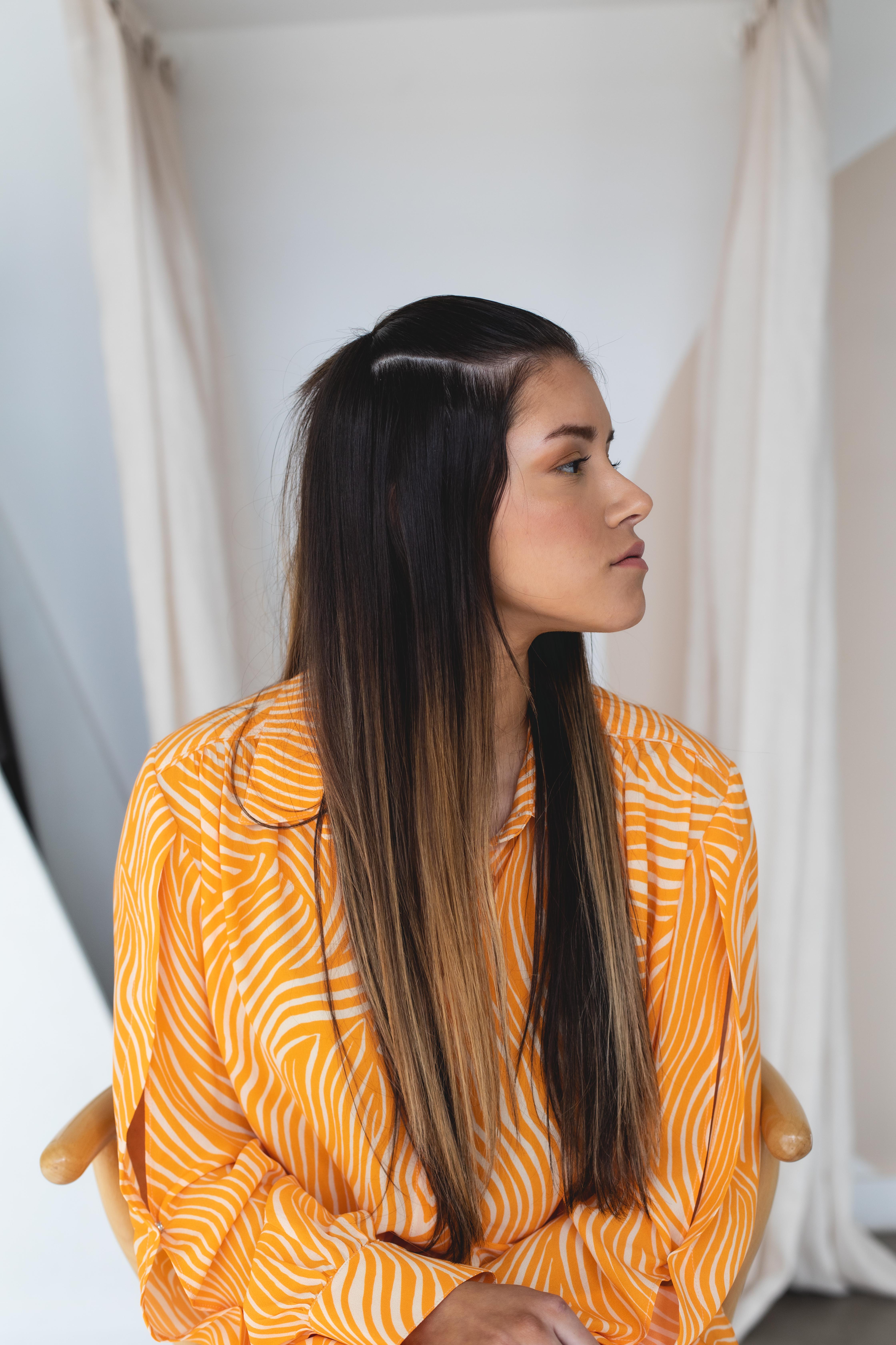 A pop of color can come from the garments we wear or even makeup. We opted for colorful eyeshadow on both Miranda and Lieberman to bring out the hues in their looks. Straight or curled hair is a perfect match for a color block look to let the locks flow freely and to achieve the carefree yet put-together looks that inserting pops of color can accomplish.