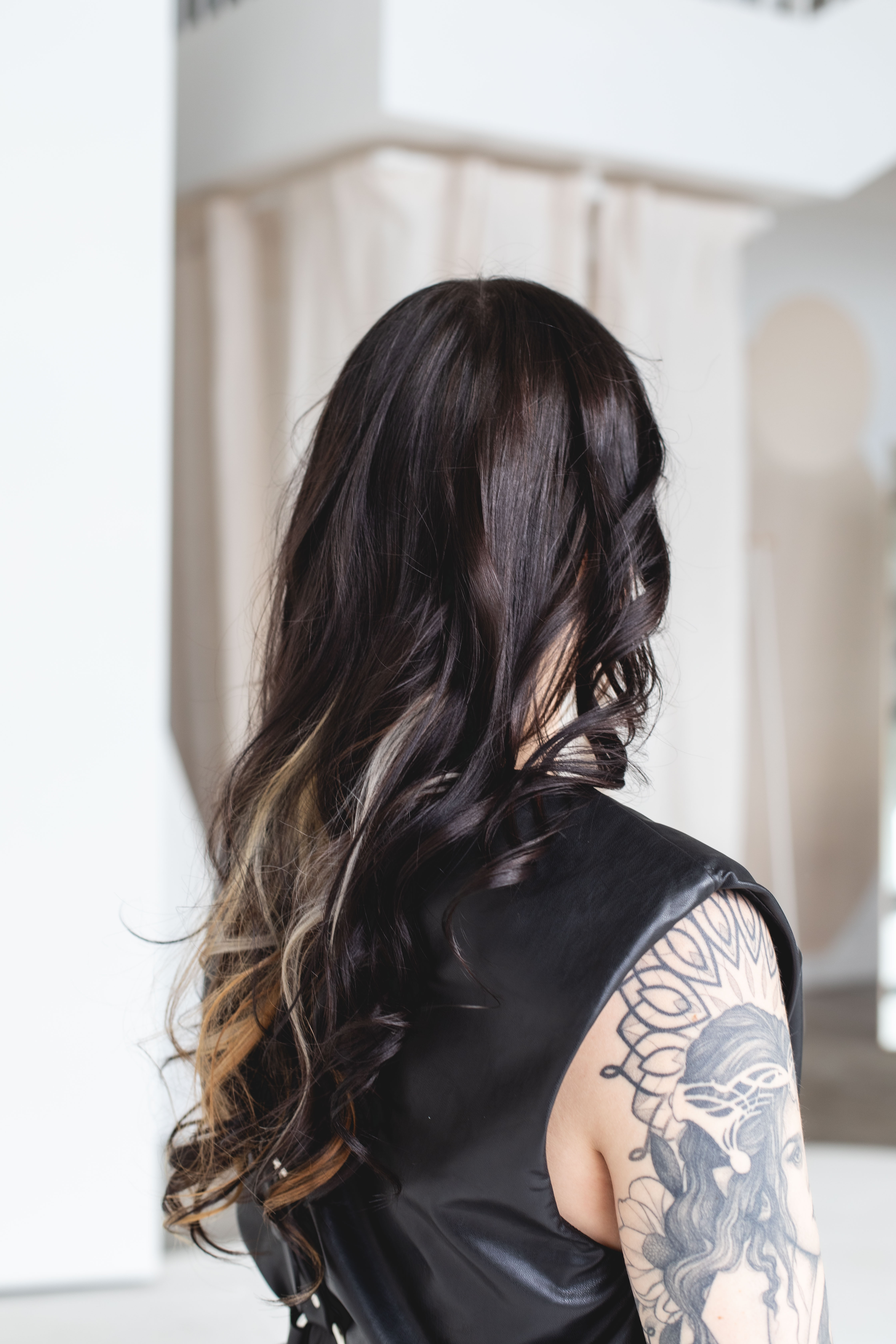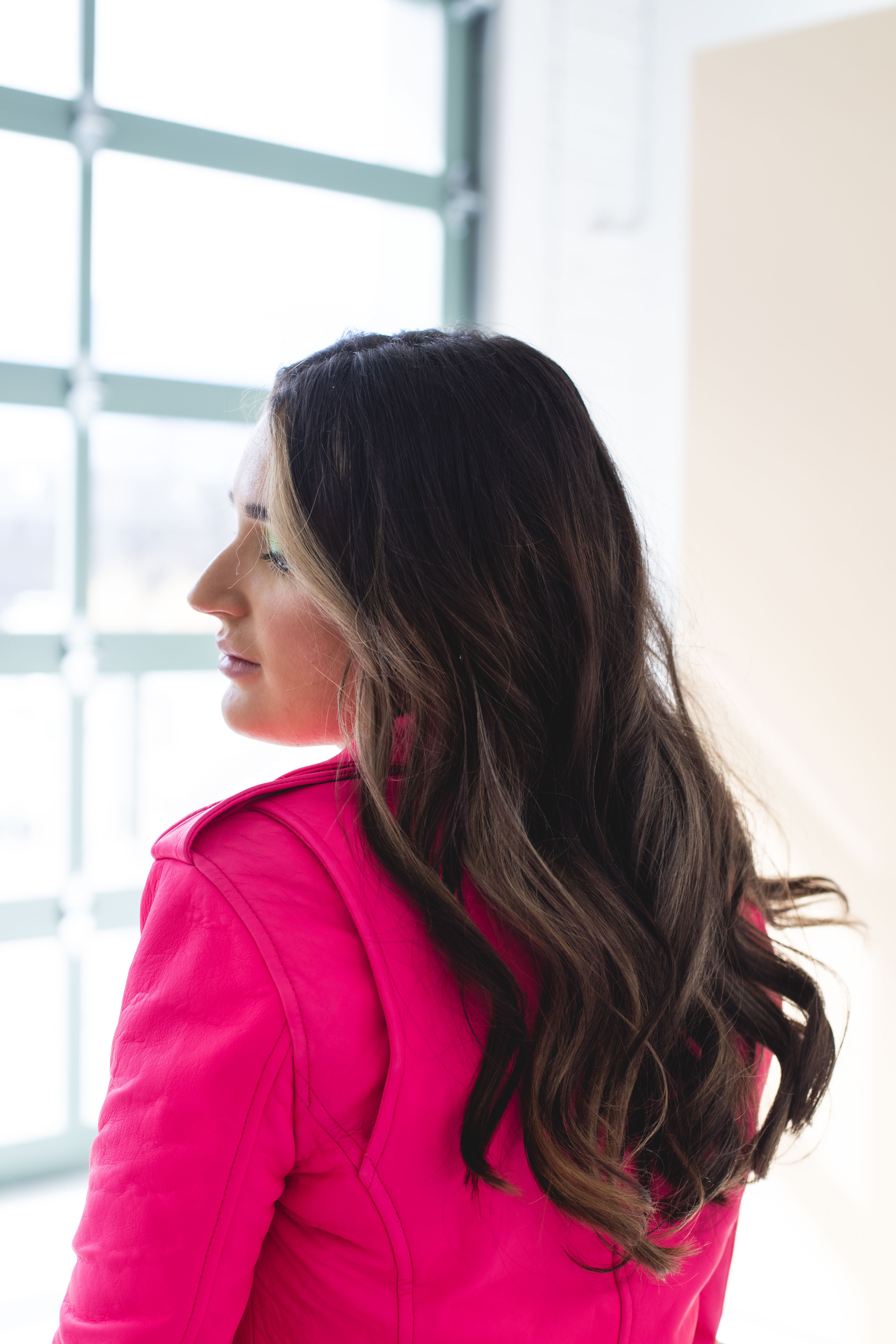 Lead Stylist Ashleigh Perri brings a new meaning to motorcycle chic in an all-black outfit paired with a lavender leather jacket. These leather joggers combine comfort and style and make for a daunting look meant for any occasion. Paired with a leather jacket in a bright tone, this look is a great way to transition into spring despite cooler temperatures.