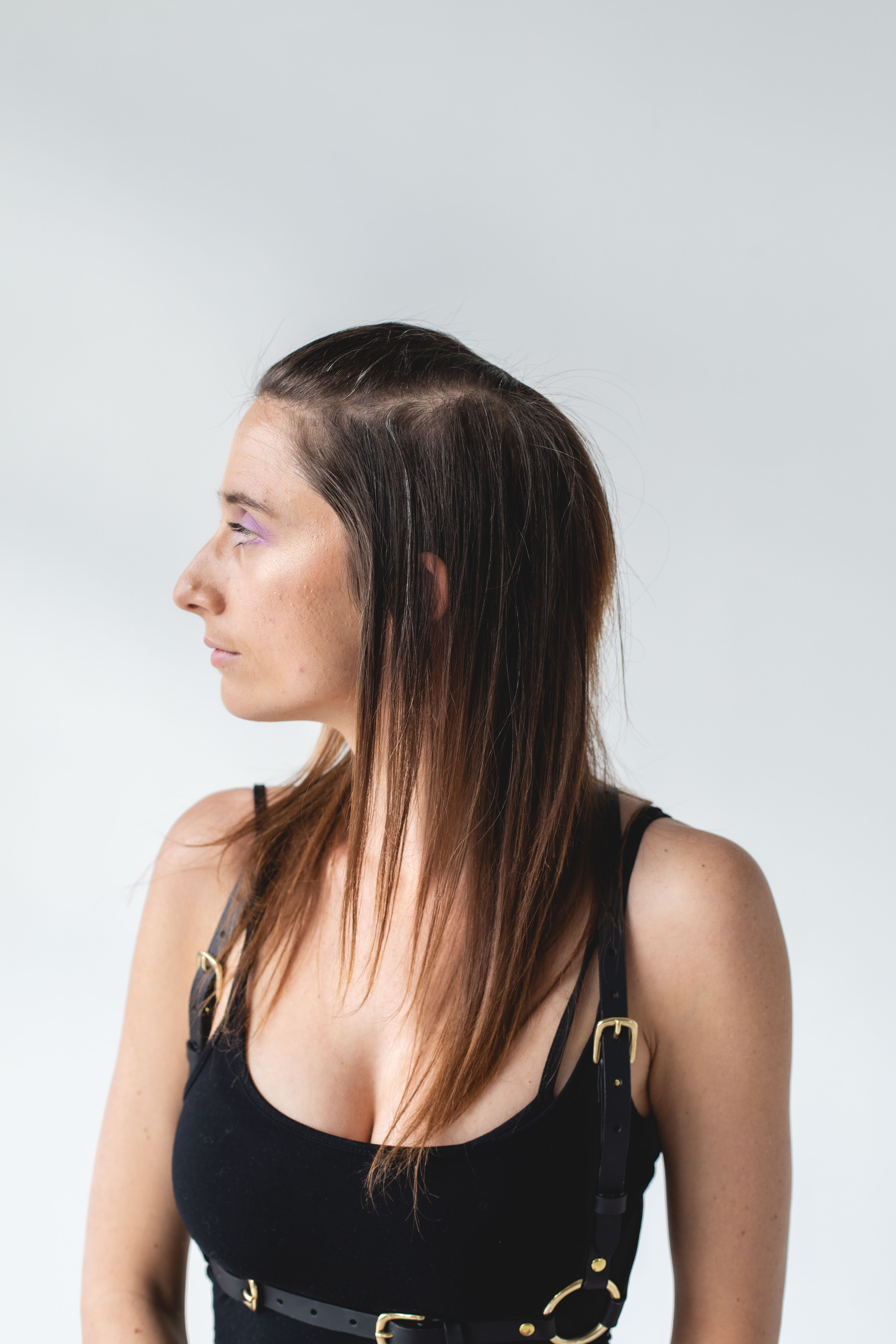 Makeup and accessories are all the rage in these night-life-inspired looks. From Snyder’s bold red lip to Perri’s stunning purple eyeshadow, the hair and makeup complete these stunning looks. To take these motorcycle-inspired but fashionable looks to the next level, add a harness like the ones that Snyder and Perri are wearing from Ārdēo Studios. When the heat starts to rise in the bar or club, ditch the jacket and an entirely different look will be underneath.