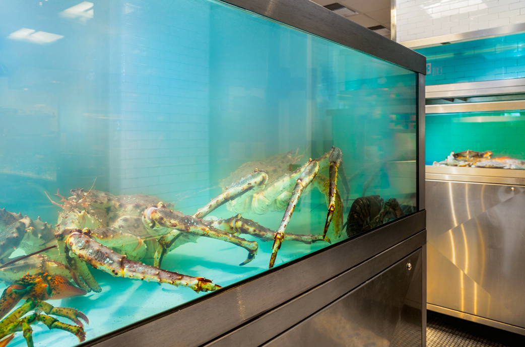 Though the menu changes daily, the restaurant maintains a robust saltwater tank program, with live shellfish such as California spiny lobster, Dungeness crab and more.