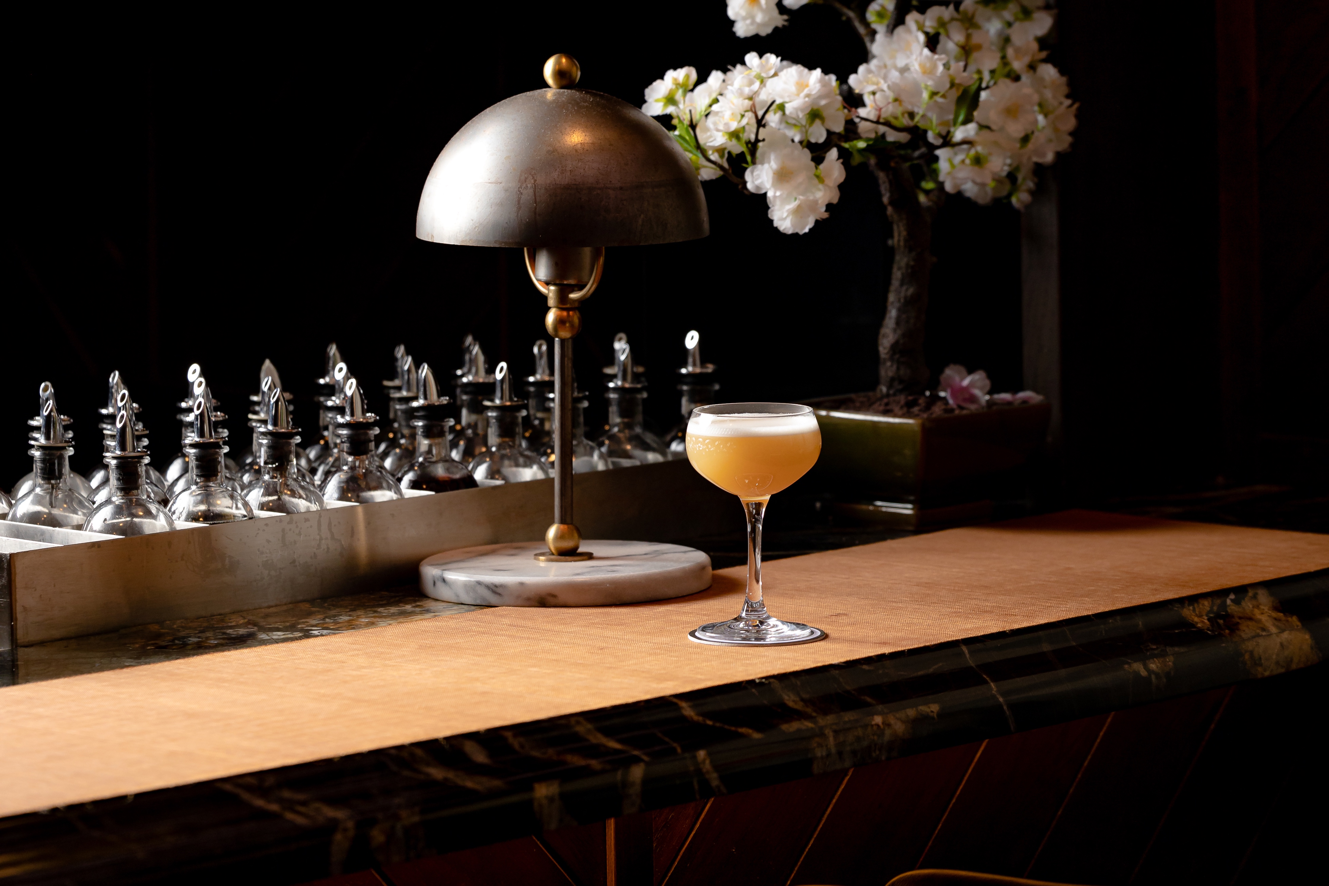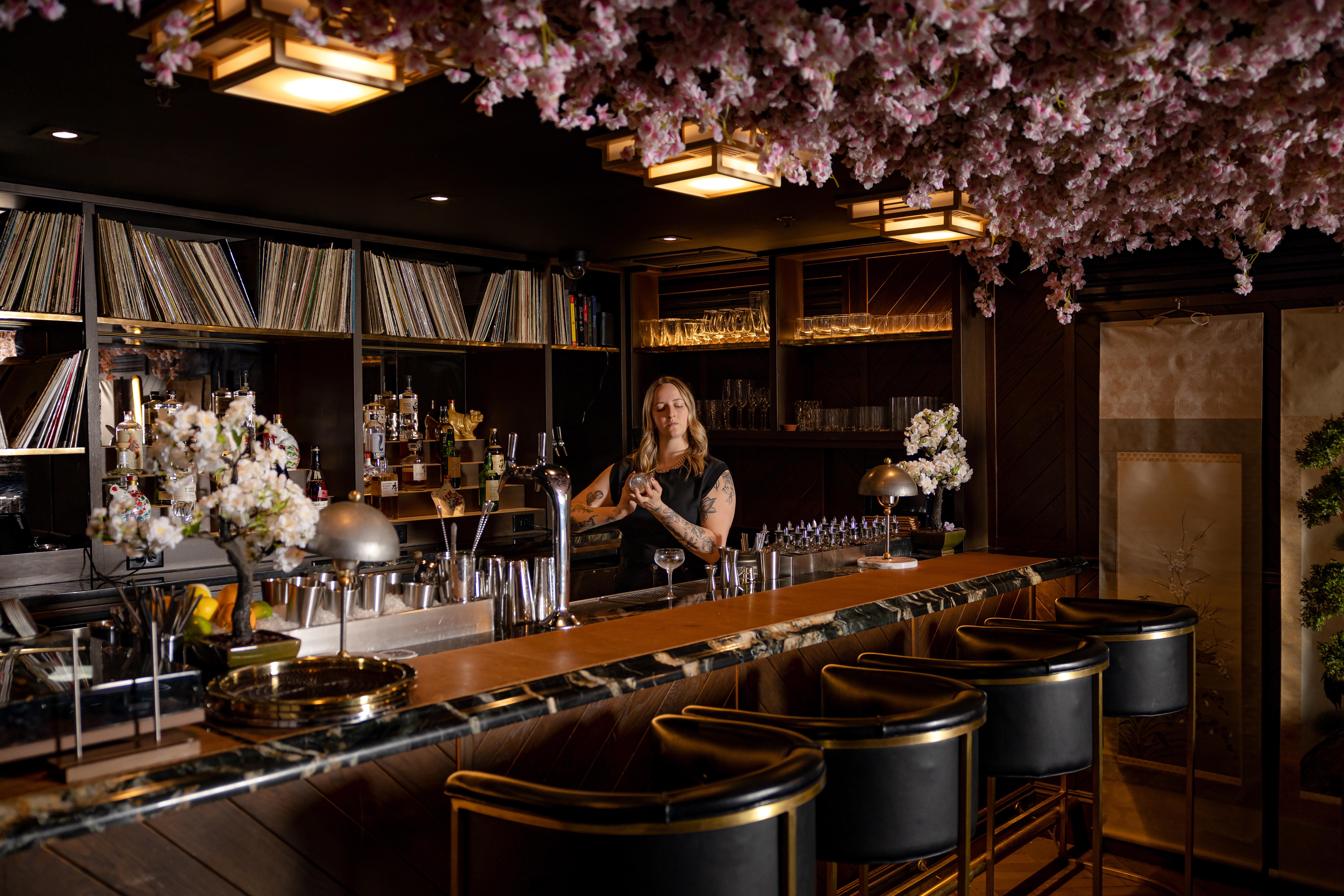Beginning in March, Suite 6A was transformed into The House of Suntory — a discretely lavish ode to bona fide highballs, a compact range of cocktails featuring a wide breadth of Japanese spirits and a slight menu of associated snacks. Originally formulated by John Armstrong — the current West Coast Brand Ambassador for Beam Suntory who previously bartended at the principal Death and Co from 2013 to 2015 — at the brand’s Los Angeles location, the pop-up gracefully displays many of the nuanced fineries that have become synonymous with both labels. The aesthetics pay tribute to the Sakura Festival, with a dense cloud of cherry blossoms trickling across the entire ceiling. The music, which favors downtempo, funk and jazz is all hand-selected and hums gently, aligning the place with Tokyo’s famed record bars. The collection — a multiple-crates thick stack of rare Japanese vinyl that lines the wall — is apparently Armstrong’s personal reserve.
