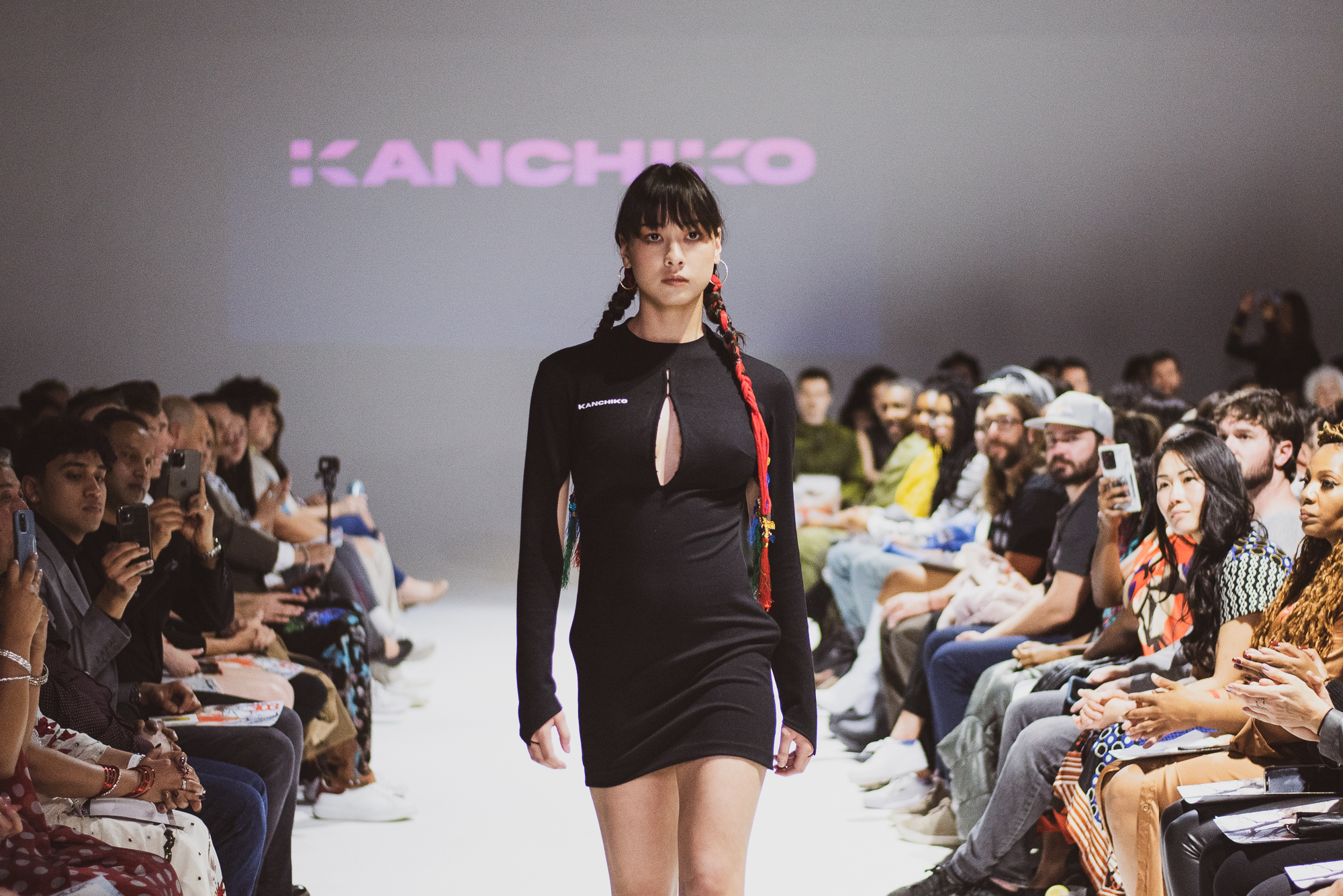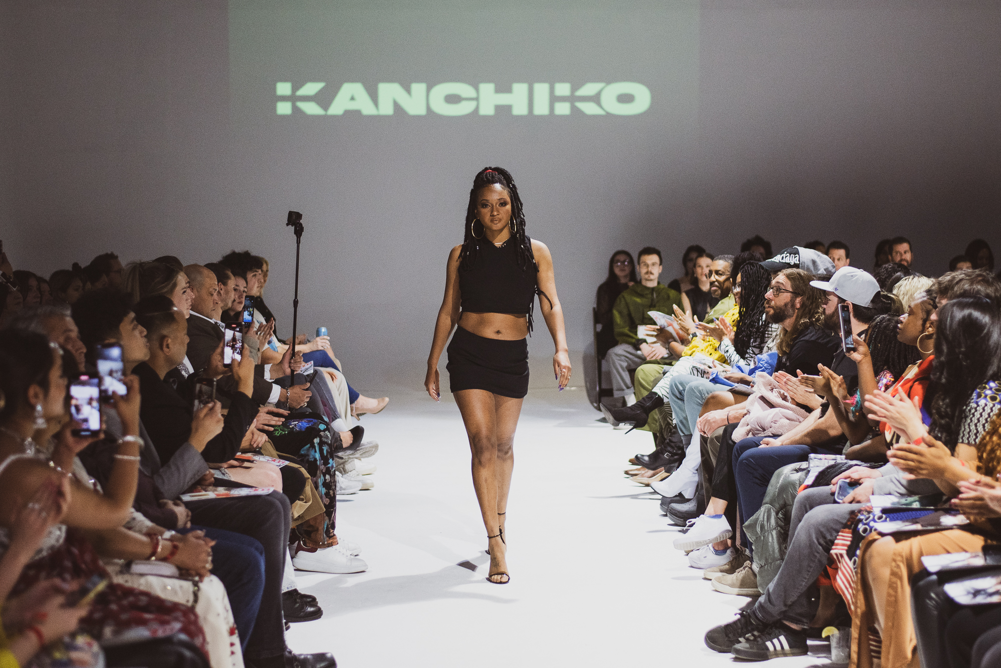 Straying away from their typical cozy loungewear, Kanchiko designer Saylesa Nepal paired simplistic colors with unique shapes to create the brand’s newest line. Heavily focused on two piece sets, the collection was a leather version of your favorite activewear.