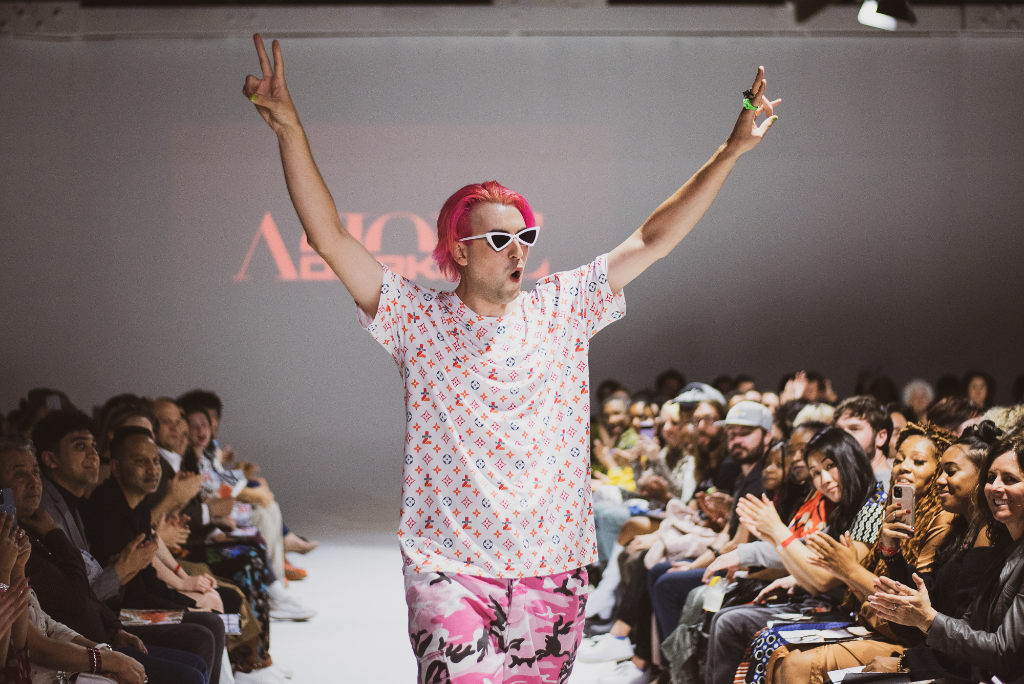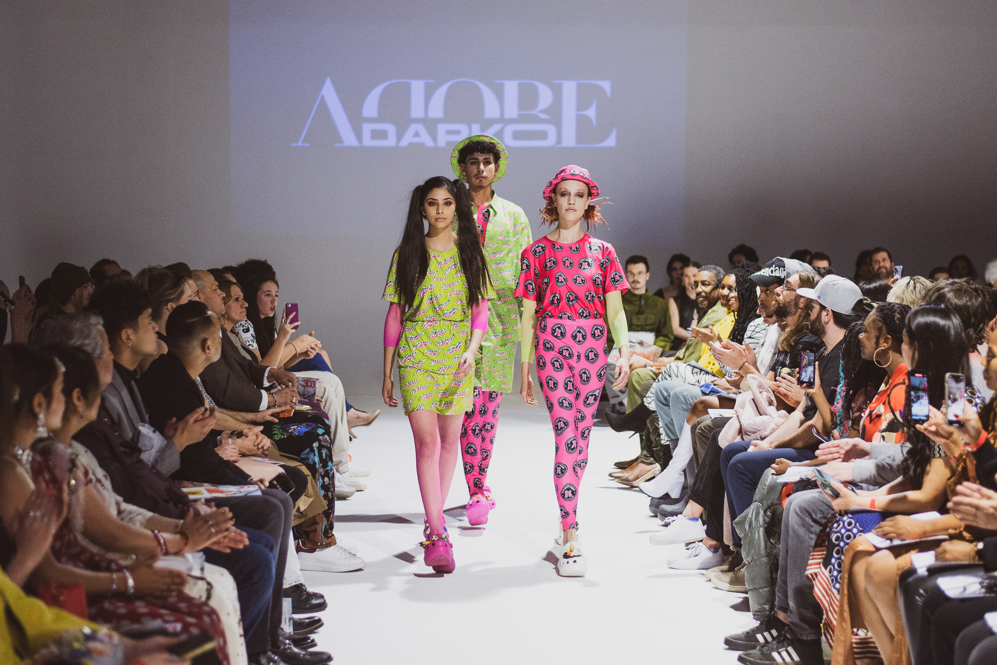 Nostalgia took over the runway with Adobe Darko’s vibrant streetwear collection. Twisting highly recognizable logos into designer brand names, each look evoked a sense of playfulness through vibrant neon tones.