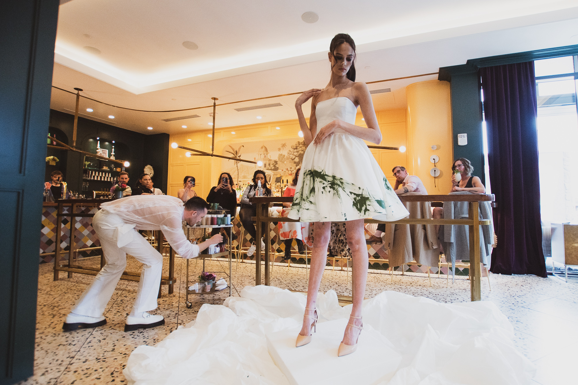 Gaeta intersected art and fashion through an immersive runway experience held at Room For Milly on April 24. With the help of event coordinator and Mainspring Brand Experience Manager Phil Hua-Pham, this event was far from any ordinary runway experience. Gaeta immersed himself in his designs to create three beautiful pieces.