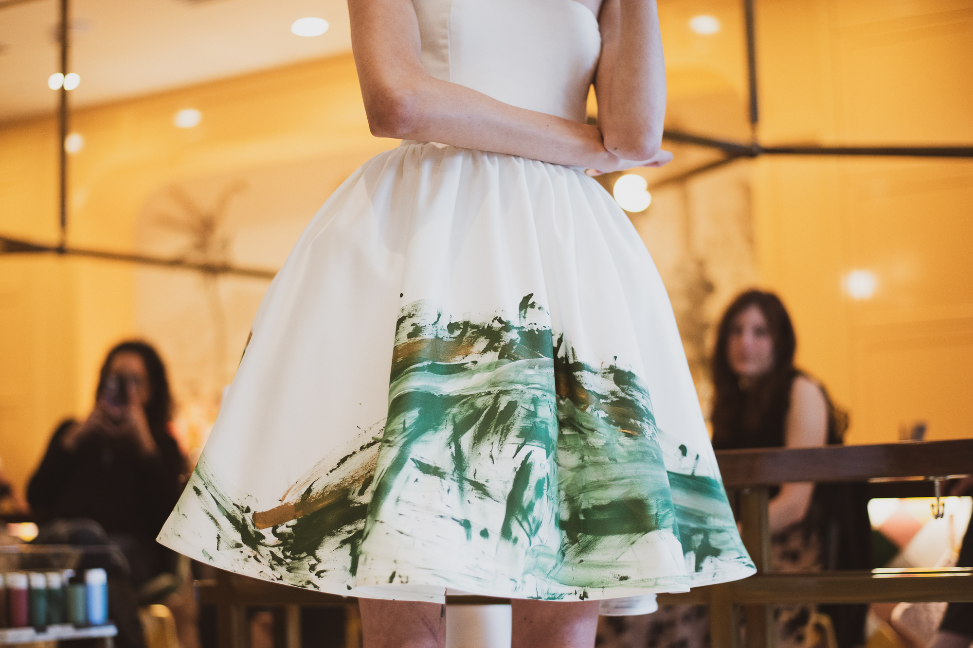 With the second model, he began by dipping his hand in a cup full of paint. After his hand was covered in green paint, the look was transformed into a piece of art. The second piece was a luxurious dress that was entirely handpainted by Gaeta. He made what looked like mountain shapes in a dark green color on the bottom of the dress. He then included other colors to add texture.