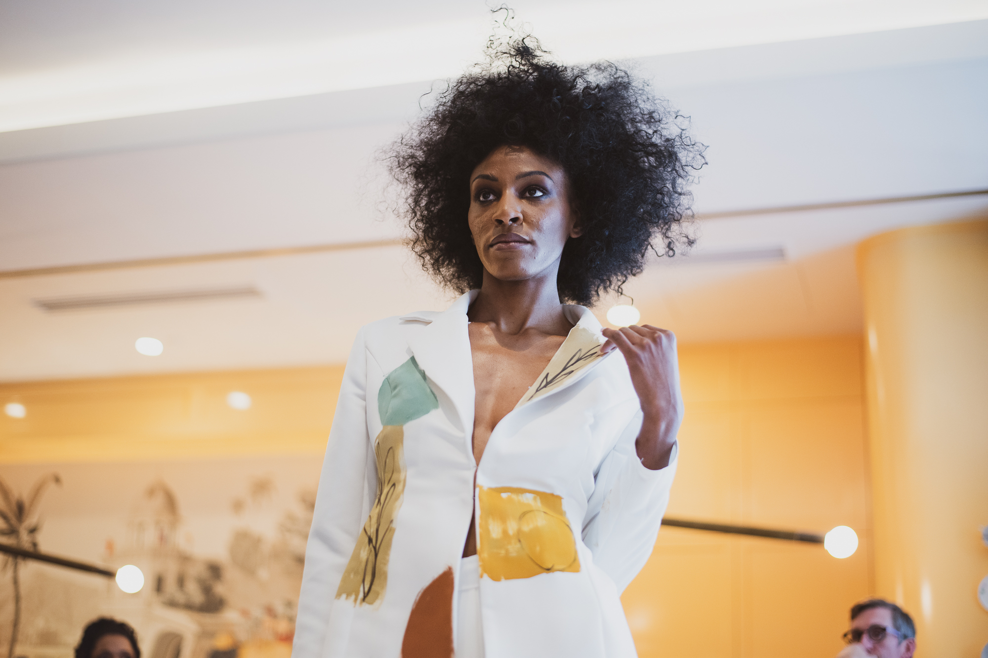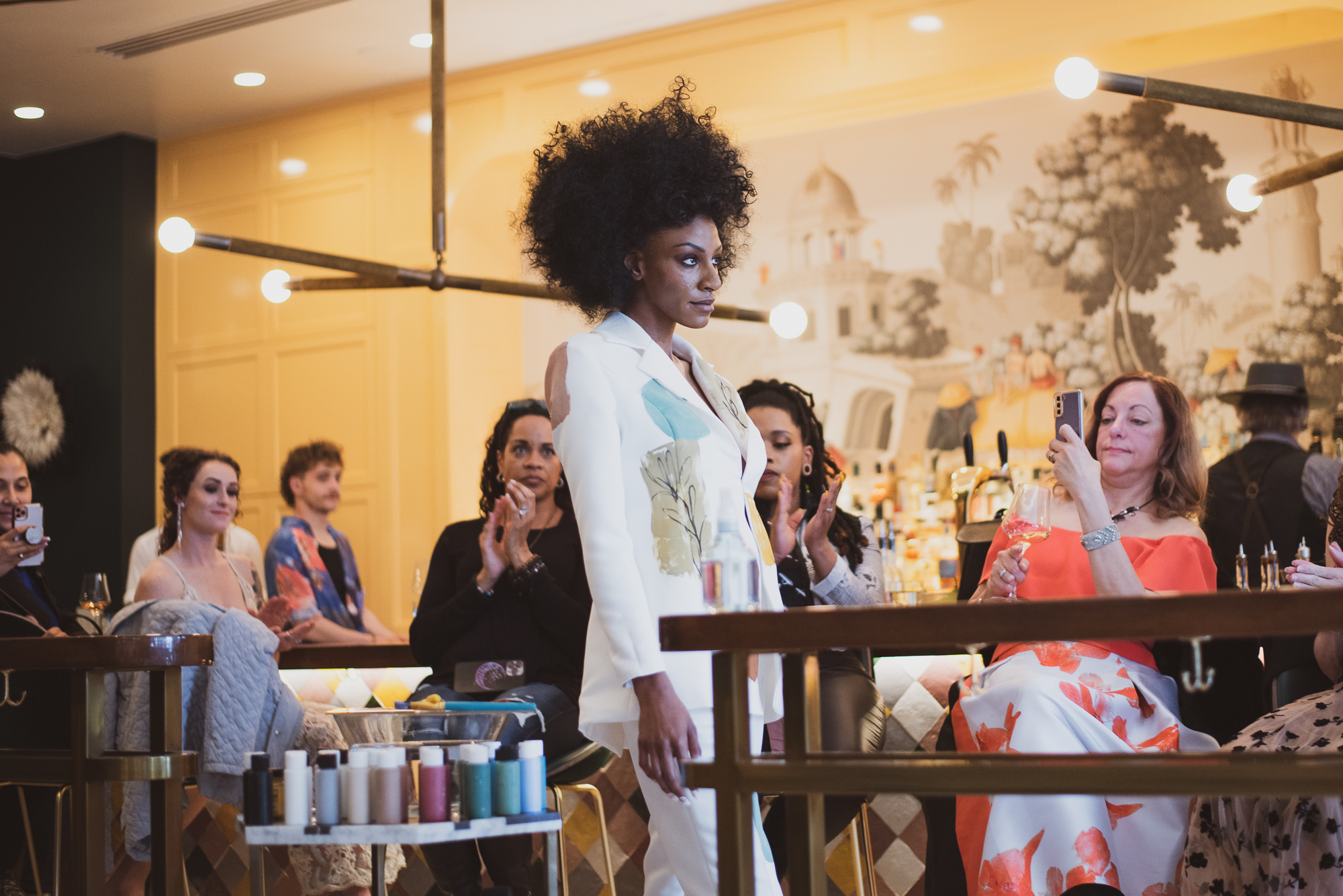 The show began very abruptly. Low music started playing and slowly grew louder to notify guests that the show was beginning. The first model entered the intimate space in a gorgeous pantsuit with a low neckline.
