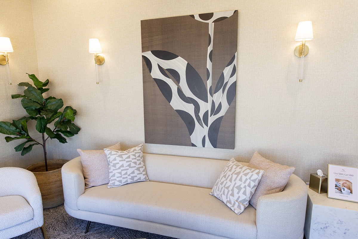 The new SkinSpirit office is designed with an emerald wall, playful textures and beautiful plants that bring the space to life. It emulates a warm and welcoming environment while maintaining the cleanliness and professionalism of a typical medspa.