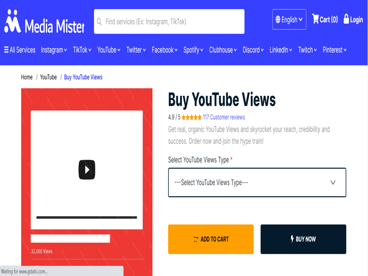 Next on our list is Media Mister, another versatile platform that caters to YouTube and other social media platforms. The online social media growth company sells authentic YouTube views and is easy to use. During testing, we realised their plans are affordable, and you might even get extra views.