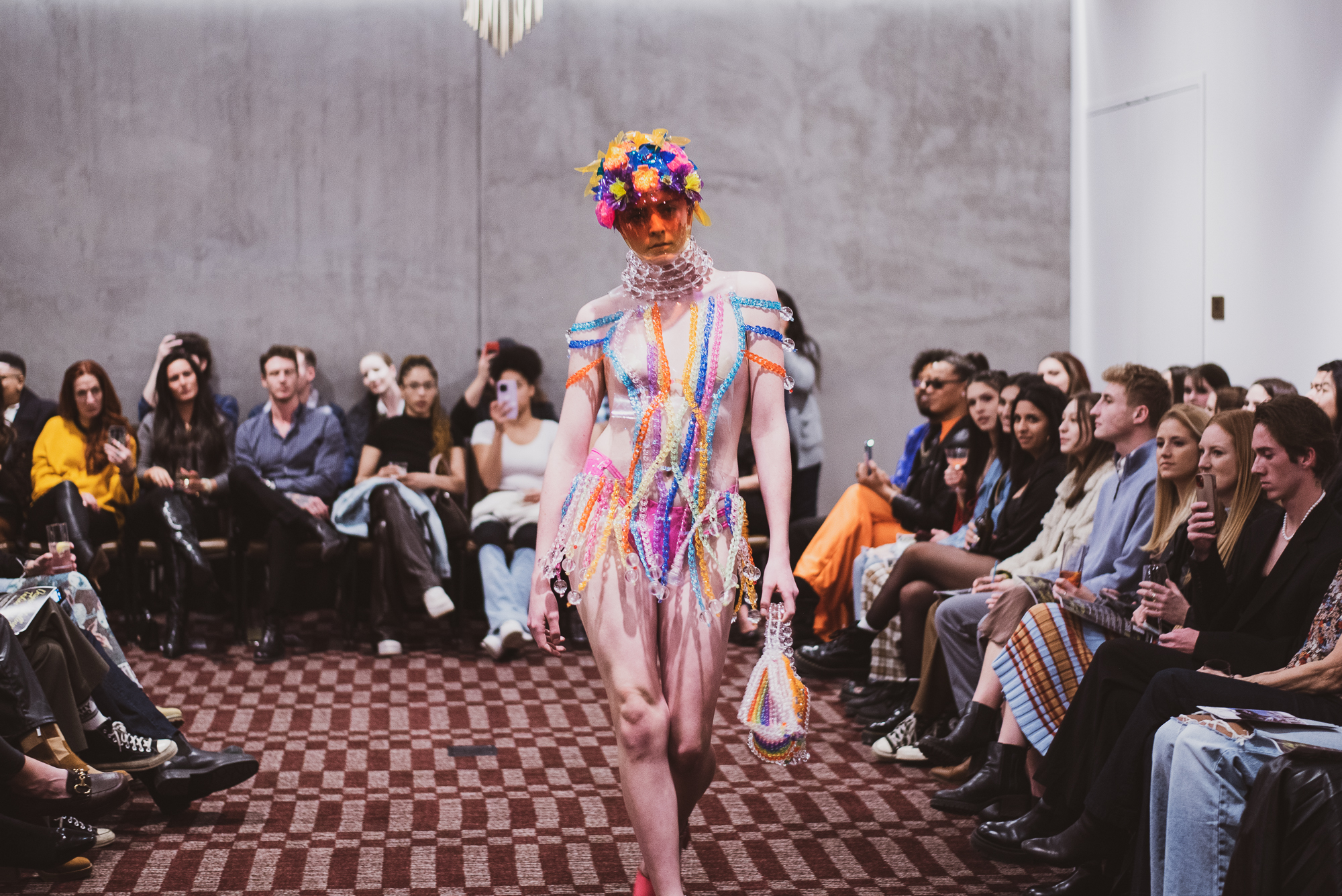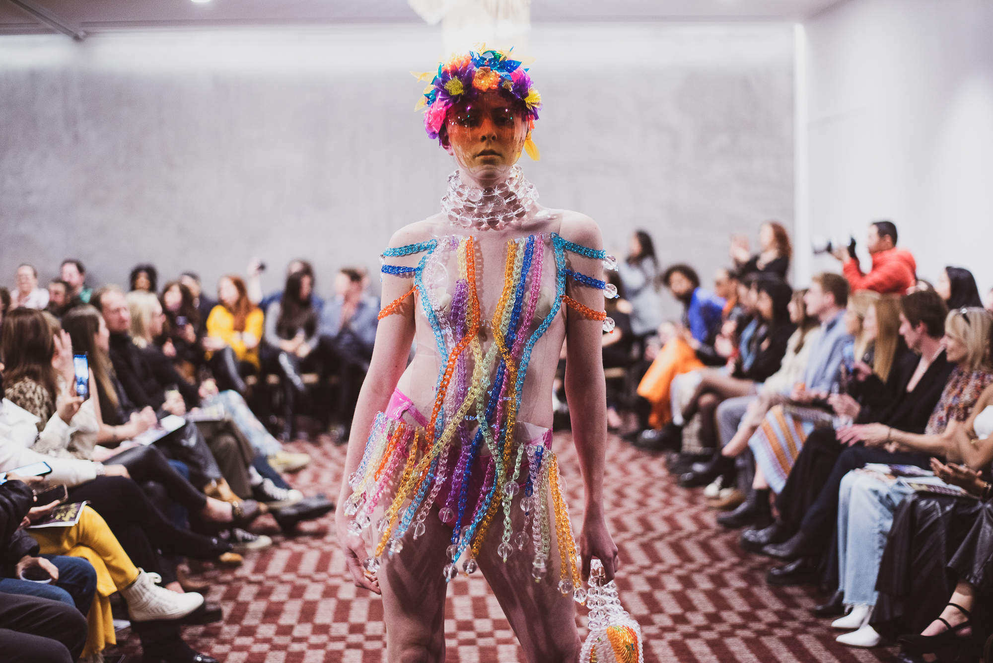 Bold, colorful, sheer — these are a few words to describe Brittany Schall’s La Adorna collection. While each look was extremely daring, the complexity of each look was one that left the audience in awe. Rainbow colors dripped from models head to toe and the vibrancy of the paper-like material made it nearly impossible to turn away. Hairstylist, Mae Jones took the extravagant garments and created hair pieces that reflected the flamboyant in the best way possible while also tying in the makeup look done by the designer herself.