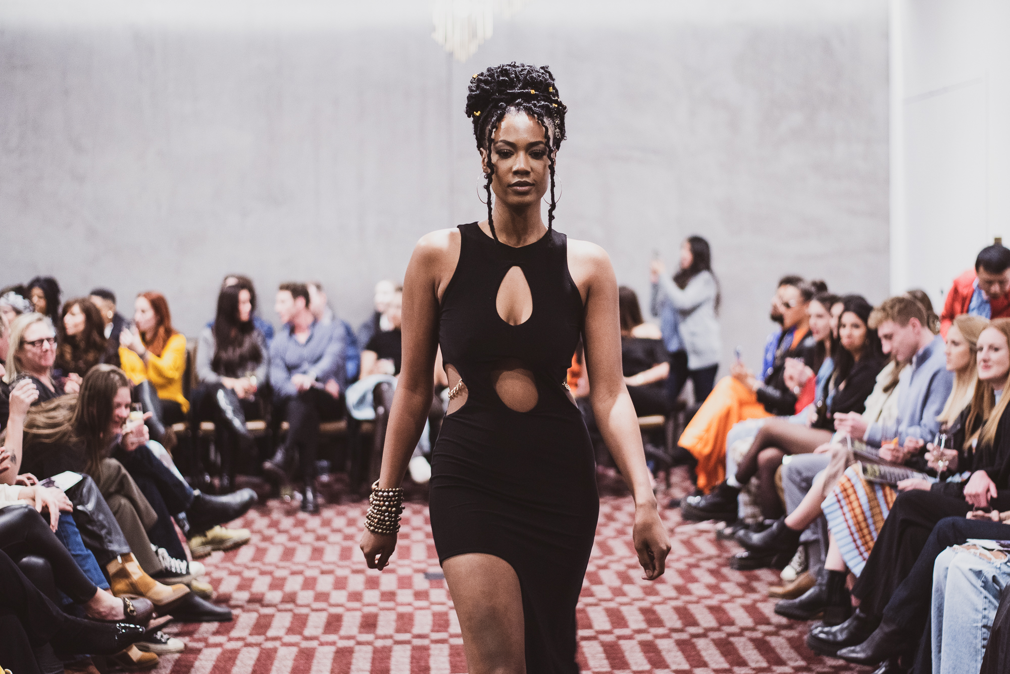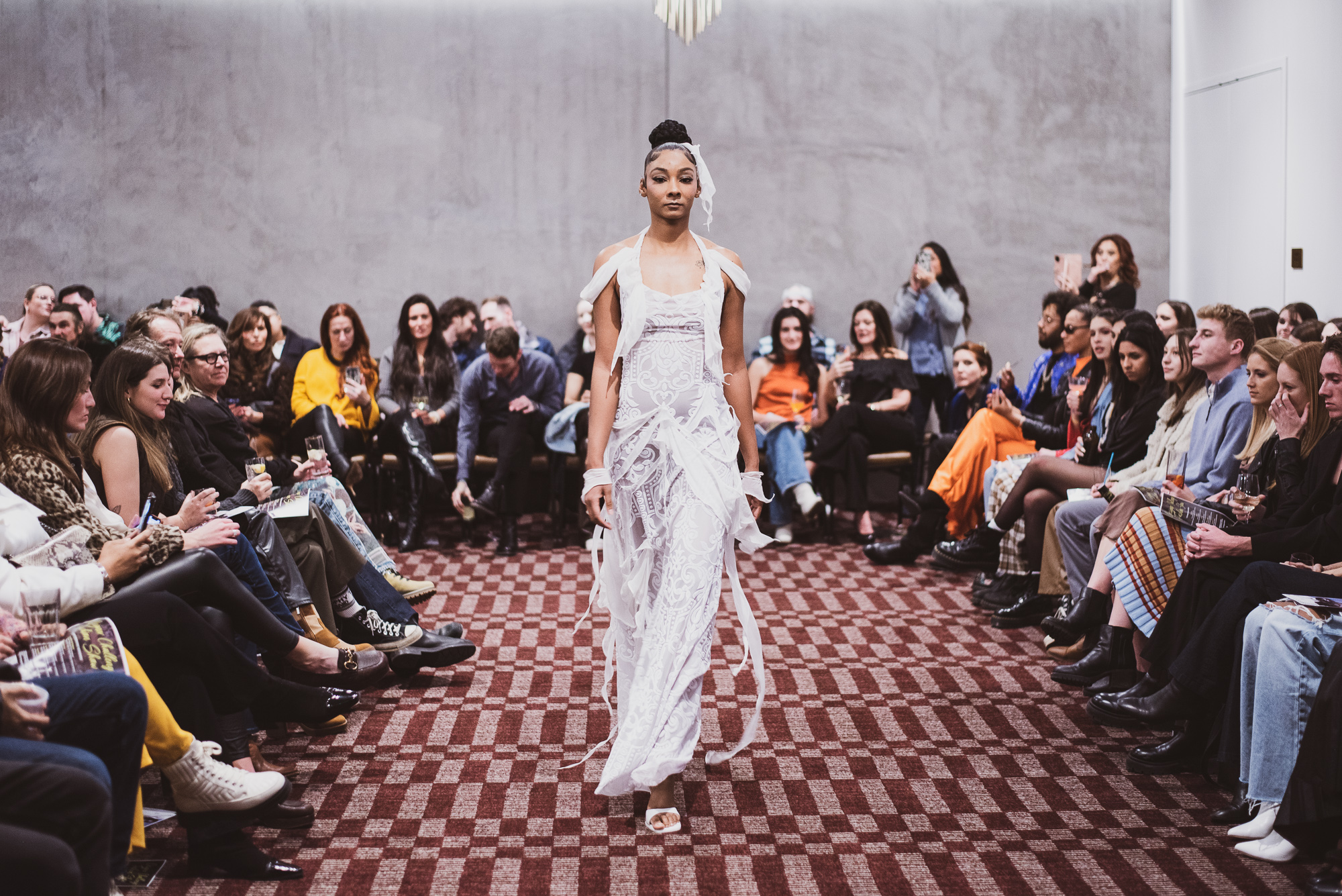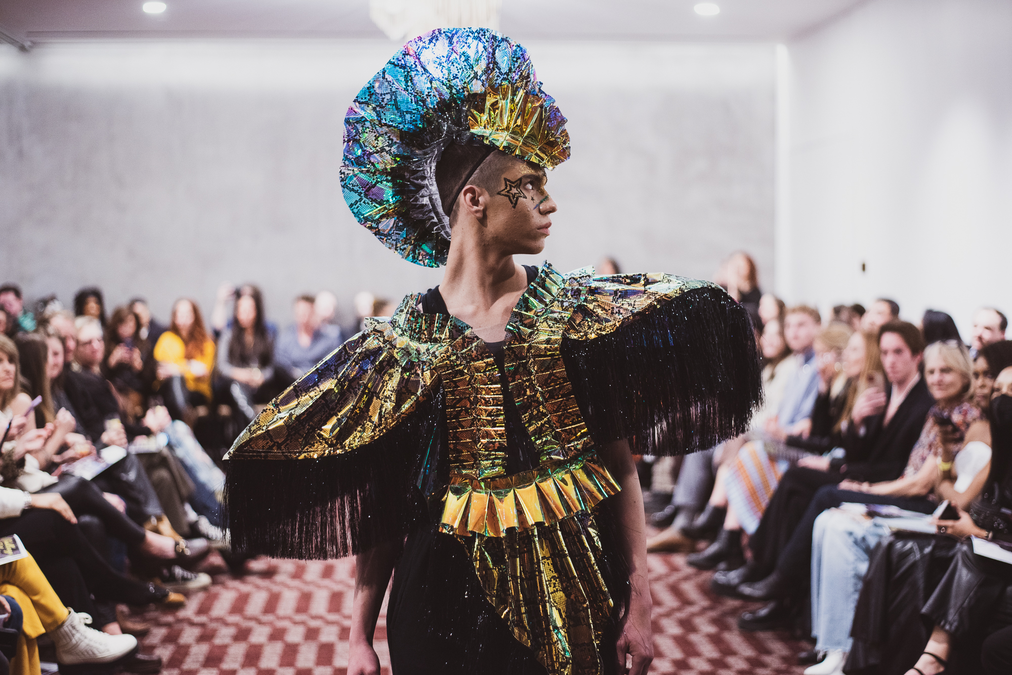 Designer Faye Ashwood of InspireD’Signs presented first. Whether it be the fabric dangling from the model’s arms or the texture of every look, it was evident that each intricately detailed garment was carefully crafted. The flowy and velvety fabrics brought a mystical illusion to the runway — it’s no wonder why InspireD’Signs was a judge’s favorite. While the clothes spoke great volume, the hair done by Darrel Dewit and the makeup created by Sienna Guerrero perfectly encapsulated the fine garments.