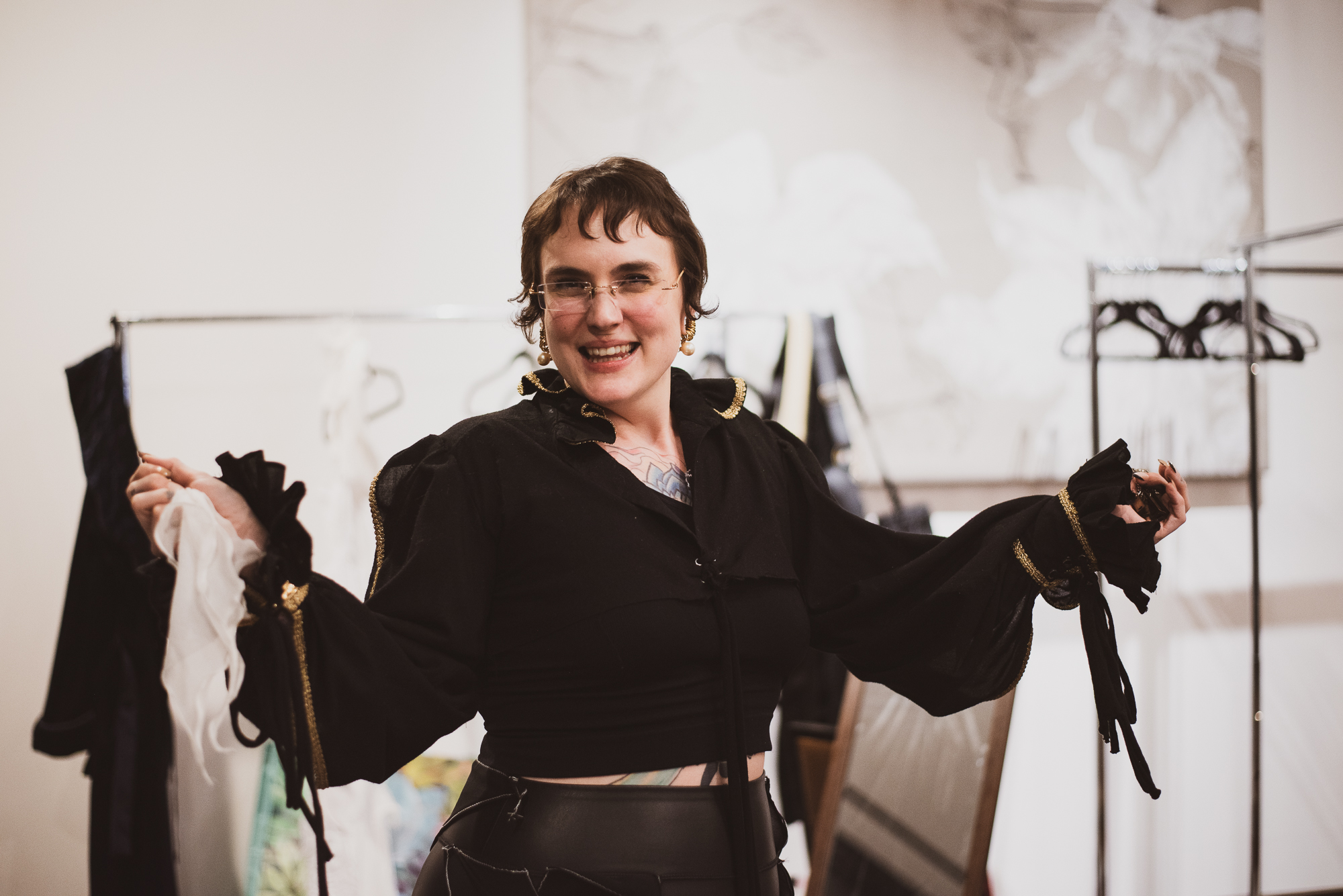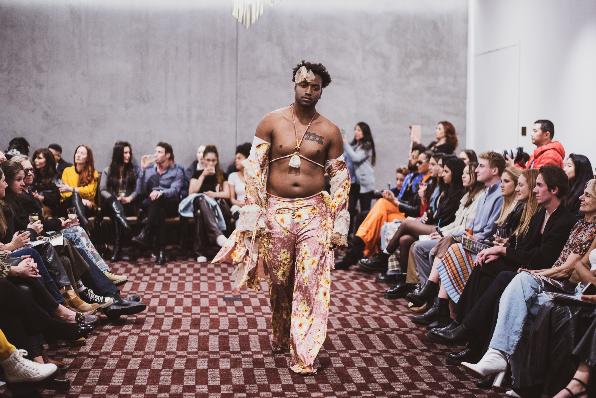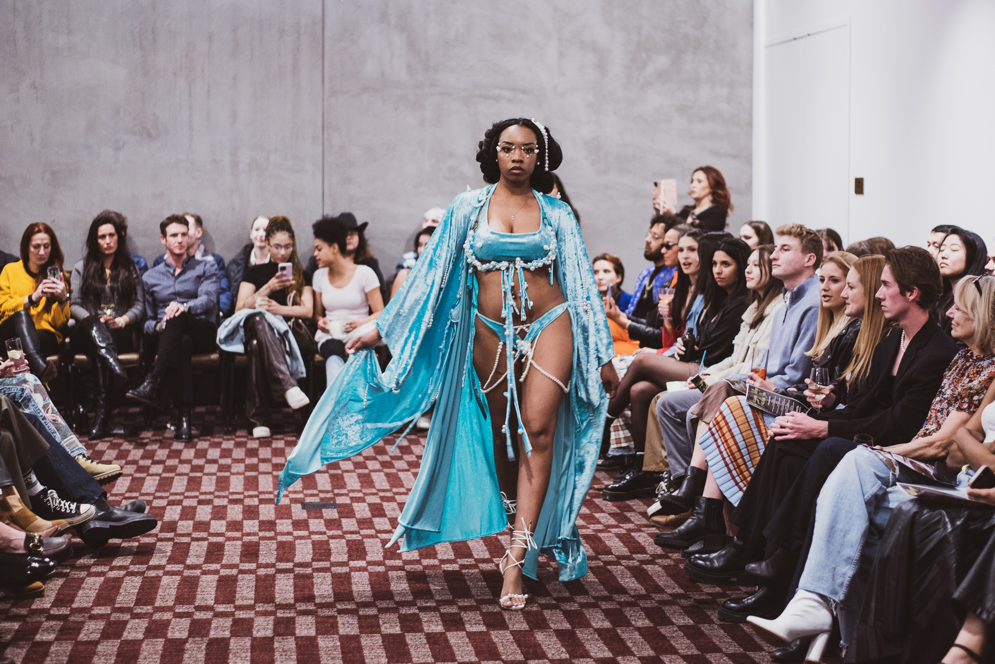Designer Faye Ashwood of InspireD’Signs presented first. Whether it be the fabric dangling from the model’s arms or the texture of every look, it was evident that each intricately detailed garment was carefully crafted. The flowy and velvety fabrics brought a mystical illusion to the runway — it’s no wonder why InspireD’Signs was a judge’s favorite. While the clothes spoke great volume, the hair done by Darrel Dewit and the makeup created by Sienna Guerrero perfectly encapsulated the fine garments.