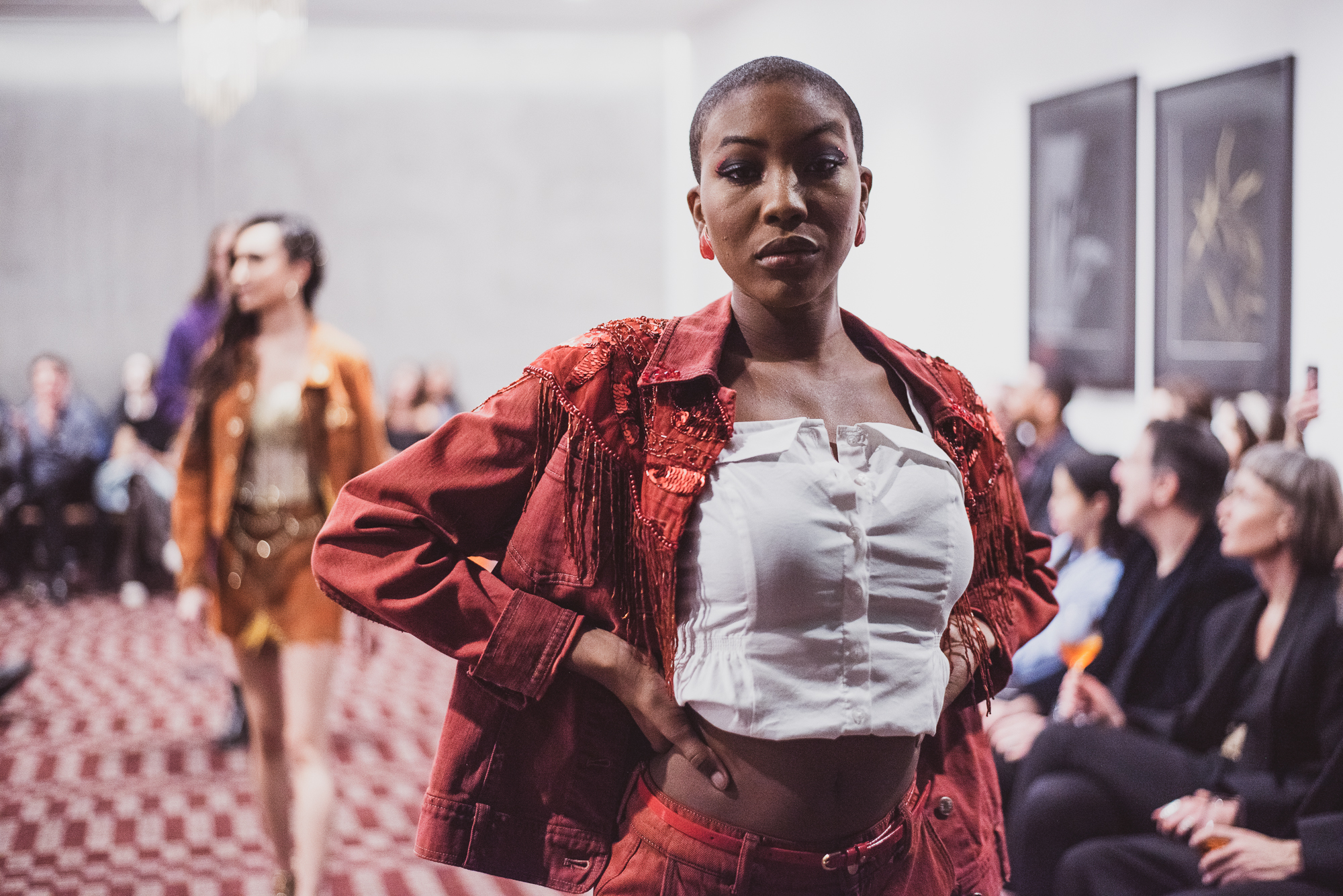 Upcycled designer Rachel Hazelwood combined streetwear with glamor using denim and sparkles. Whether it be a tie dyed denim set or a string of sparkles handsewn, every look was intricately crafted. Though denim may seem redundant, Hazelwood proved that denim can be more than just typical blue. She combined bold colors with traditional chic monochromatic looks. Hairstylist Sara Zask took the ruggedness of the outfits and applied it to each hair look by intertwining the same sparkles seen on the outfits in each model’s hair. Similarly, makeup artist Donald Teran created dark eye looks emphasizing the boldness of each outfit.