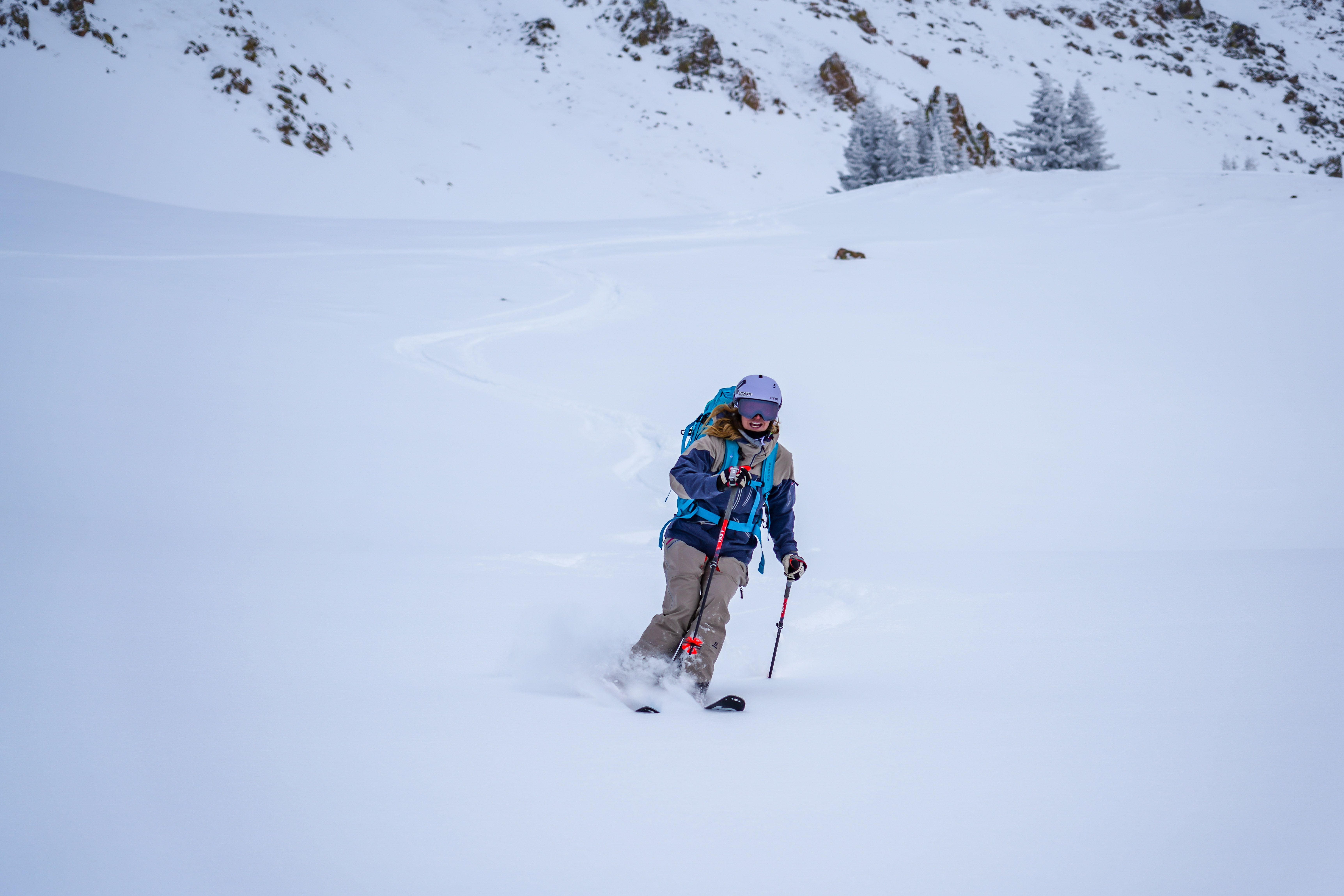 That untracked terrain and fusion of adventure and skiing are what make Cynthia Johnson so passionate about the backcountry. Johnson grew up in Denver and began skiing as soon as she could walk. She skied for different clubs in Vail and eventually became a freeride athlete where she participated in Big Mountain competitions for around six years. During that time, she was inspired by the guide safety crew at competitions to become a guide herself.