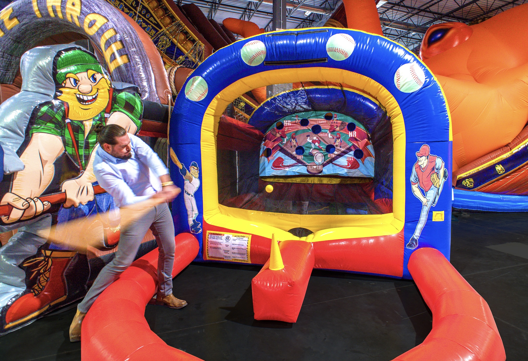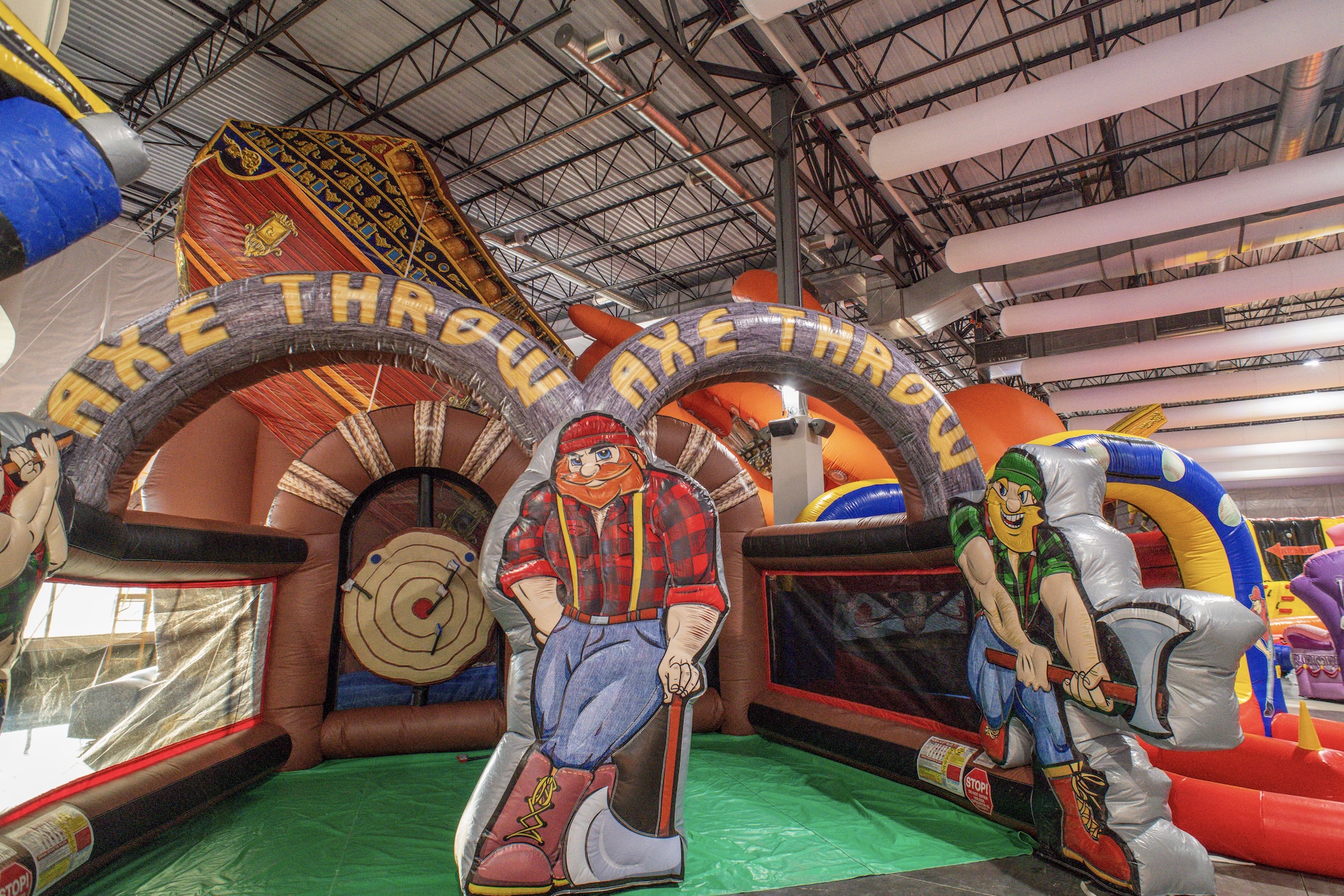 Included in the inflatable games and competitive sports available at Bounce Empire are a Viking Axe Throw, 21-foot-high Soccer Darts, King of the Mountains, Air Racers, Human-Sized Billiards and Ultimate Boxing.