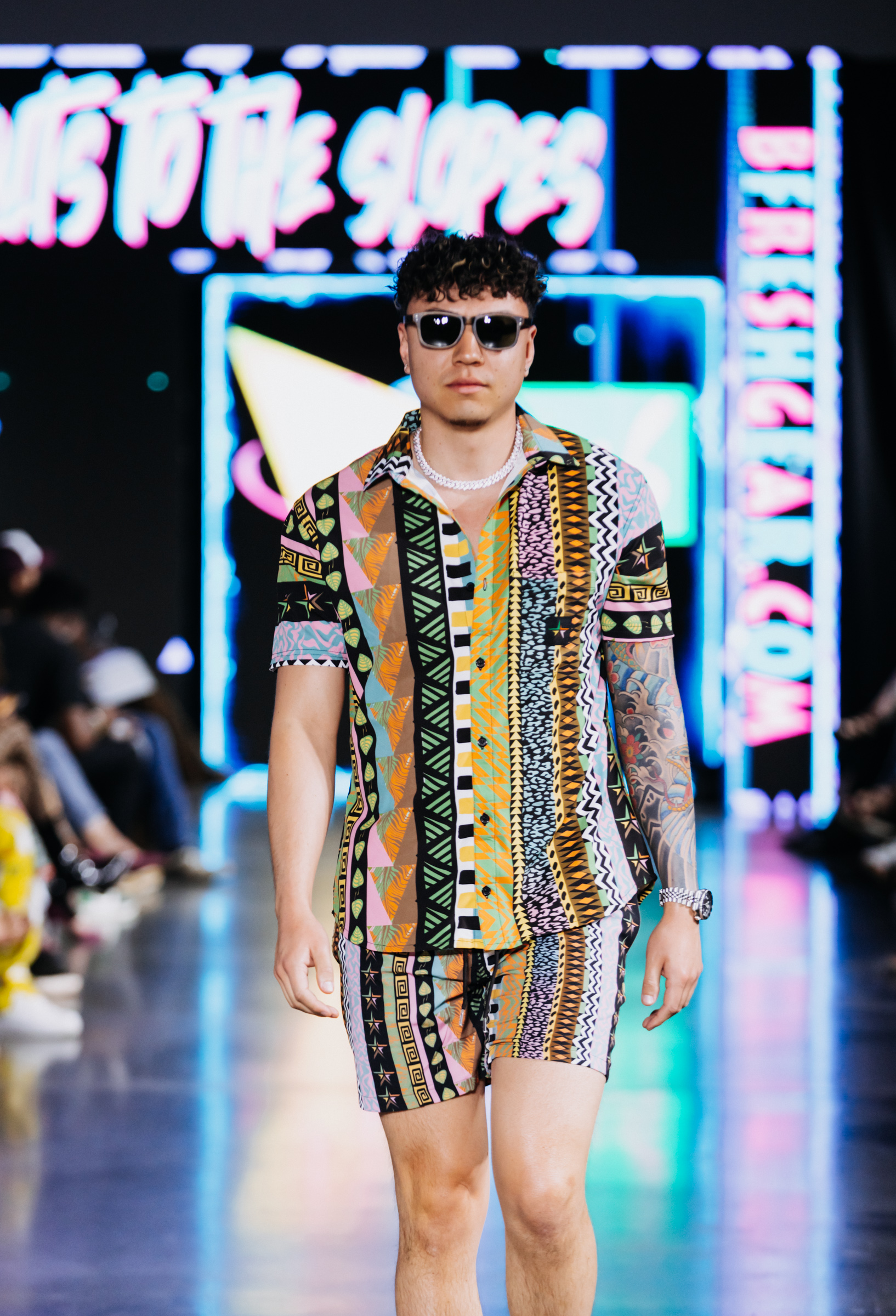 Created by Brian McBroom, B Fresh Gear sends viewers back through time to the colorful, maximalist 1980s with its bold designs. The retro-themed brand brought all-over prints from head to toe, resembling all-too-familiar geometric patterns iconic to the 90s’, as well as duo-toned tiger patterns, flamingoes and even paint-splattered designs. Over the course of their collection, it became clear that the men’s and women’s collections were coordinated together, creating effortless complimentary boat attire for men and women. The Colorado native explained the collection as, “A hybrid of cabana wear and couples matching outfits. Our joke is that you can match your significant other, and when he pisses her off she can go change.”