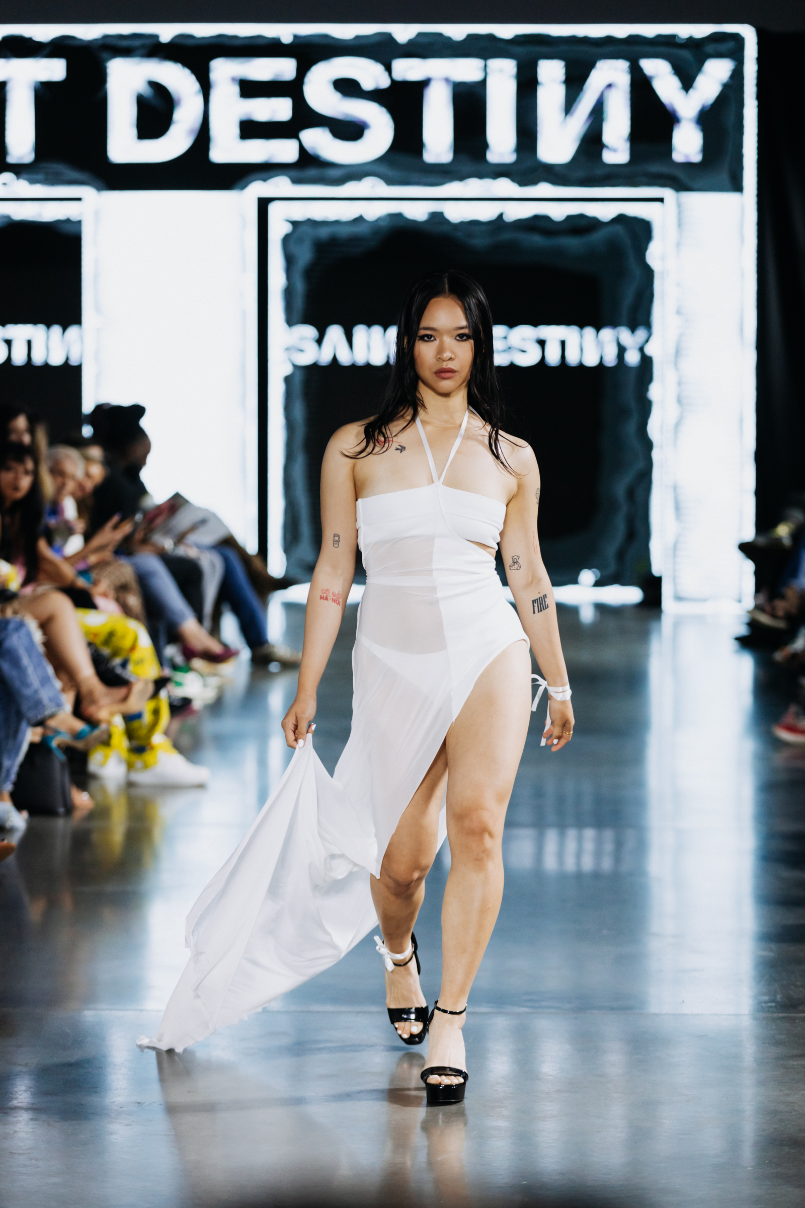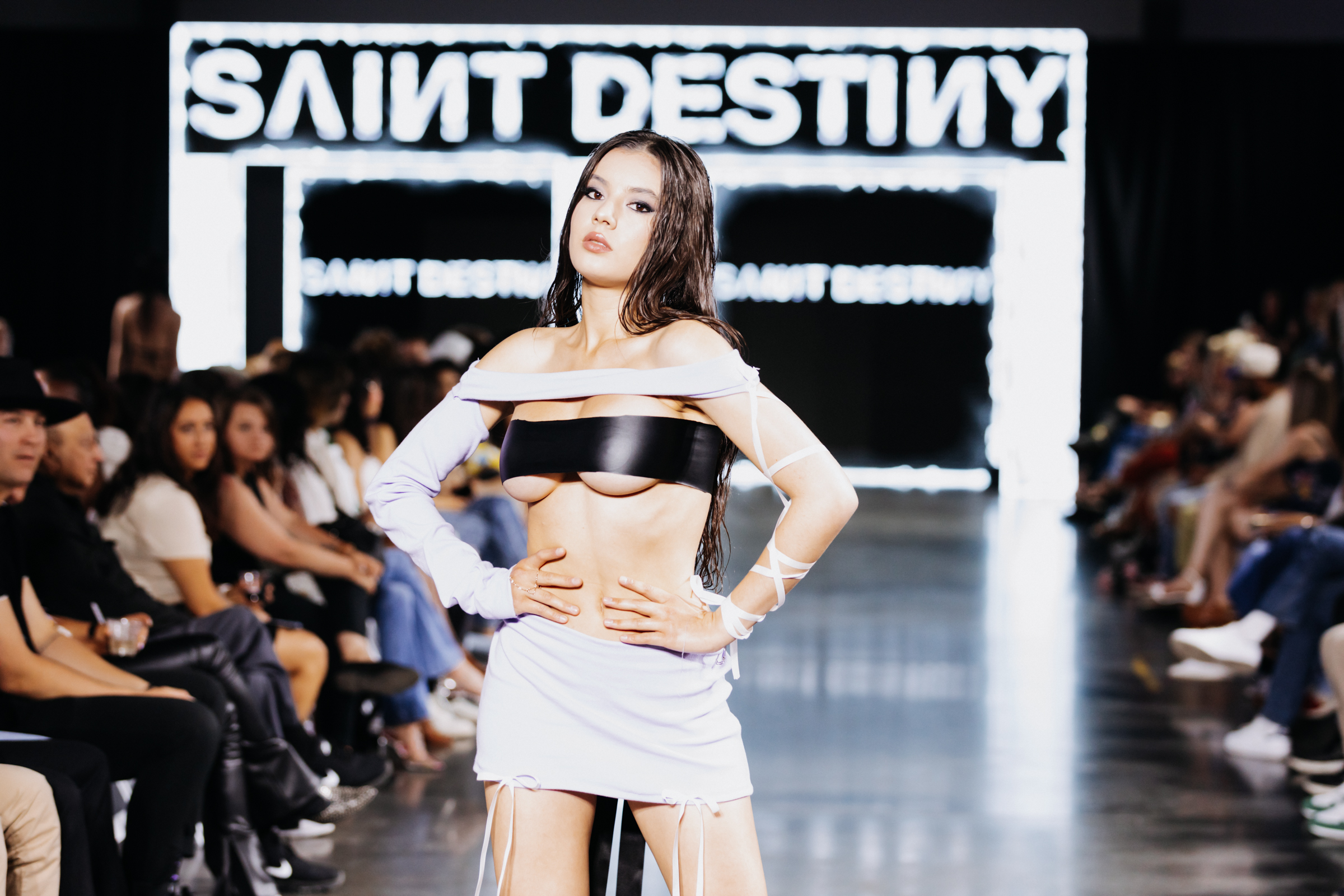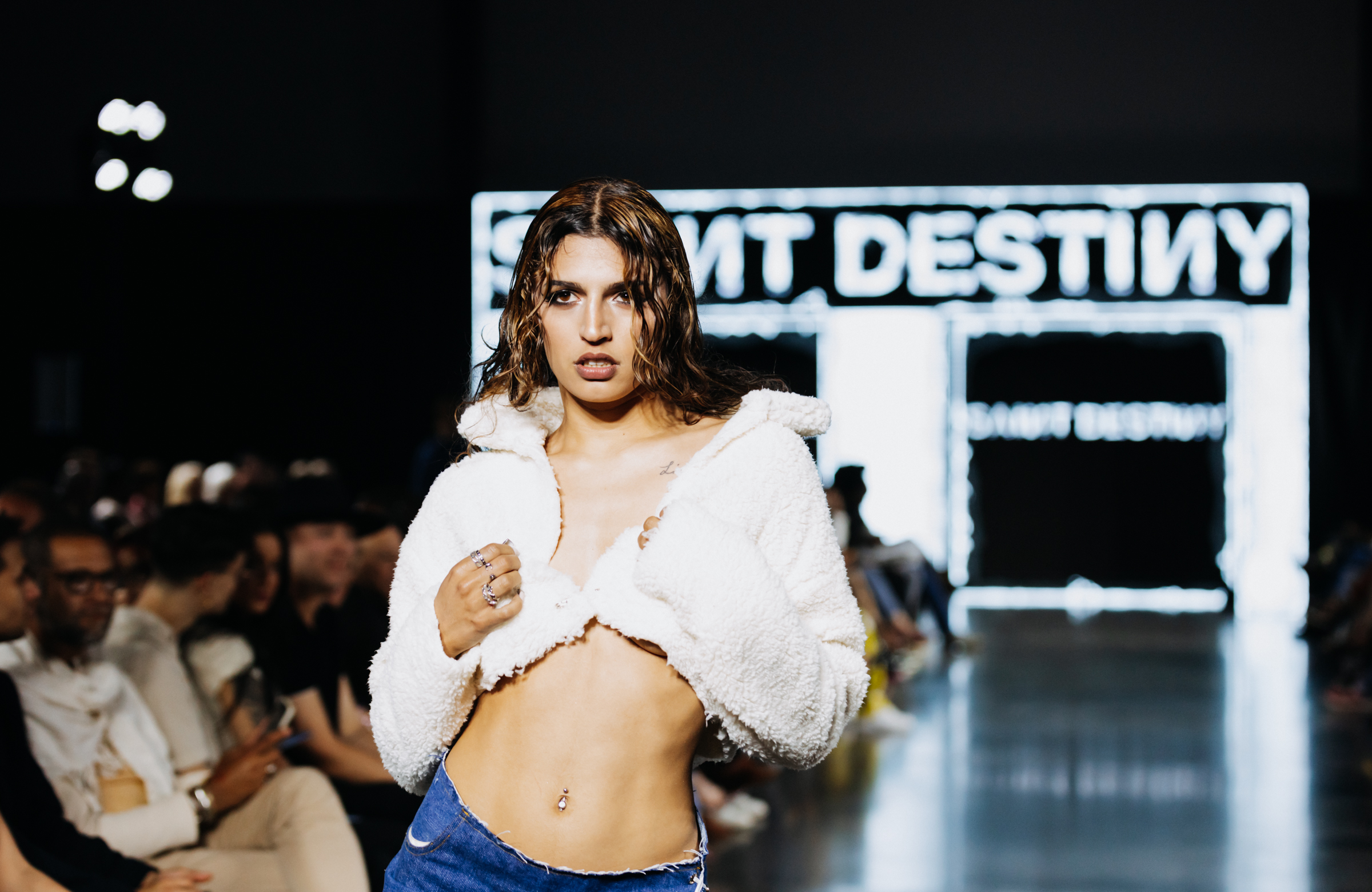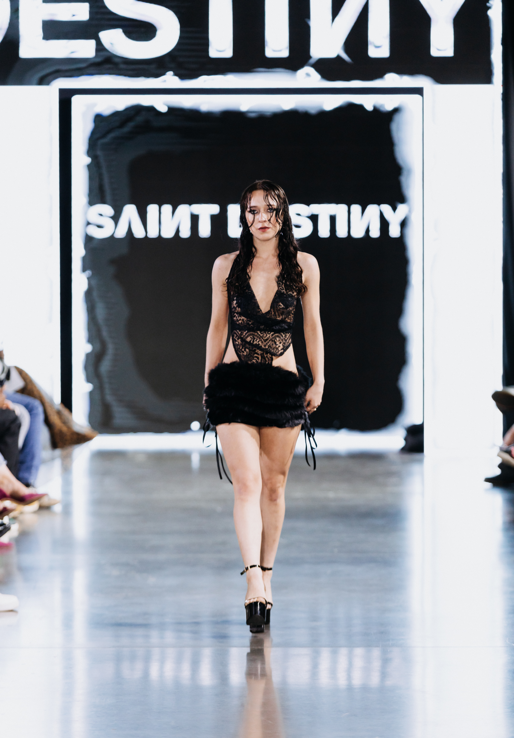 Saint Destiny brought a sexy yet whimsical femme fatale collection to the stage. The experimentation and blend of textiles and colors paired with a wet hair look and black eyeliner gave way for the collection to border on the line of innocence and allure. Pastels, white dainty ribbons, and frilly socks juxtaposed the distressed denim and black lace, latex and fur elements. Designer Jennifer Saint-Fort described the collection as being, “based on nostalgia, like with the toys you played with, like Bratz and Barbie, so it’s super fun and dress-uppy.”