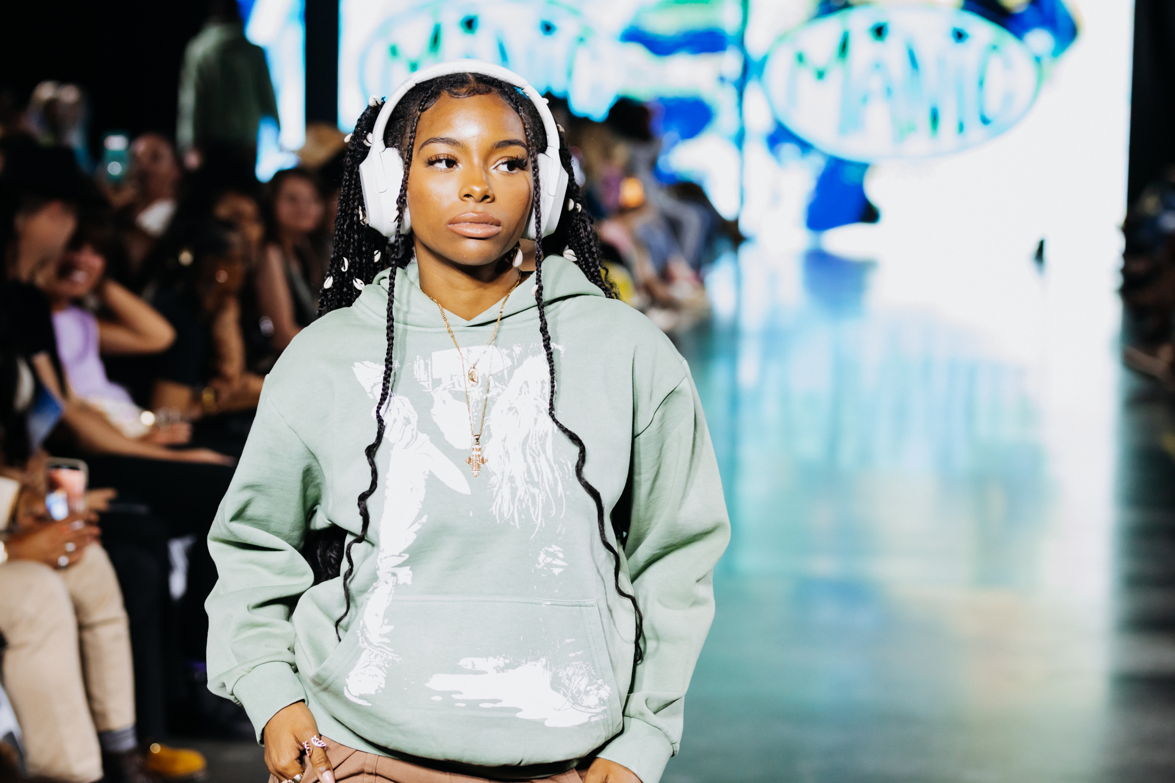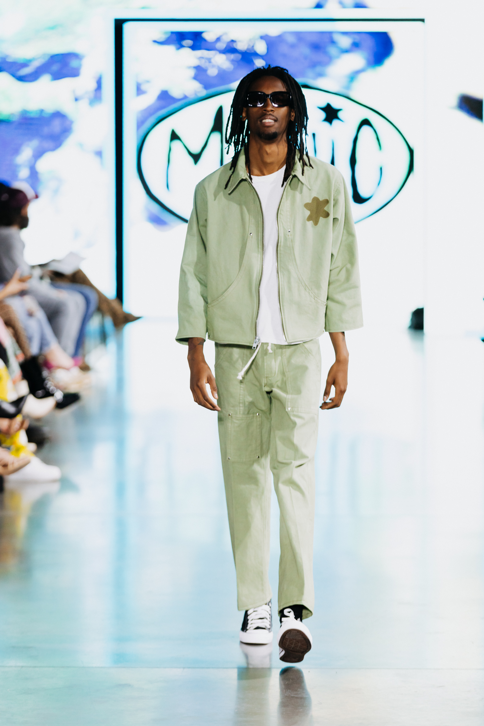 Manic Studios kindled a skate and street style not only to their garments but to the entire runway environment. With the lights down, visuals of the brand logo and the Earth spinning built up the tension for a beat drop and the first designs to come out, a gray carpenter pant and jacket set with intricate pocket details and a signature organic shape of fabric on the breast pocket area. Designer Griffin Connolly described his influence of being a skater for ten years, and these practical but individualistic designs can attest to that. One of the most notable looks from the brand was black straight-leg pants customized with purple and white abstract flower silhouettes and a khaki-colored hoodie that said, “I told you I was Manic” in a hand-drawn font.