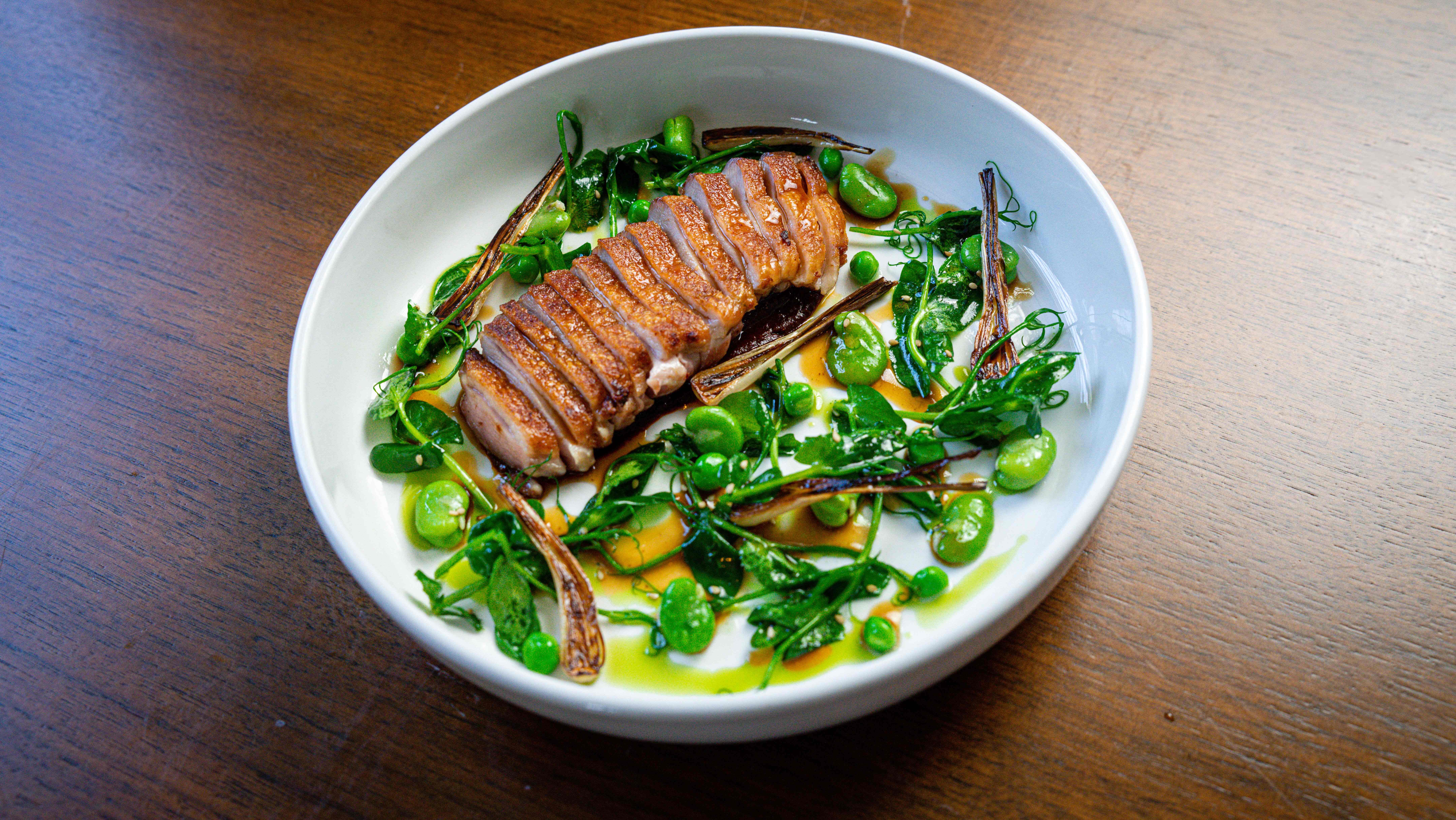 Some of the highlights of the new menu include a seasonal bouquet inspired by the flowers and vegetables grown at the Esoterra Culinary Garden. “We highlight some of our favorite leaves and blossoms from our favorite farmers,” said chef de cuisine James Gnizak. “We bundle these ingredients together with pickled rhubarb to resemble a bouquet, served alongside a green goddess dressing based with sunflower milk and all the herbs we can get our hands on. We add smoked trout roe to the mix to incorporate oceanic saltiness, which rounds out the dish.”