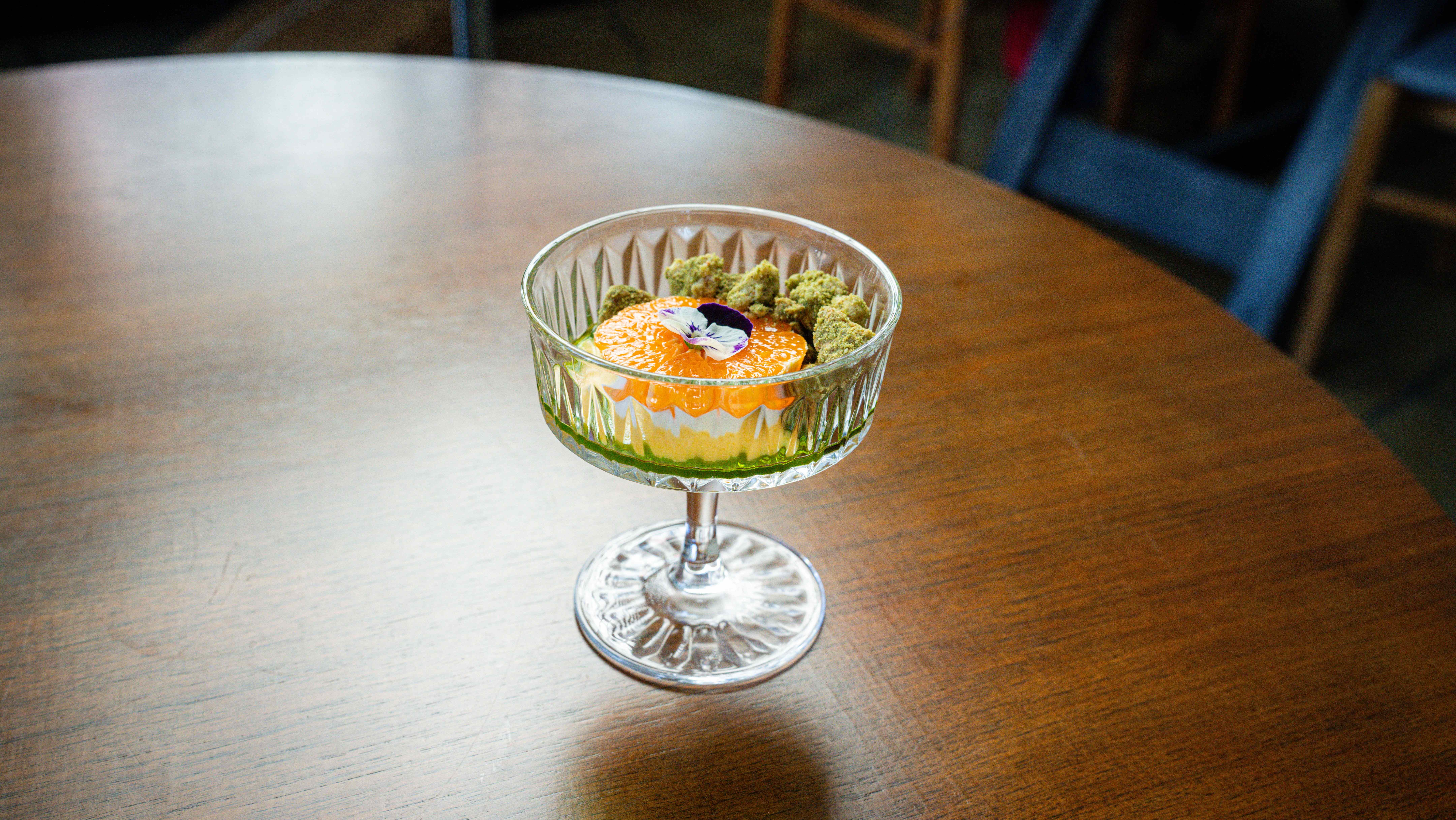Gnizak explained a bit about the construction of this complicated delicacy and stated, “We start with a yuzu/passion fruit curd at the base (think of a Flintstones push pop you got as a child). We add some holy basil oil to add a little extra depth and floralness to the dish. The matcha streusel brings a bit of texture and a bit of a savory aspect. Matcha has a bit of bitterness, so we add a bit of salt to the streusel to balance everything out. This dish is filled with many textures and flavors — a subtle reminder of early summertime freedom.”