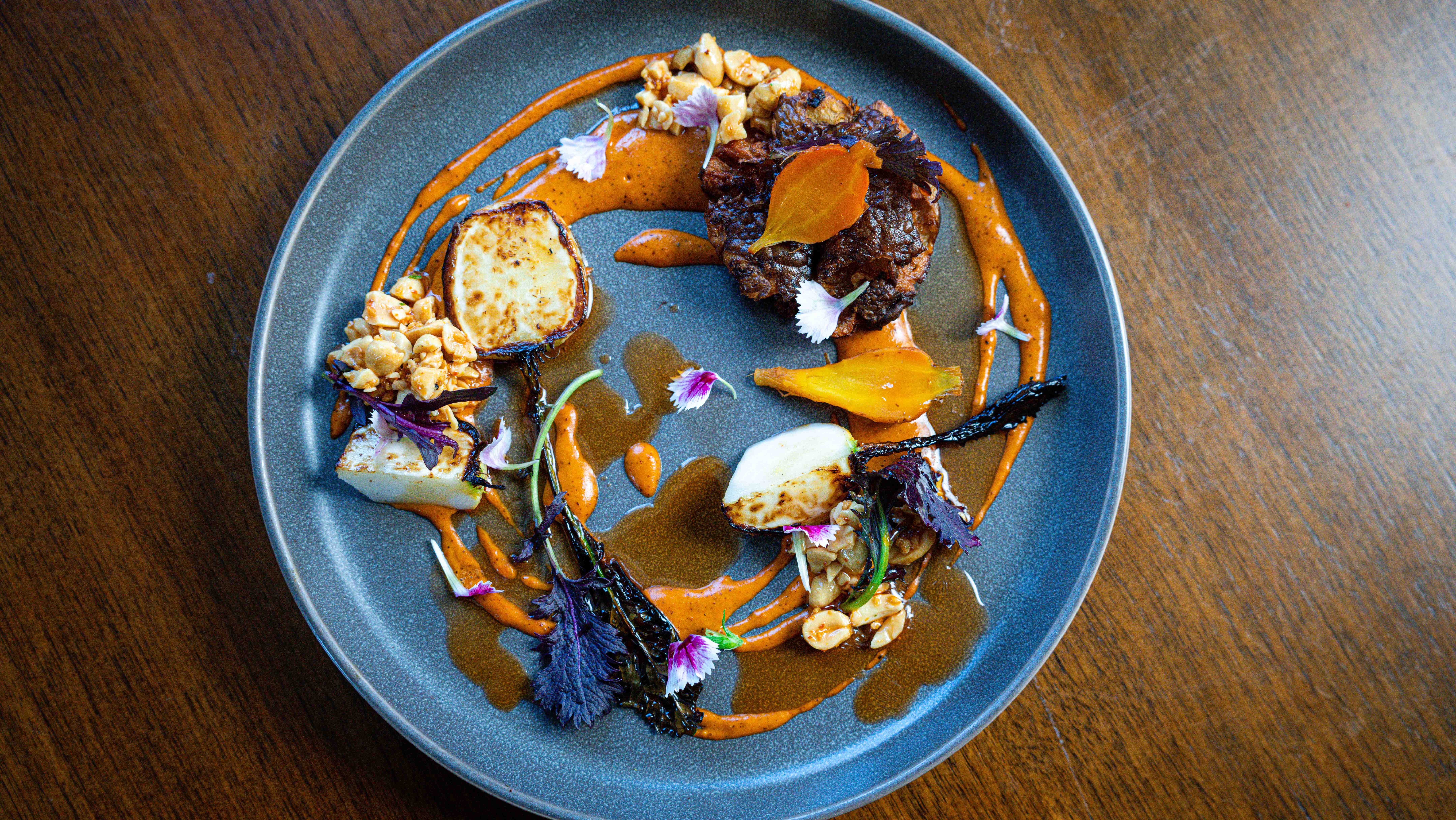 It also has a roots course, which features the Hakurei turnip and Mokum carrot, both surprisingly sweet due to how they are grown in cold temperatures with sugars packed into the root so they do not freeze. Accompanied by a kare kare sauce made with carrot juice, peanuts and annatto and finished with lobster butter, this dish incorporates various elements to showcase a depth of flavor while presenting a new way to enjoy root vegetables.