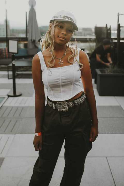 The modernity and edgy streetwear combination of Okime’s designs were eye-turning, and something never before seen on the runway. Okime also does custom designs and patchwork at the request of her clientele. All of her work is also completely thrifted and sustainable.