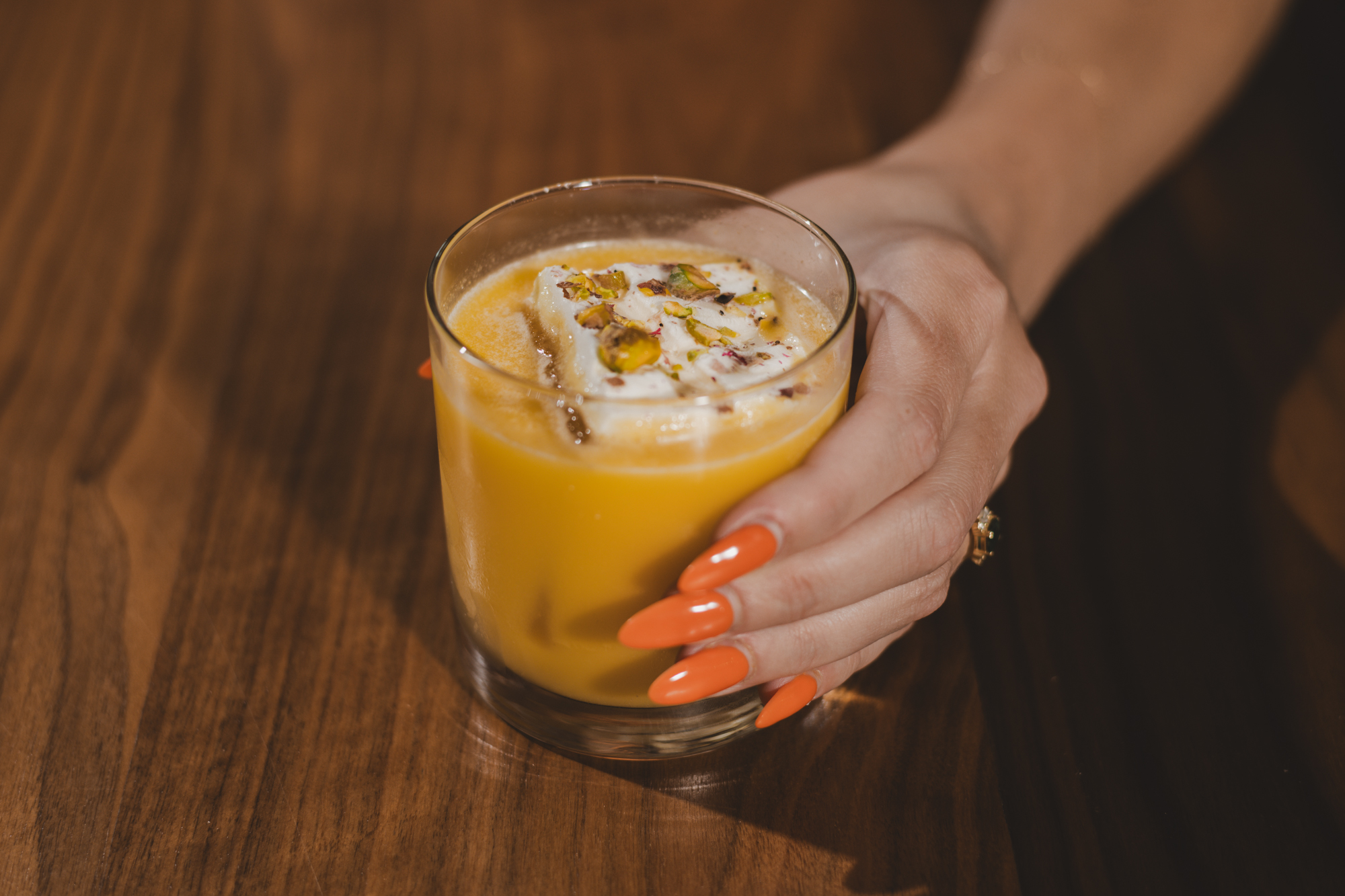 Other favorites on the fat-washed menu include the Passion Mousse — with butter-washed Citrus Rosé Gin, passion fruit mousse, velvet falernum, lemon juice, apricot bitters and aquafaba — and its Mango Lassi, made with pistachio-washed Blood Orange Gin, mango purée, lime juice, cardamon bitters, house yogurt liqueur and saffron rose water, topped with the most beautiful pistachio garnish you’ve ever seen.