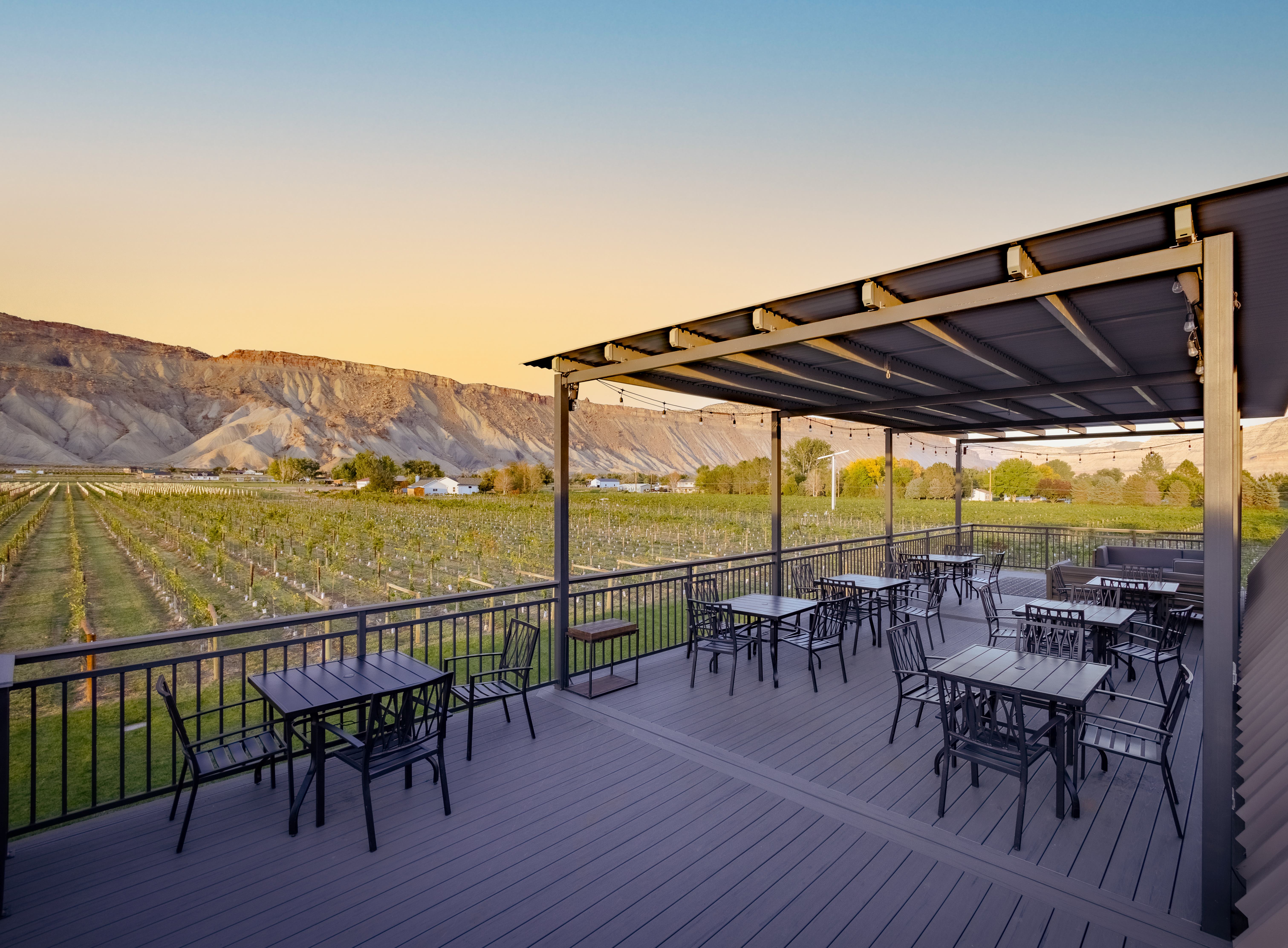 Clearly, this idea took off as they opened four tasting rooms, with the Palisade location ranked 6 out of 10 in USA Today’s “Best Wine Tasting Room” list. Found at 4,742 feet above sea level, this gorgeous vineyard and winery is surrounded by the Book Cliff Mountains with an outside patio with a prime view of Mount Garfield. “The goal with Palisade was to embrace what was great about that location. Having that desert location with a rooftop patio helps to focus on why people are in Colorado – to be outside and to provide a place to hang out other than a brewery.”