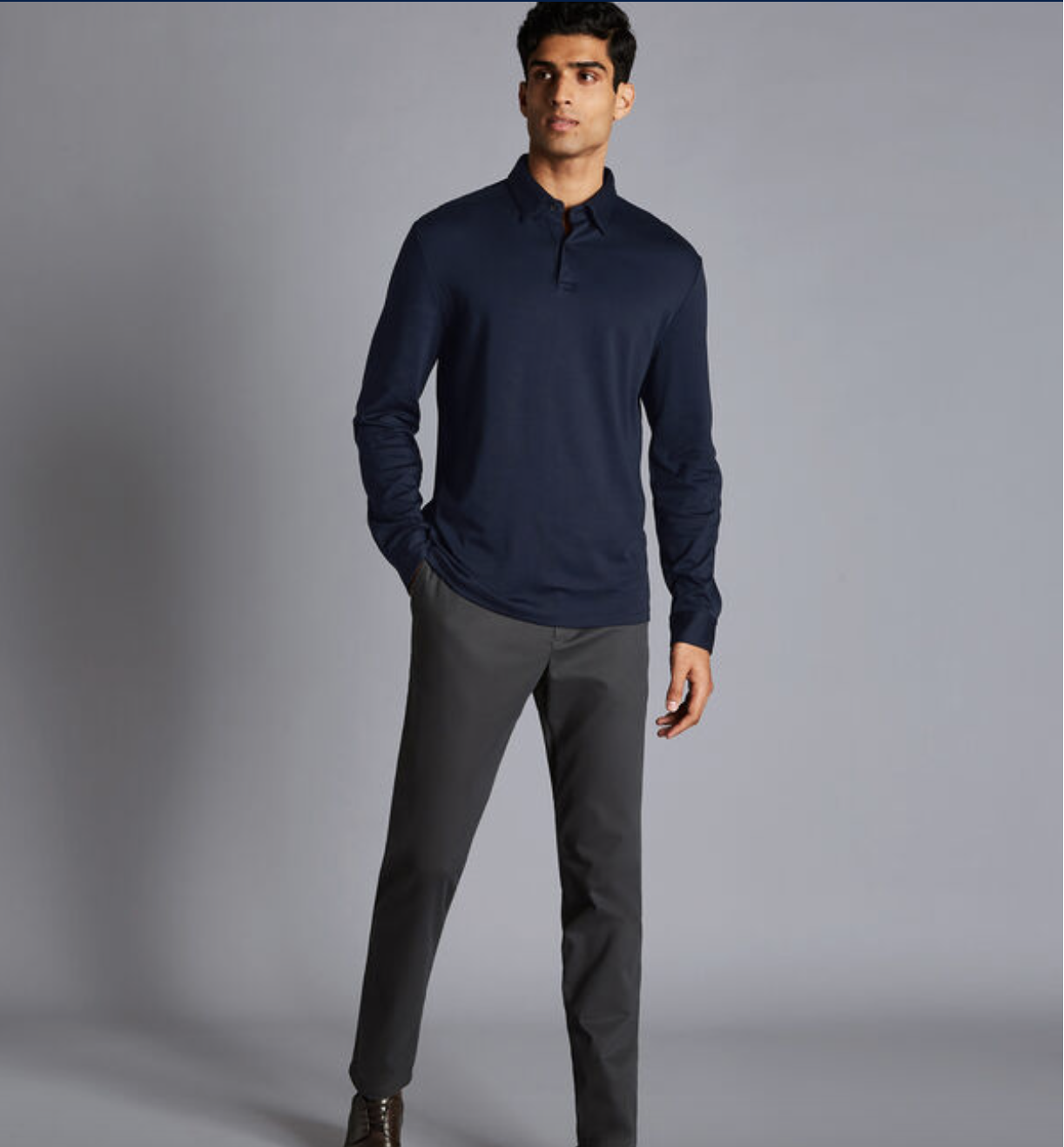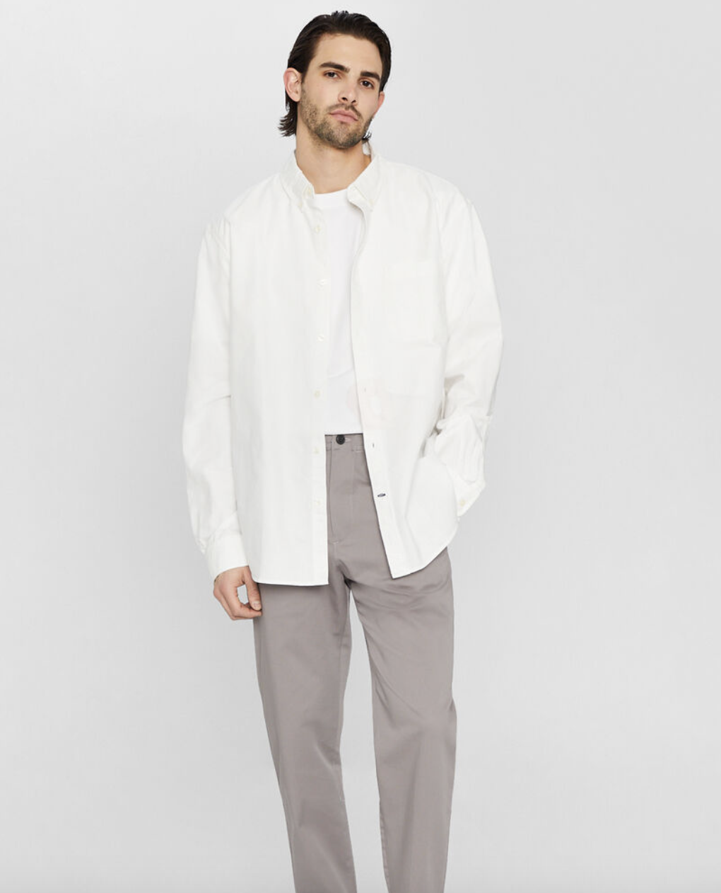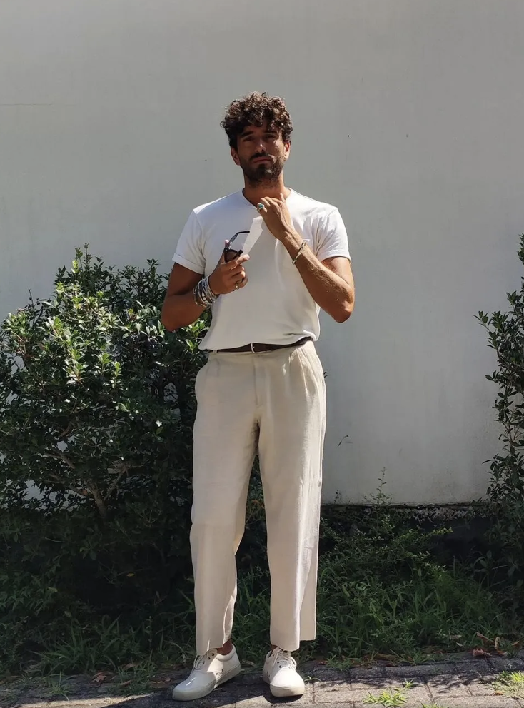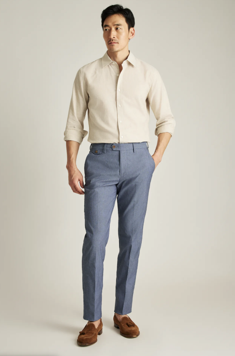 This can either be dressed up or down depending on what shirt and accessories are paired with it. For a more casual vibe, a simple T-shirt and jacket also pair very nicely with chinos.