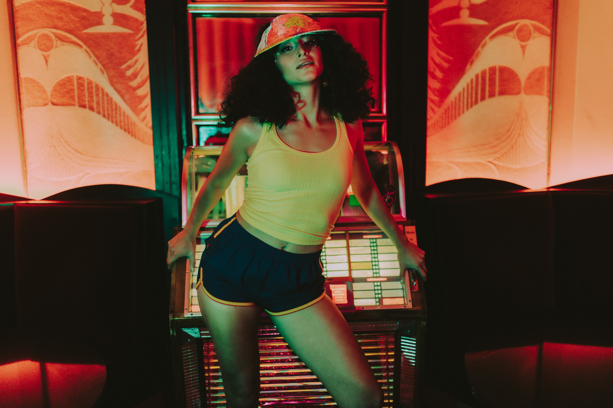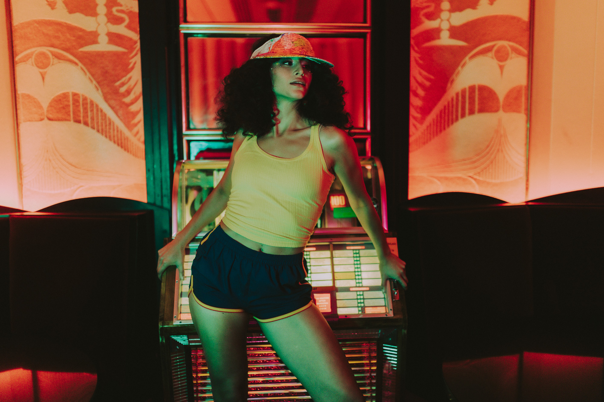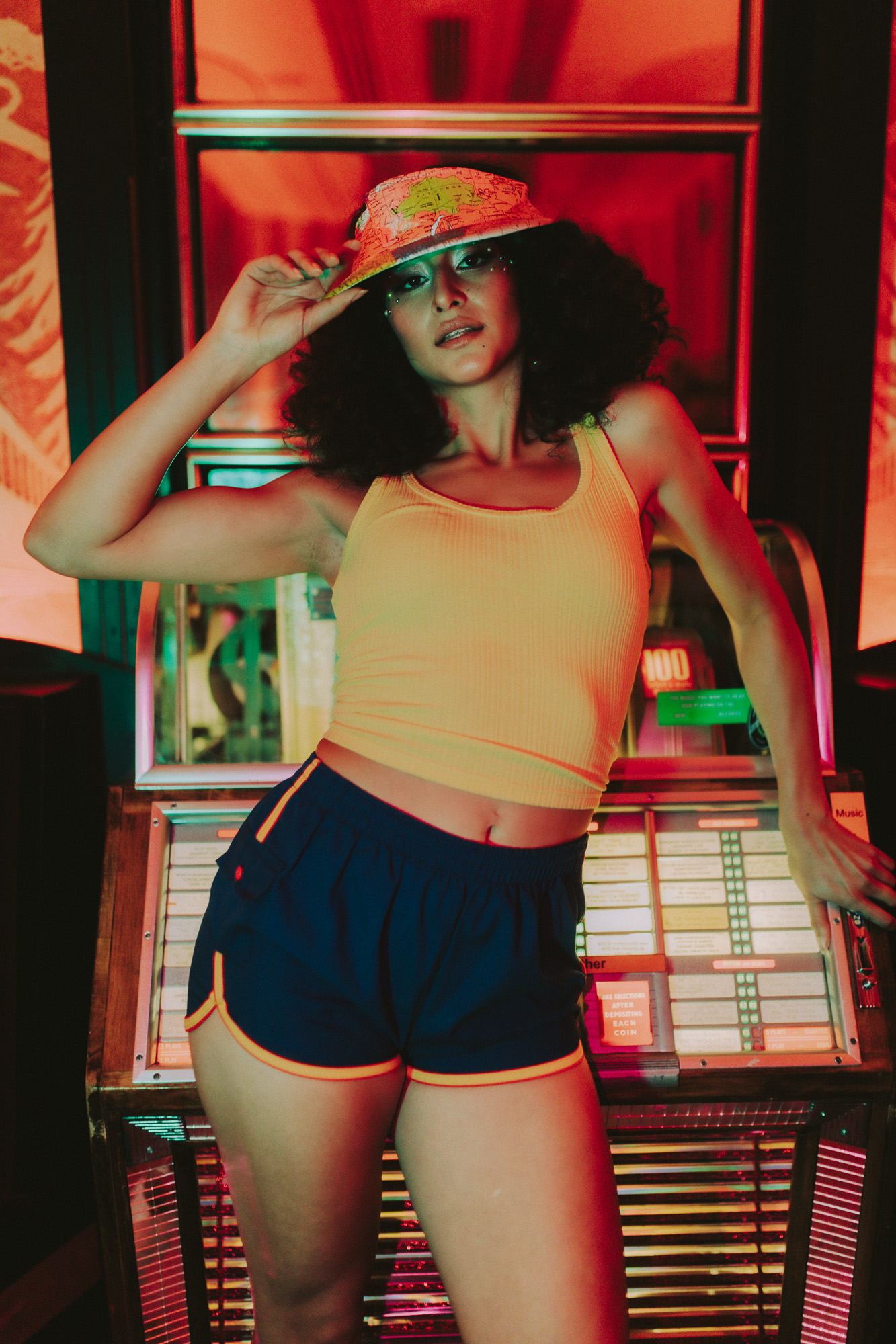 To continue with a retro theme, Delarosa wore a 70’s/80’s inspired roller girl, with a bright neon crop top and shorts, a visor, cherry earrings and of course, a white pair of roller skates.