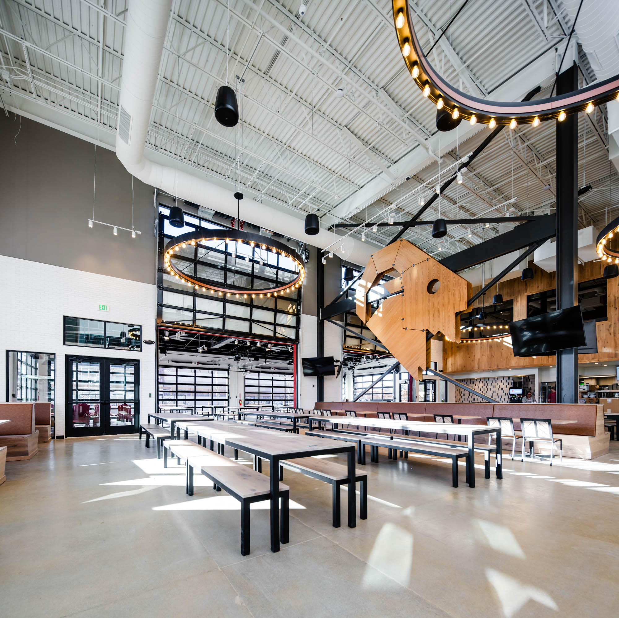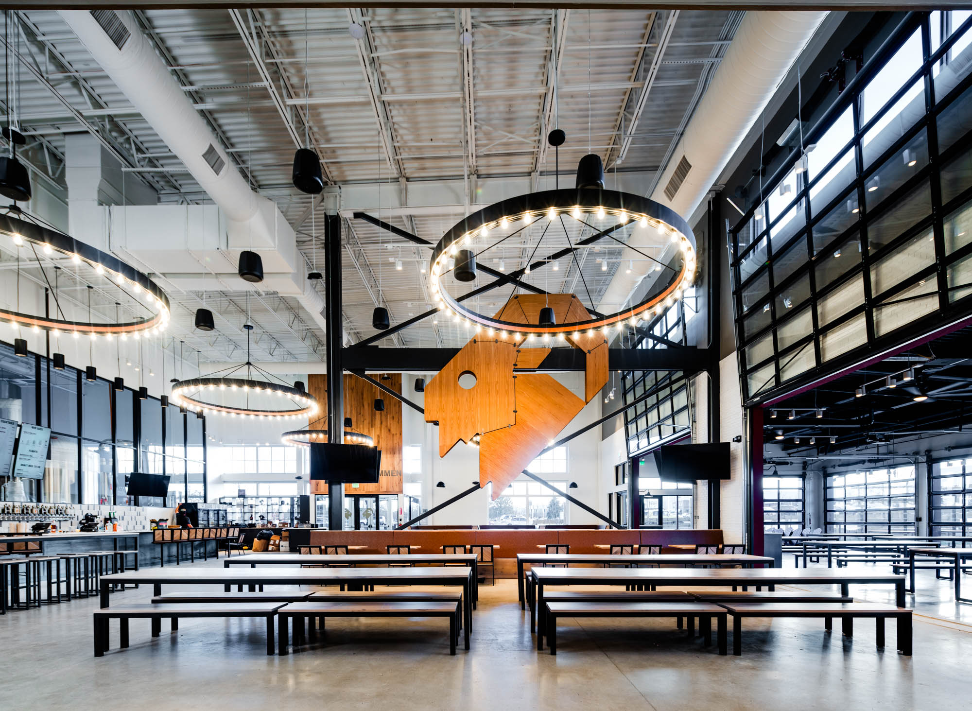 The indoor space blends together traditional German seating with modern industrial design as a reflection of Prost’s 60,00o square foot adjacent headquarters to come. Because of its massive scale, there’s no shortage of seating. “Our vision is a space that is welcoming and accessible for the community to get an authentic taste of Germany in Colorado,” says Prost president David Deline in a recent press release.