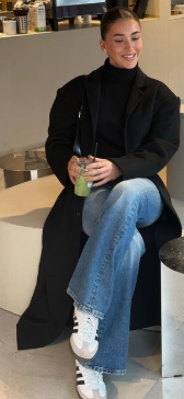 For an office style look, throw on some wide leg jeans and a long trench coat, worn with a white button down, half tucked in, you can tie the outfit up with some pointed heels or boots. Basics are perfect for any closet because you get a variety of uses out of them and can mix and match them for different occasions. This also makes for a chic street style look, typically favored by Hailey Bieber and Kendall Jenner.