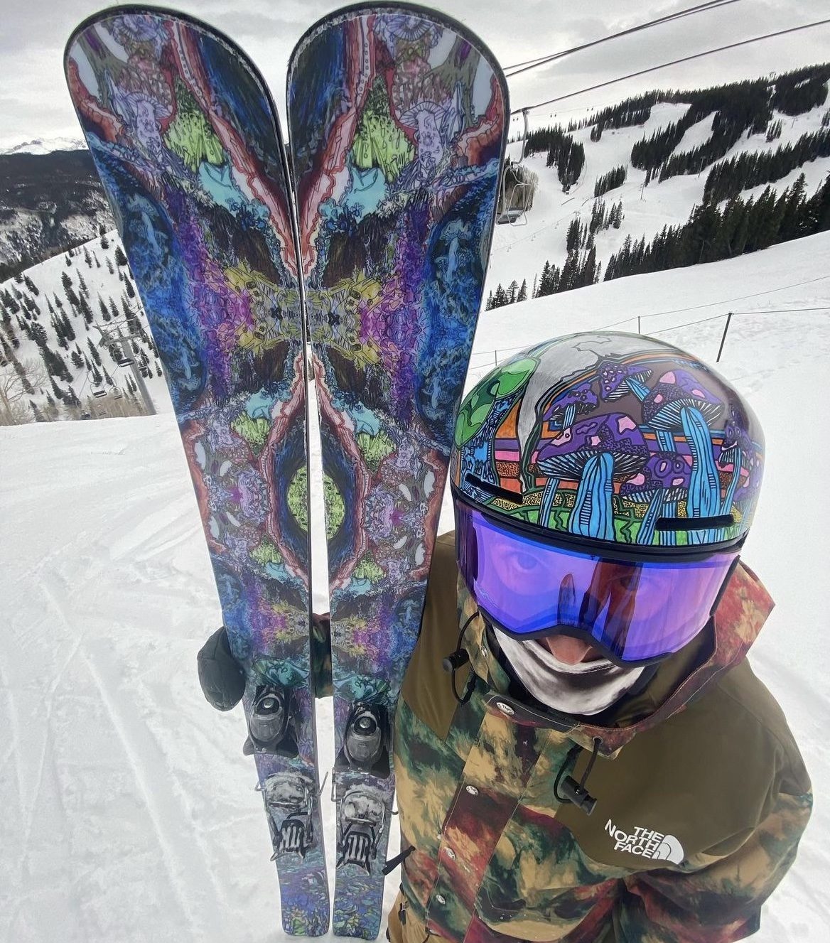 At the intersection of art and skiing, Penton expresses himself through his gear and skiing style. In 2021, he started skiing for Folsom Skis, a custom ski company out of Denver. At Folsom, all the different elements of the ski can be customized, whether that’s the top sheet graphic, the flex pattern, or other materials within the ski. As a sponsored athlete on their team, Penton personally creates the colorful art work on his skis and designs them to cater to his ski style. He also draws on his helmet and buys most of his gear second-hand or at local street-wear type outerwear companies.