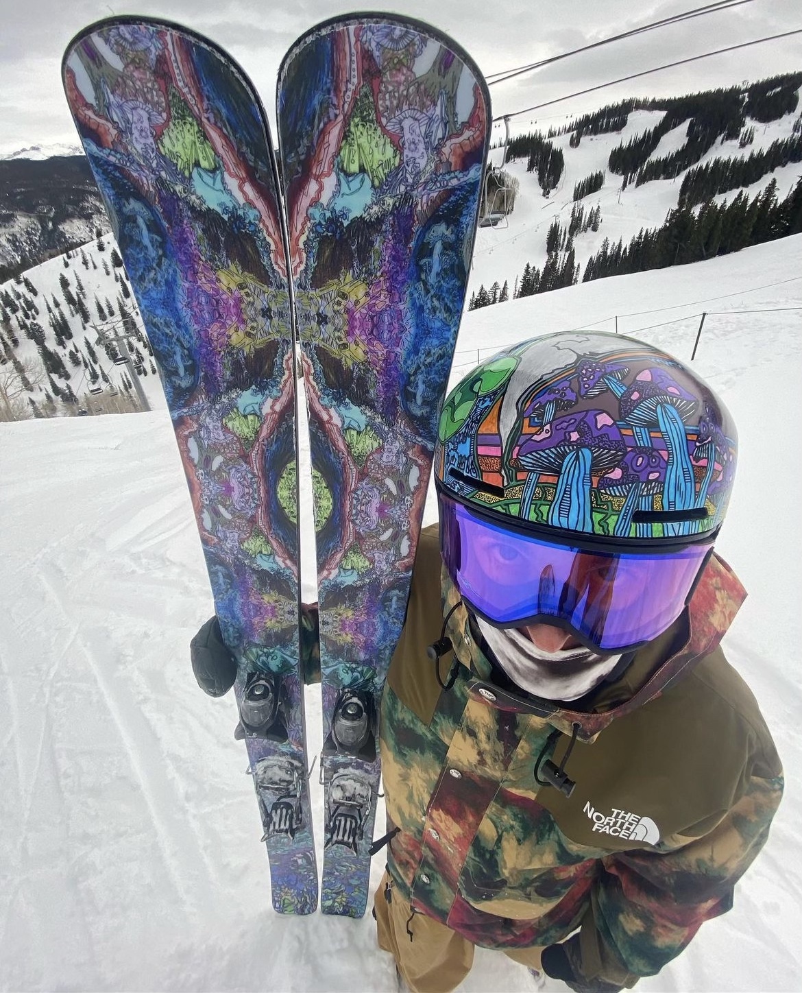 At the intersection of art and skiing, Penton expresses himself through his gear and skiing style. In 2021, he started skiing for Folsom Skis, a custom ski company out of Denver. At Folsom, all the different elements of the ski can be customized, whether that’s the top sheet graphic, the flex pattern, or other materials within the ski. As a sponsored athlete on their team, Penton personally creates the colorful art work on his skis and designs them to cater to his ski style. He also draws on his helmet and buys most of his gear second-hand or at local street-wear type outerwear companies.