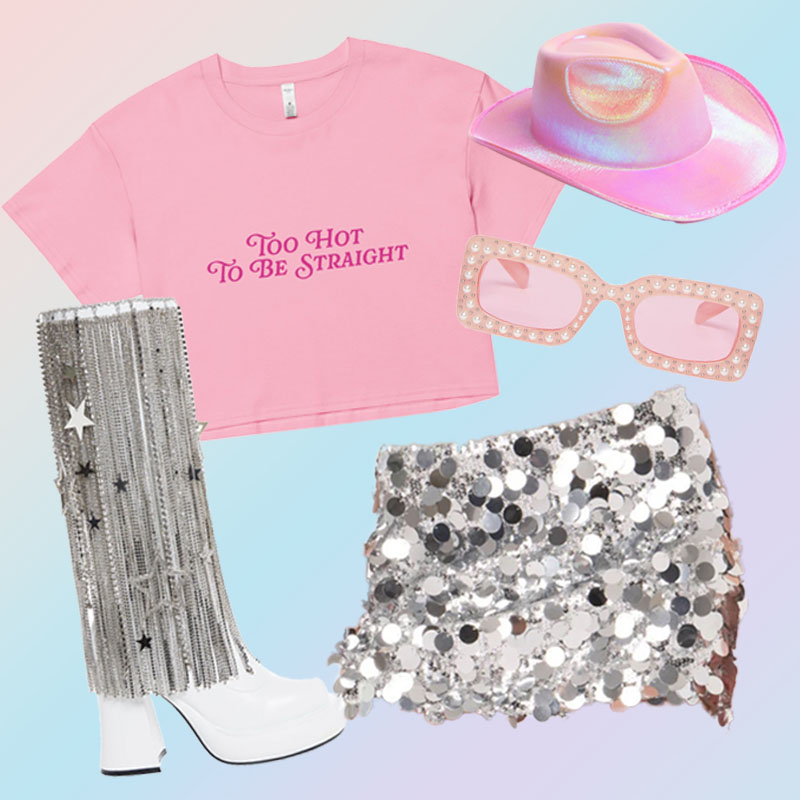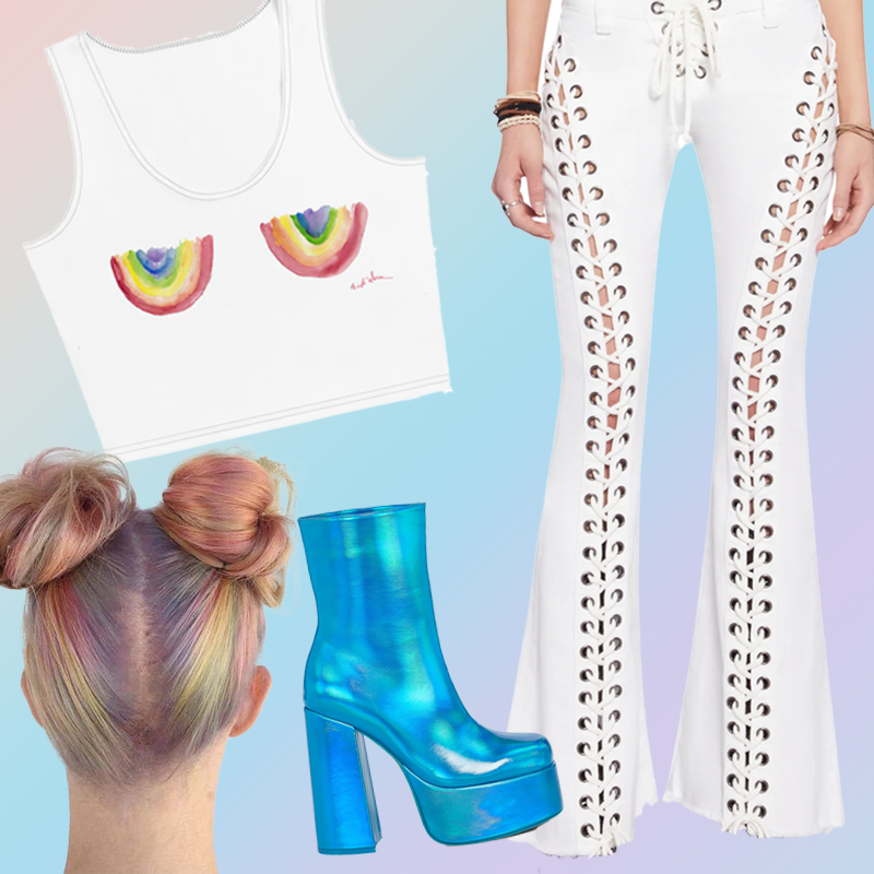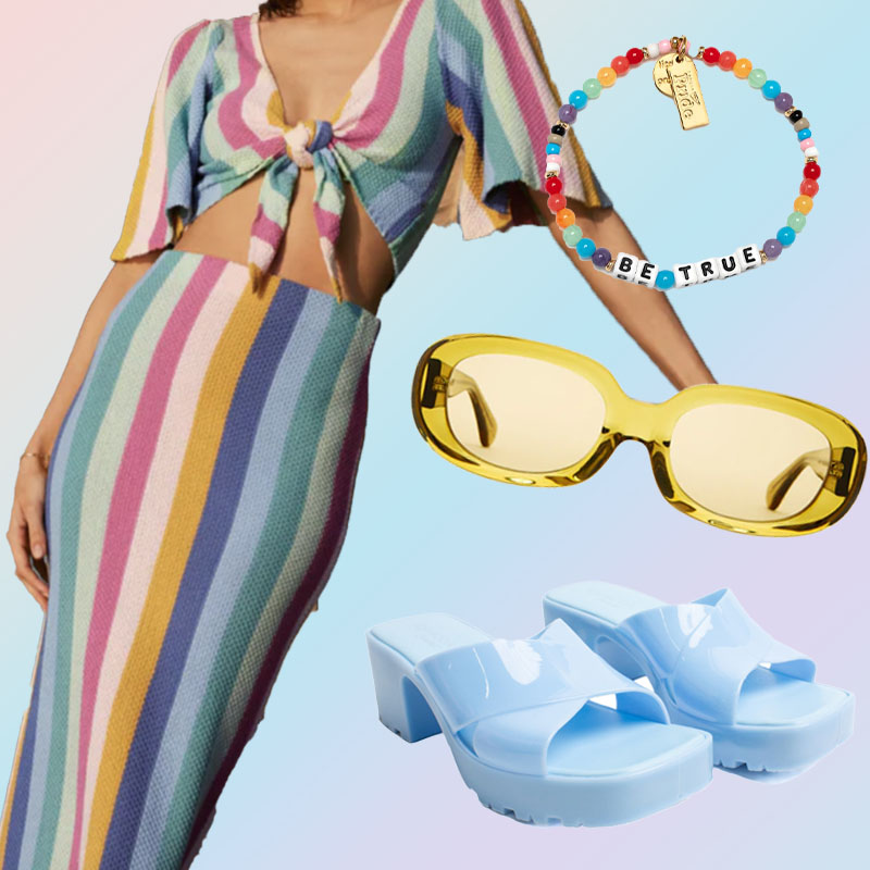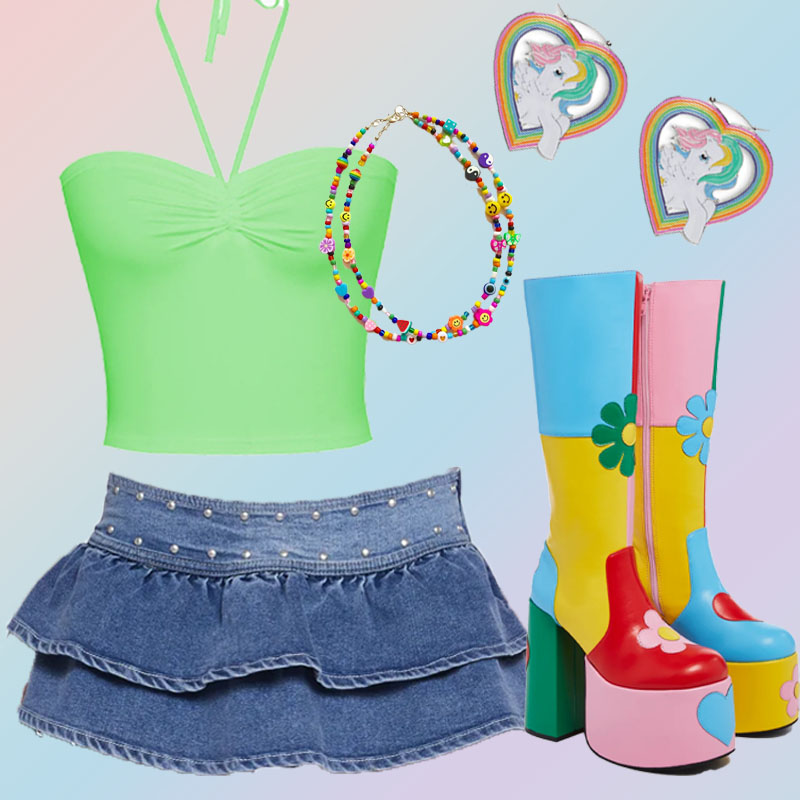 Pride is the time to take out all of those fun, colorful pieces in your wardrobe and experiment with your look. Create a Y2K inspired look with a mini skirt, platform boots and chunky earrings.