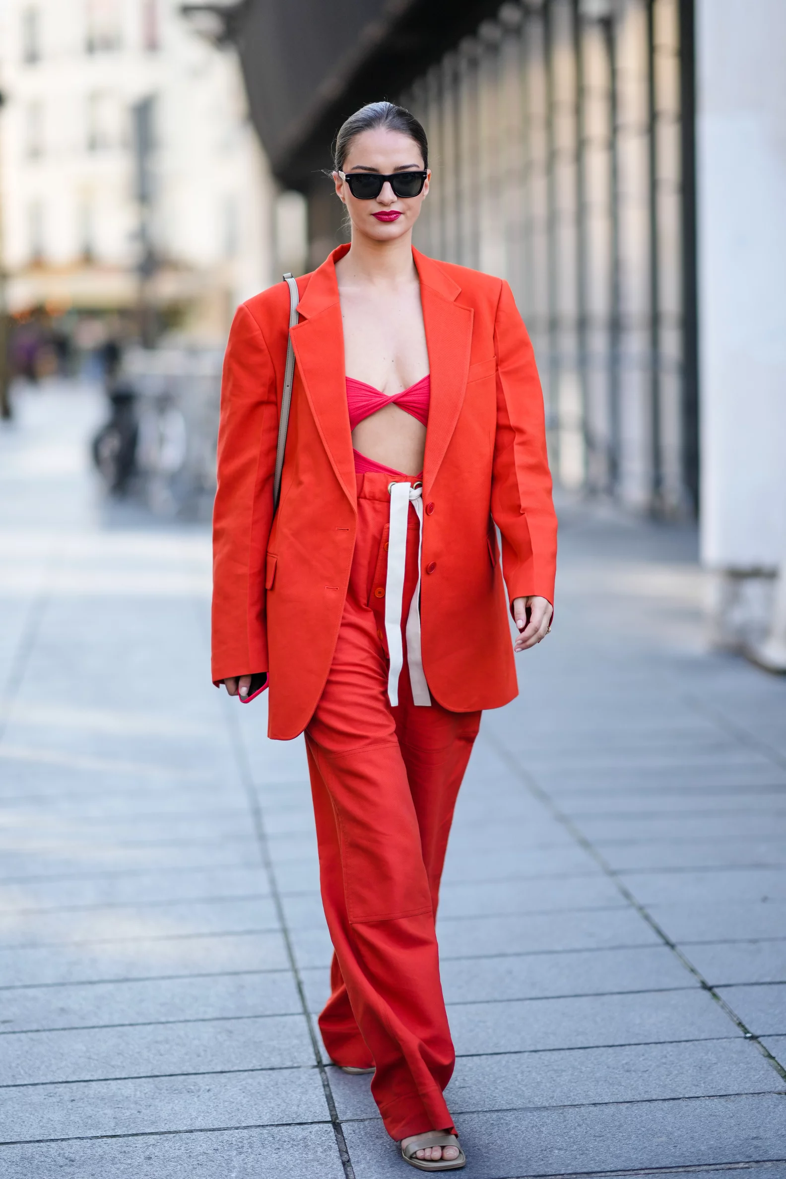 Start by pairing a classic white blouse with navy blue trousers for a timeless and polished aesthetic. To inject a touch of color into your outfit add red shoes or a bold red belt that adds a vibrant contrast to the overall look.