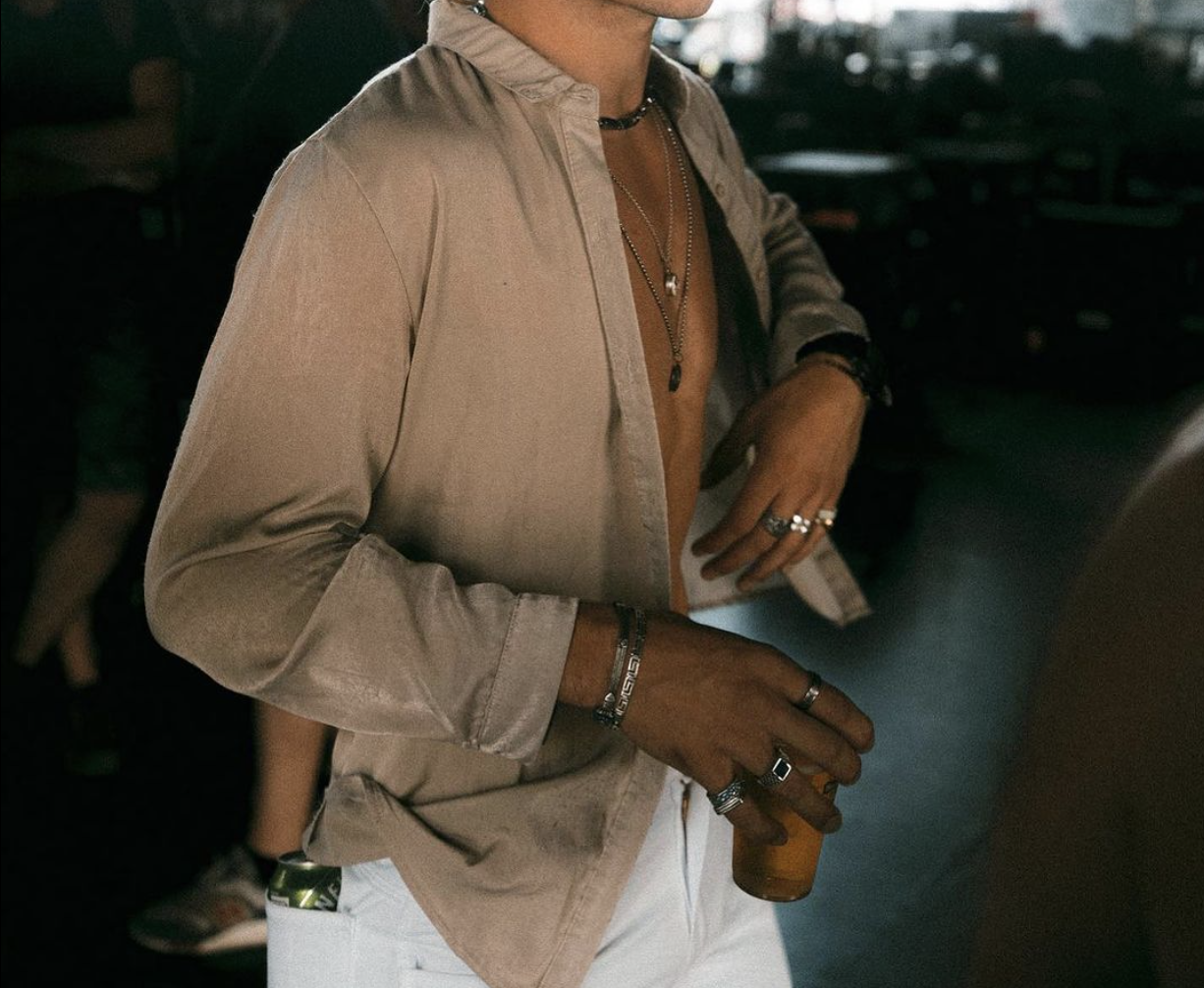 He’s also a fan of the occasional loose, free-flowing button down — mostly, if not completely, unbuttoned or over an aforementioned fitted top for a layered look.