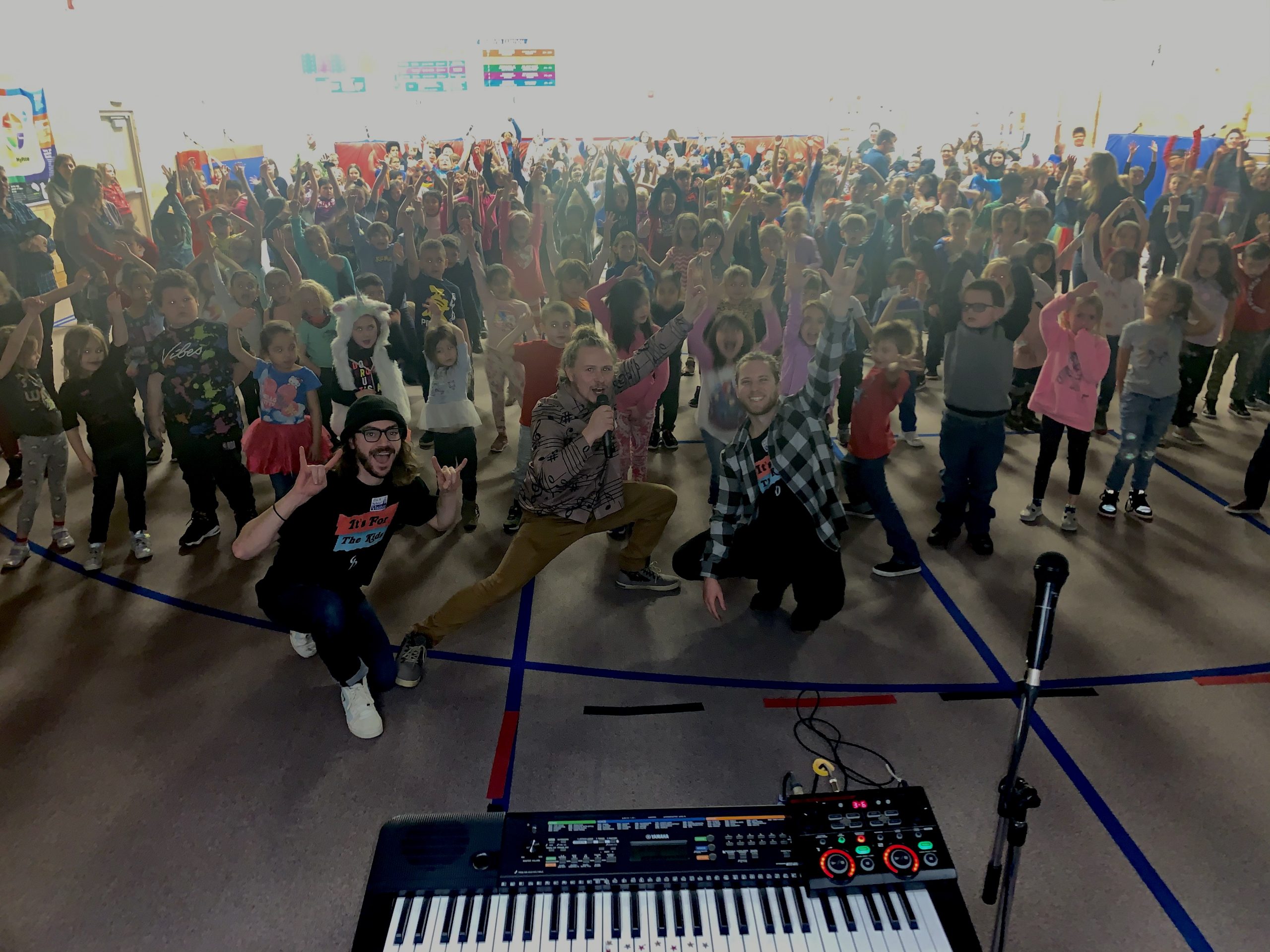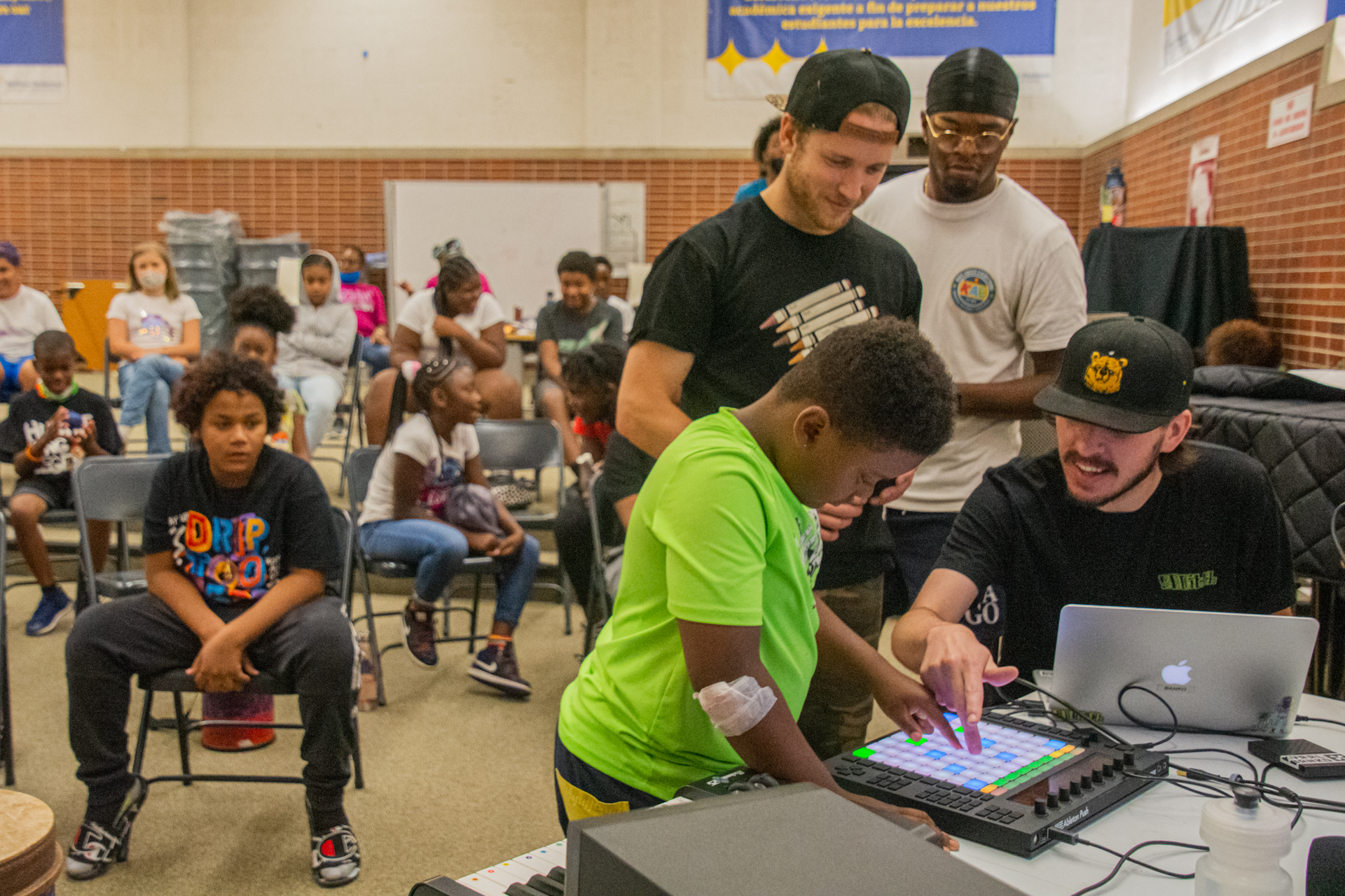 Basically, we’re making a beat out of the sounds of the environment, whether that’s somebody’s keys, a chair in the school, the pencil sharpeners, or whatever. It’s very much based on the space we’re in and we make a beat out of that. We have all these instruments so then we add melodies to the beat. We create these layers, and with each new layer, we invite someone up. We’re empowering them to create. We’re being silly and trying to lower the barriers of expression through our empowerment practices. “Alright, everybody, come on up.” We get to a point where we’ve found the groove and everybody’s got the rhythm and “chicken neckin’,” as we call it. “All right, now come up and play an instrument” and eventually, we’re looping. We have Ableton up on the screen. We’re like, “Now, here’s your piano melody. Now, watch us pick the part. What part do you like, Oh, you like this part. All right, great. We’re gonna loop this, check this out.” We loop it out, and then they can see it. “All right, now let’s add another instrument.” Someone comes up. We do stuff to it. Now we have an instrumental. Now, we have our beats and melodies. “Okay, now let’s write a hook together.” And we all write a hook. Everybody sings it. Everyone gets on the track, hundreds of kids all singing whatever they come up with.